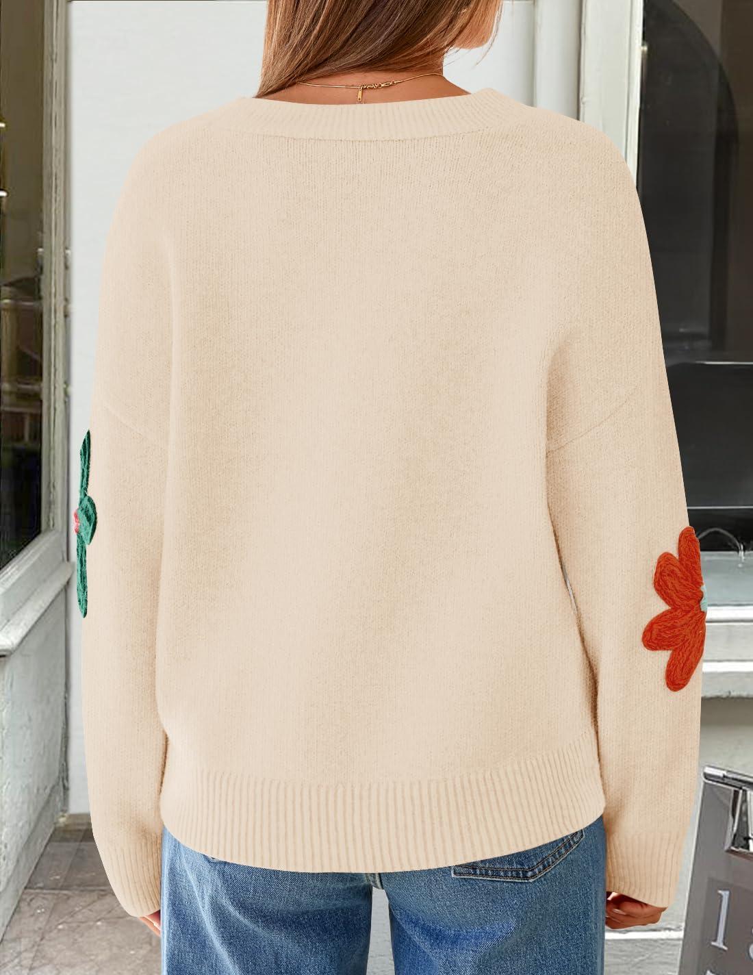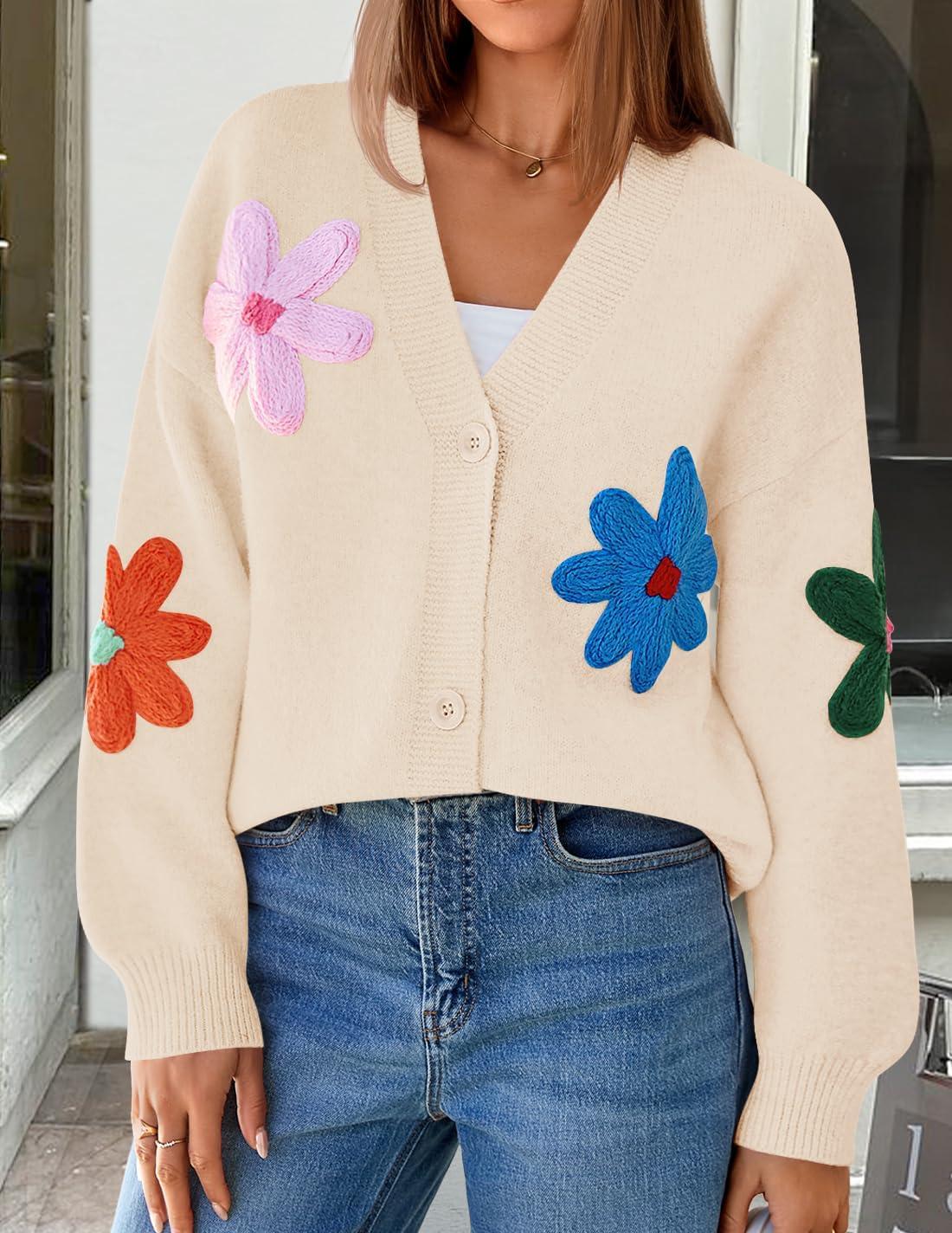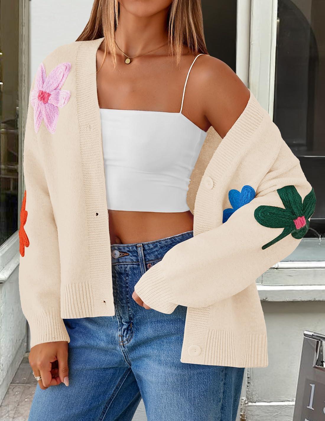 ZESICA Womens Fall Floral Cardigan Sweaters 2025 Casual Long Sleeve Open Front Button Down V Neck Knit Sweater(Apricot)