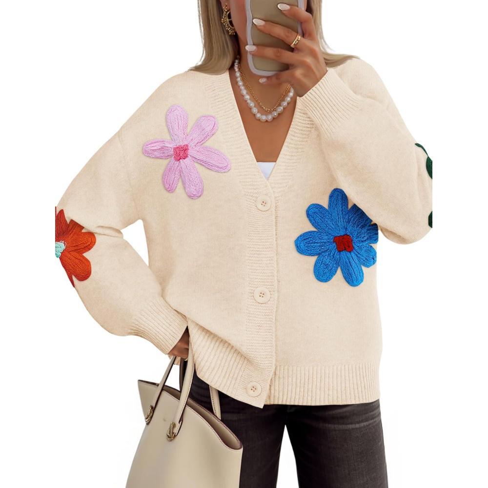 imageZESICA Womens Fall Floral Cardigan Sweaters 2025 Casual Long Sleeve Open Front Button Down V Neck Knit SweaterApricot