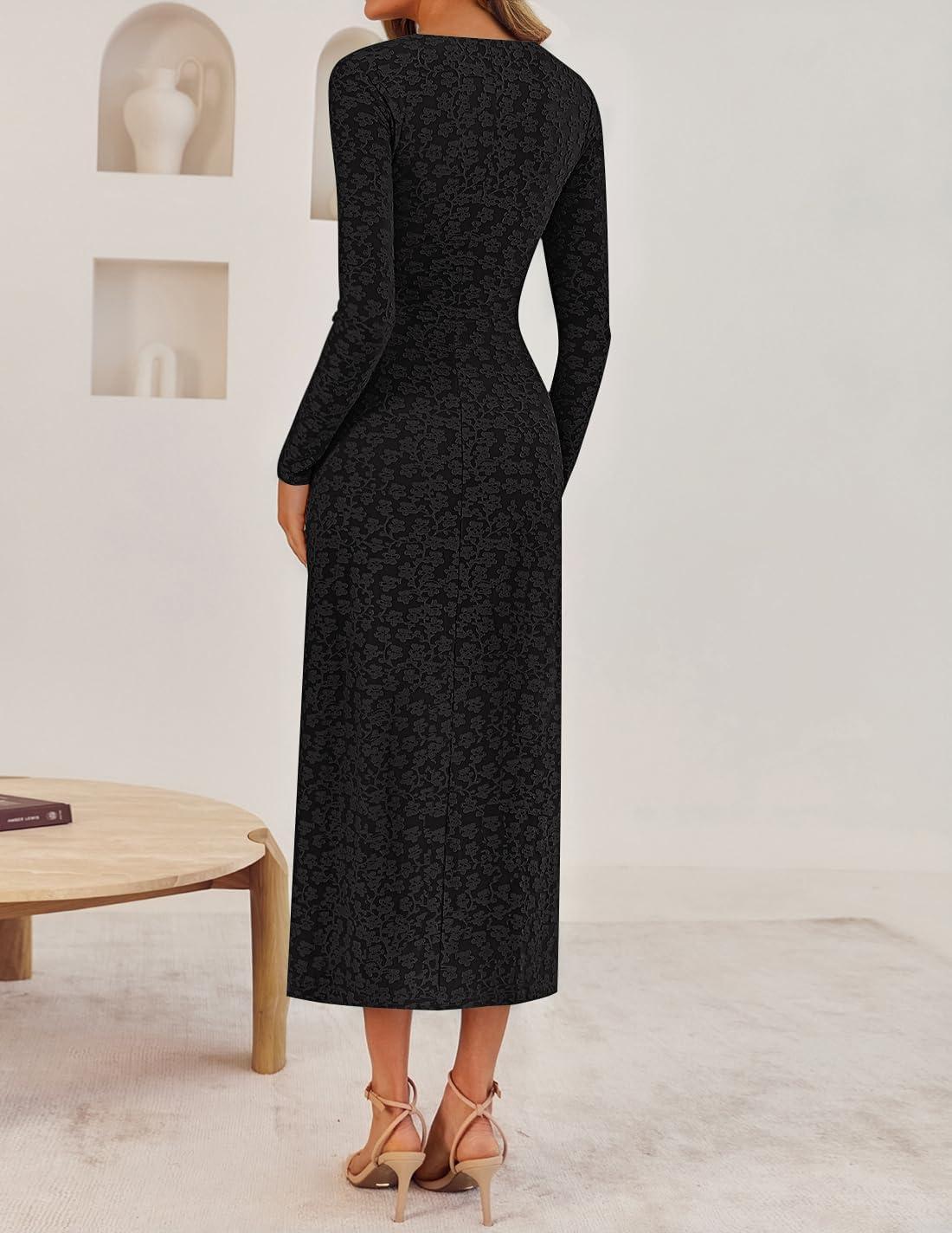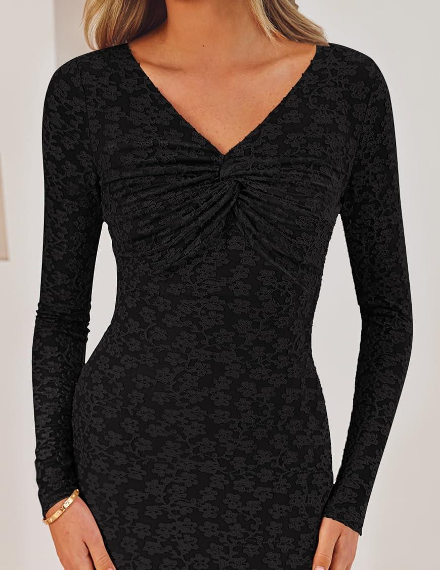 ZESICA Women’s Fall Floral Long Sleeve Bodycon Dress 2025 Elegant V Neck Cocktail Party Long Midi Dresses(Black)