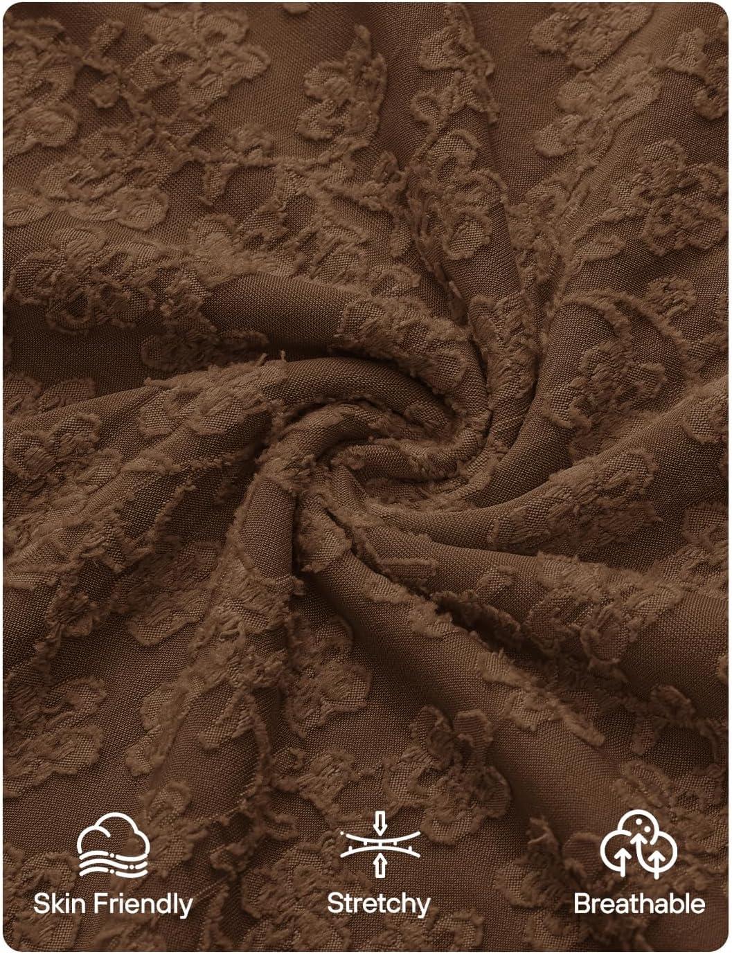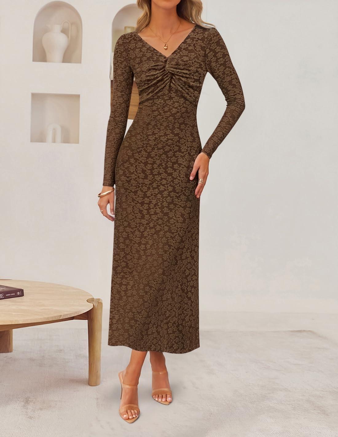 ZESICA Women’s Fall Floral Long Sleeve Bodycon Dress 2025 Elegant V Neck Cocktail Party Long Midi Dresses(Brown)