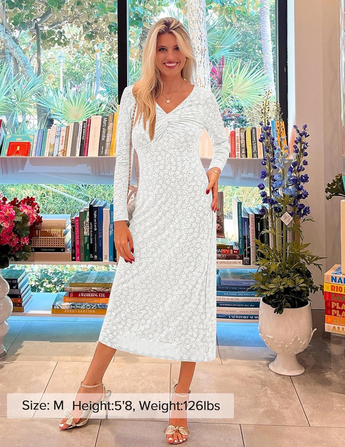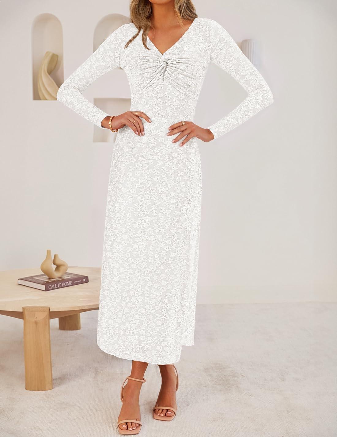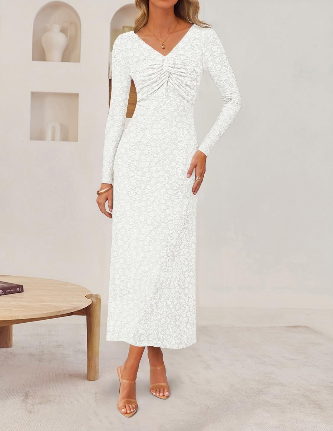 ZESICA Women’s Fall Floral Long Sleeve Bodycon Dress 2025 Elegant V Neck Cocktail Party Long Midi Dresses(White)
