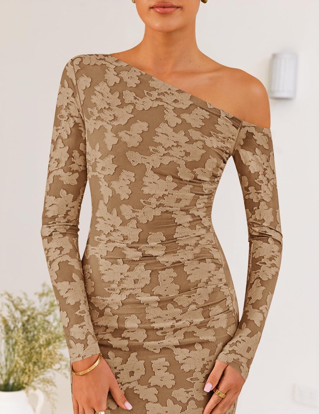 ZESICA Women’s Fall Floral Off Shoulder Bodycon Maxi Dresses 2025 Long Sleeve Ruched Elegant Cocktail Party Dress(Khaki)