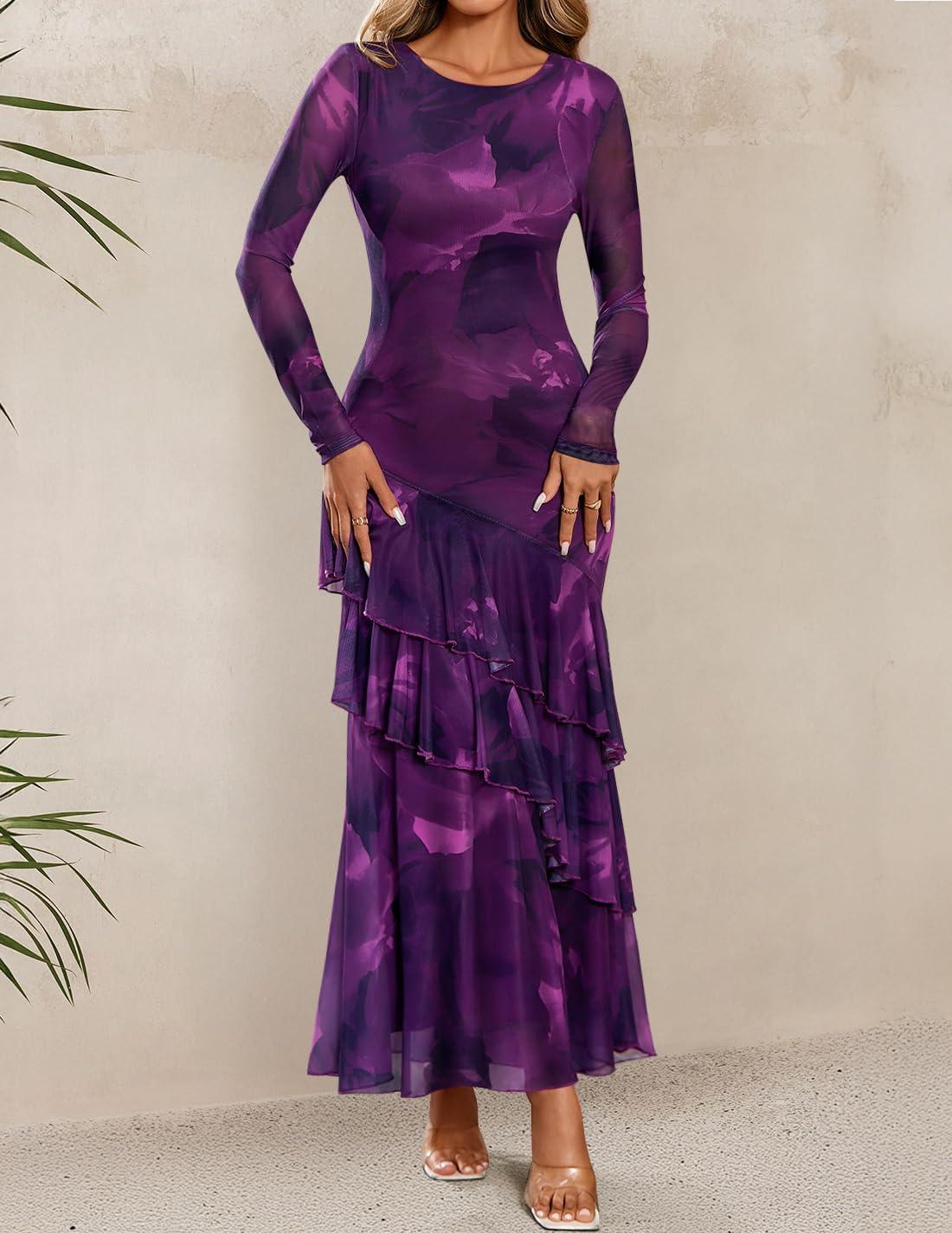 ZESICA Women’s Fall Floral Wedding Guest Bodycon Dresses 2025 Long Sleeve Crewneck Mesh Ruffle Mermaid Party Maxi Dress(Purple)