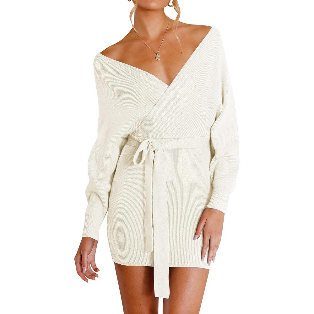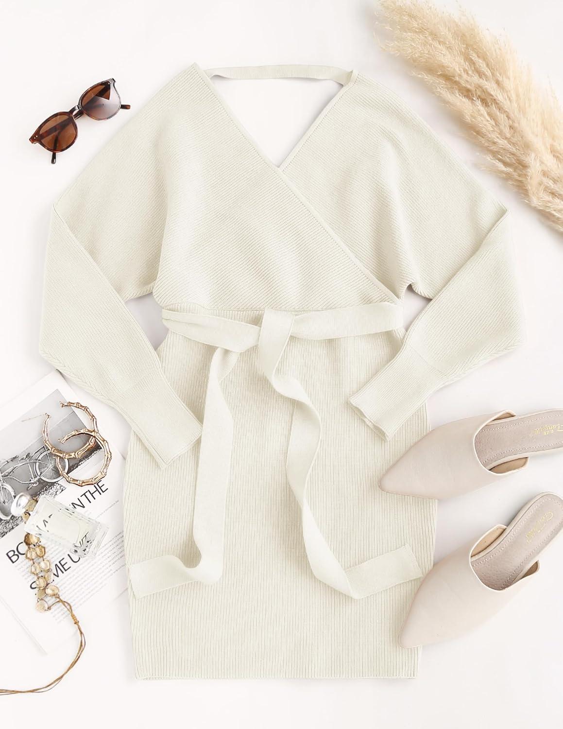 imageZESICA Womens Fall Long Batwing Sleeve Wrap V Neck Knitted Backless Bodycon Pullover Sweater Dress with BeltApricot