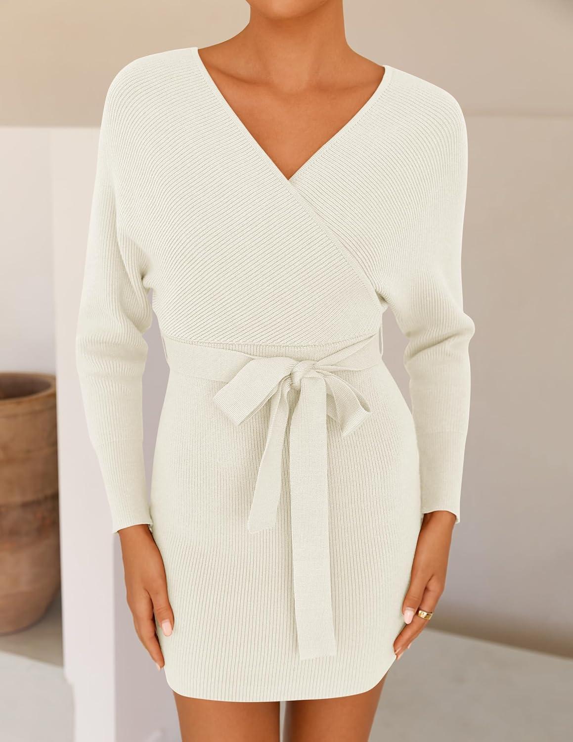 ZESICA Women’s Fall Long Batwing Sleeve Wrap V Neck Knitted Backless Bodycon Pullover Sweater Dress with Belt(Apricot)