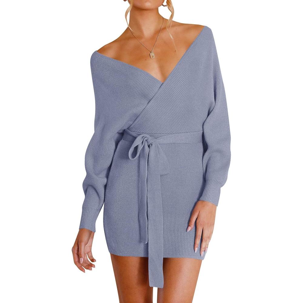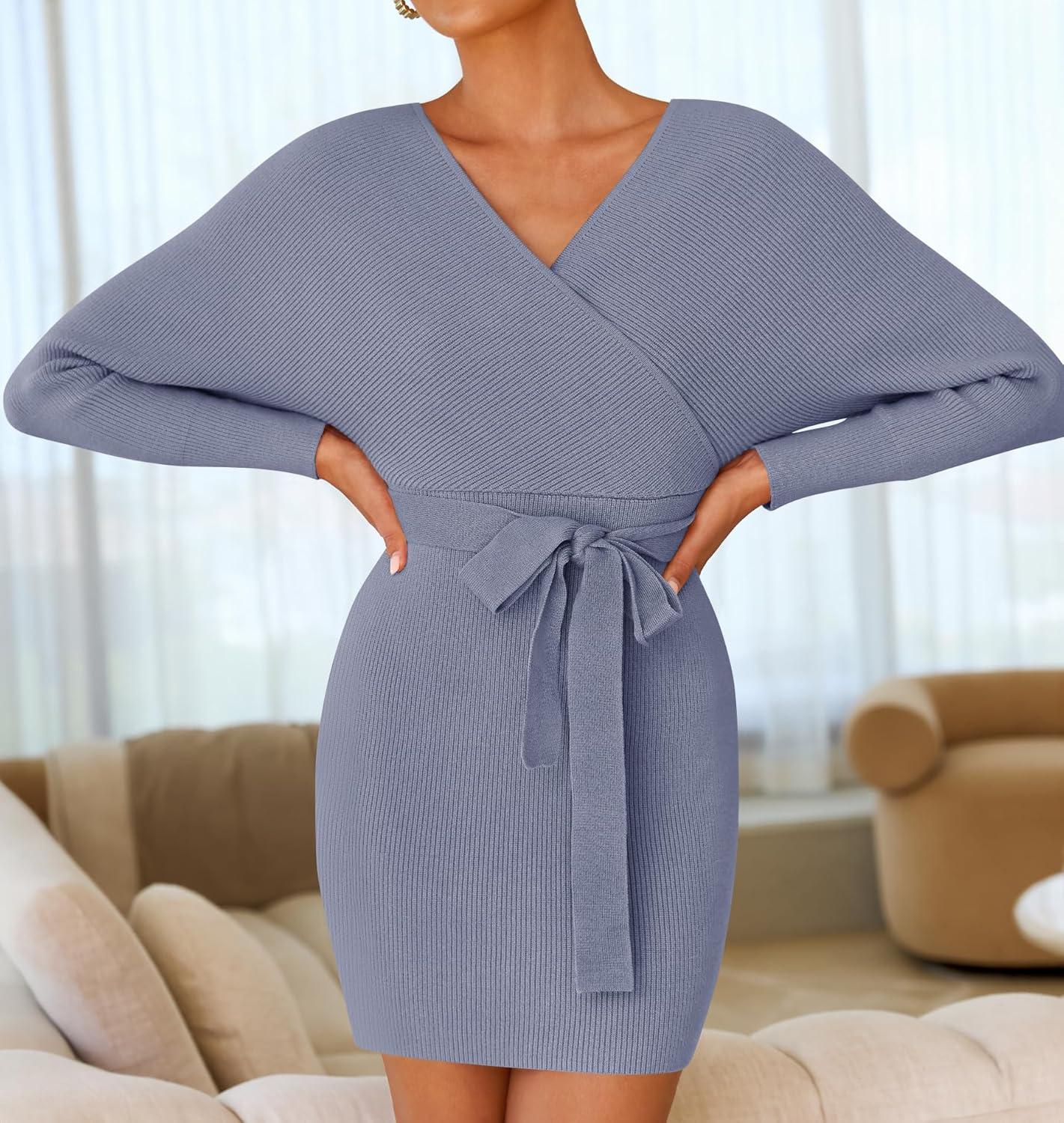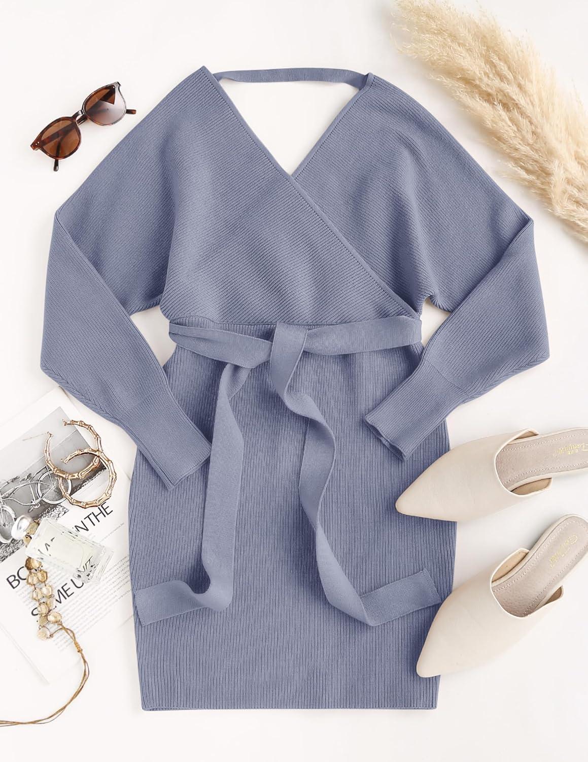 ZESICA Women’s Fall Long Batwing Sleeve Wrap V Neck Knitted Backless Bodycon Pullover Sweater Dress with Belt(Blue)