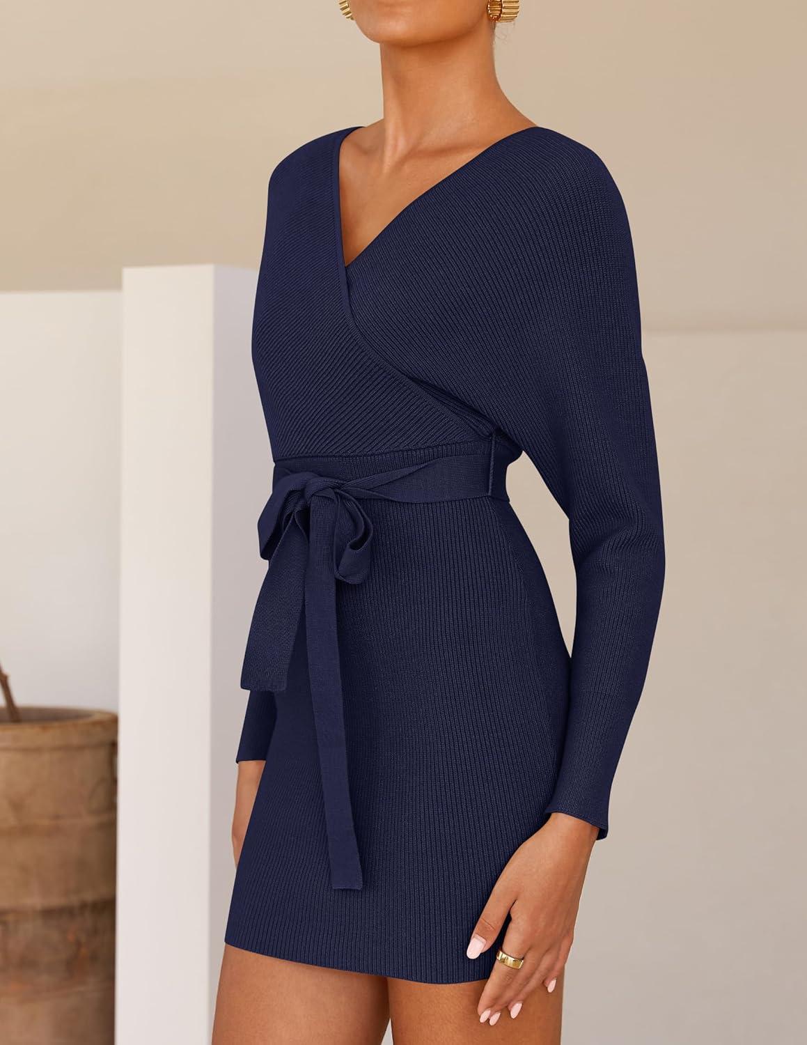 ZESICA Women’s Fall Long Batwing Sleeve Wrap V Neck Knitted Backless Bodycon Pullover Sweater Dress with Belt(Navy)