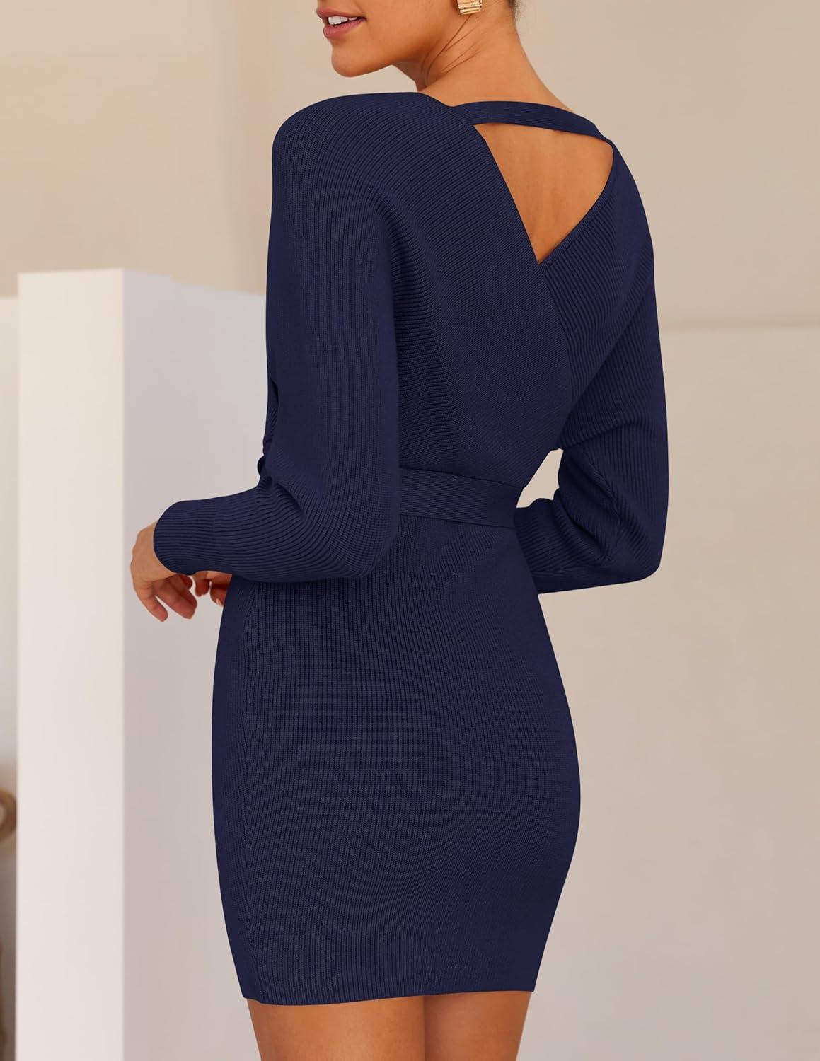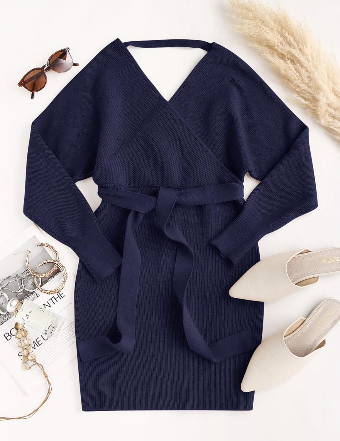 imageZESICA Womens Fall Long Batwing Sleeve Wrap V Neck Knitted Backless Bodycon Pullover Sweater Dress with BeltNavy