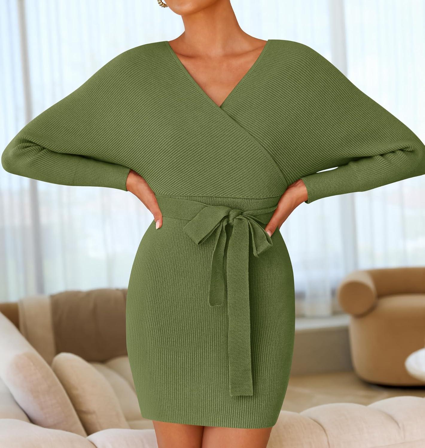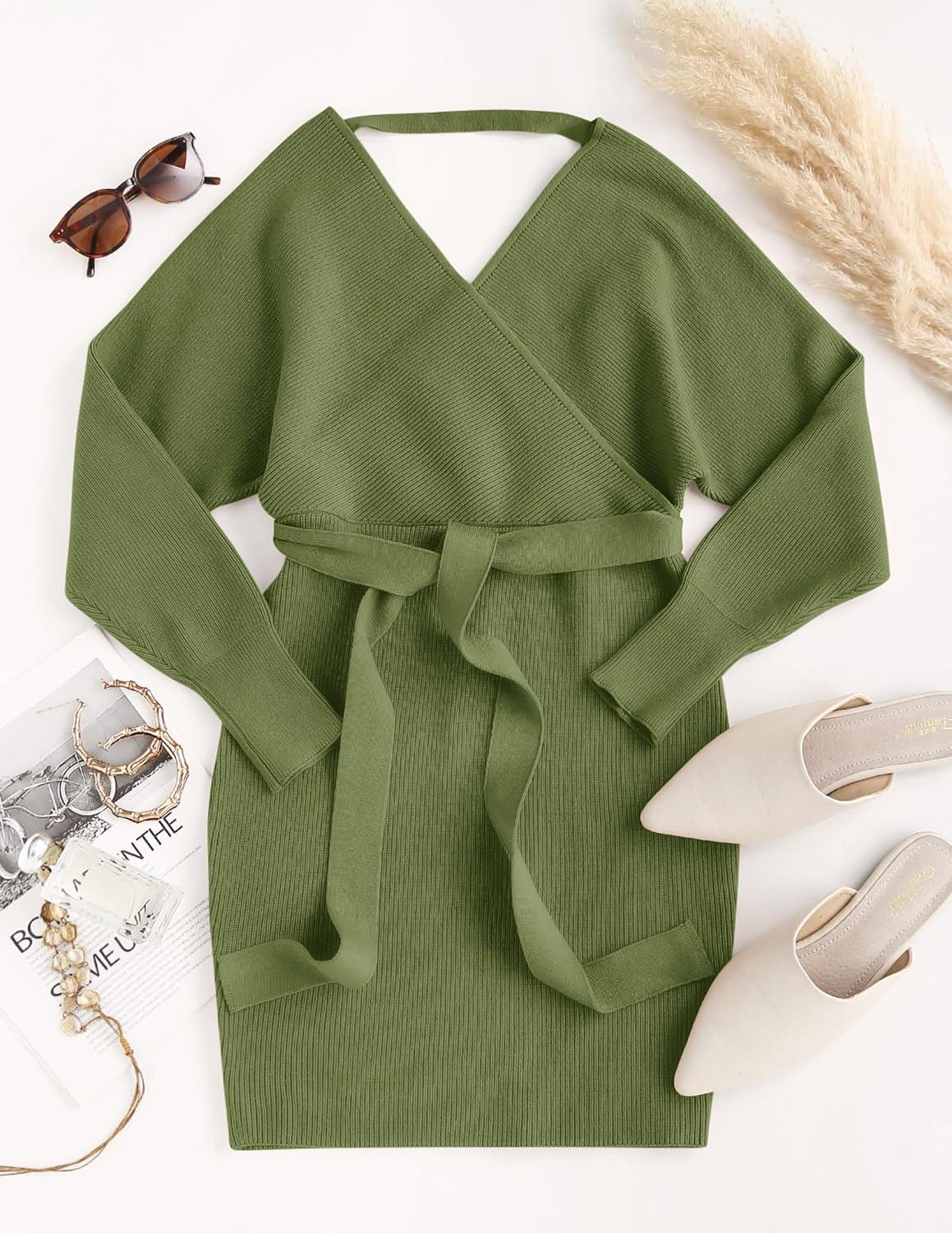 Get more for your money with our exclusive bundle deals on ZESICA Women’s Fall Long Batwing Sleeve Wrap V Neck Knitted Backless Bodycon Pullover Sweater Dress with Belt(Olive) and accessories.