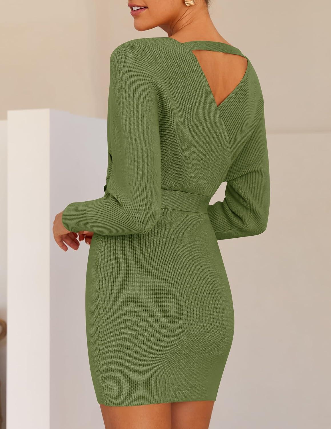 ZESICA Women’s Fall Long Batwing Sleeve Wrap V Neck Knitted Backless Bodycon Pullover Sweater Dress with Belt(Olive)