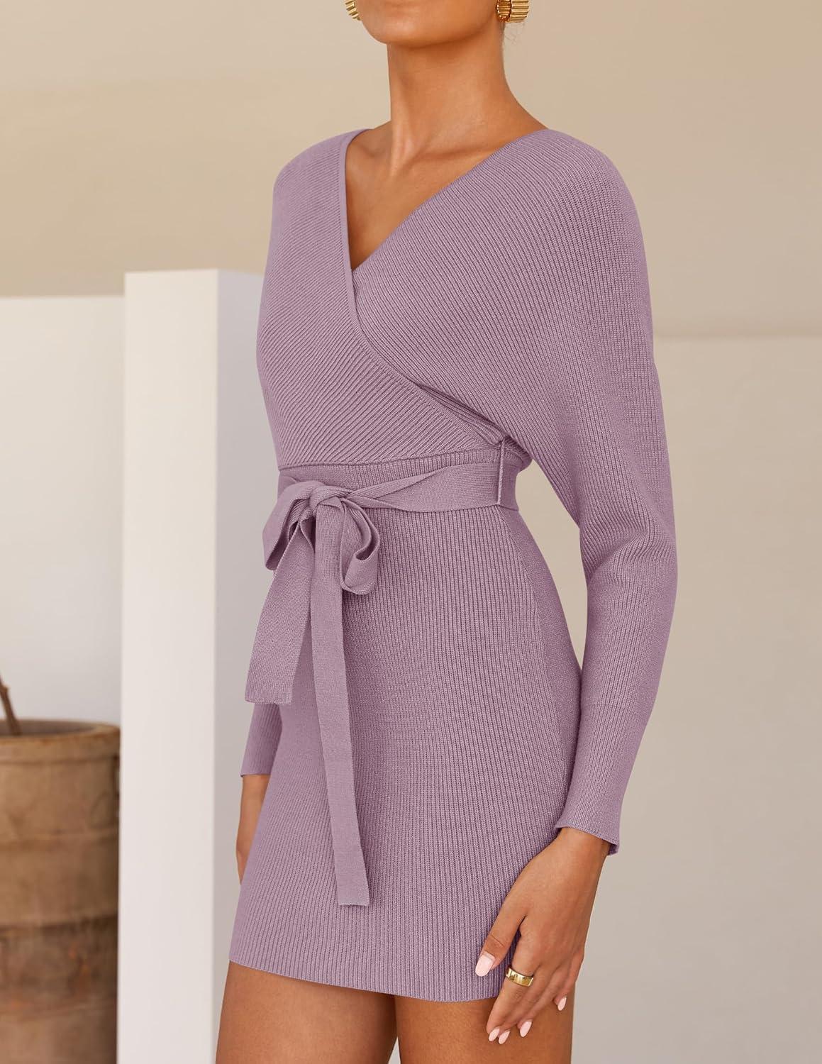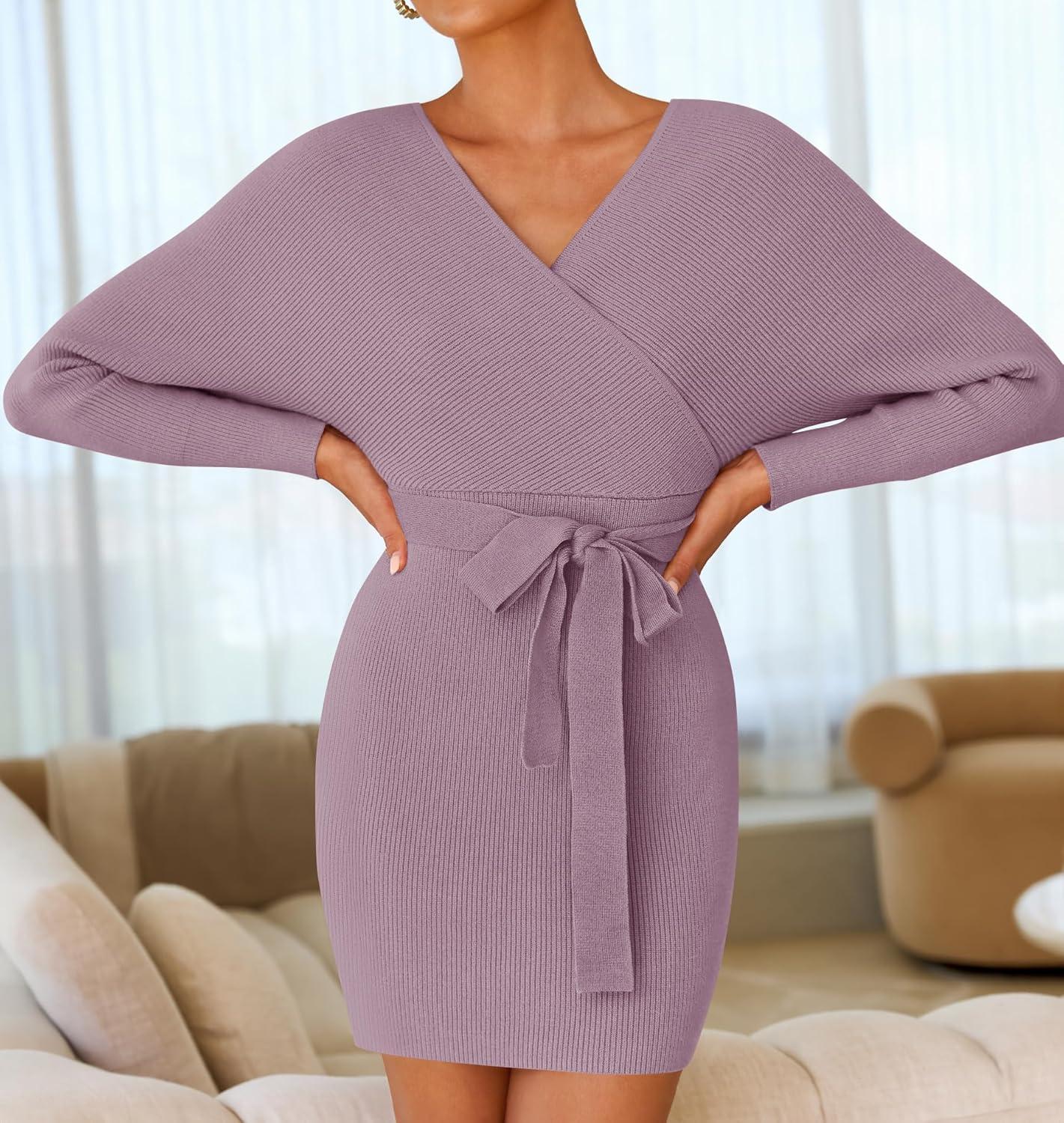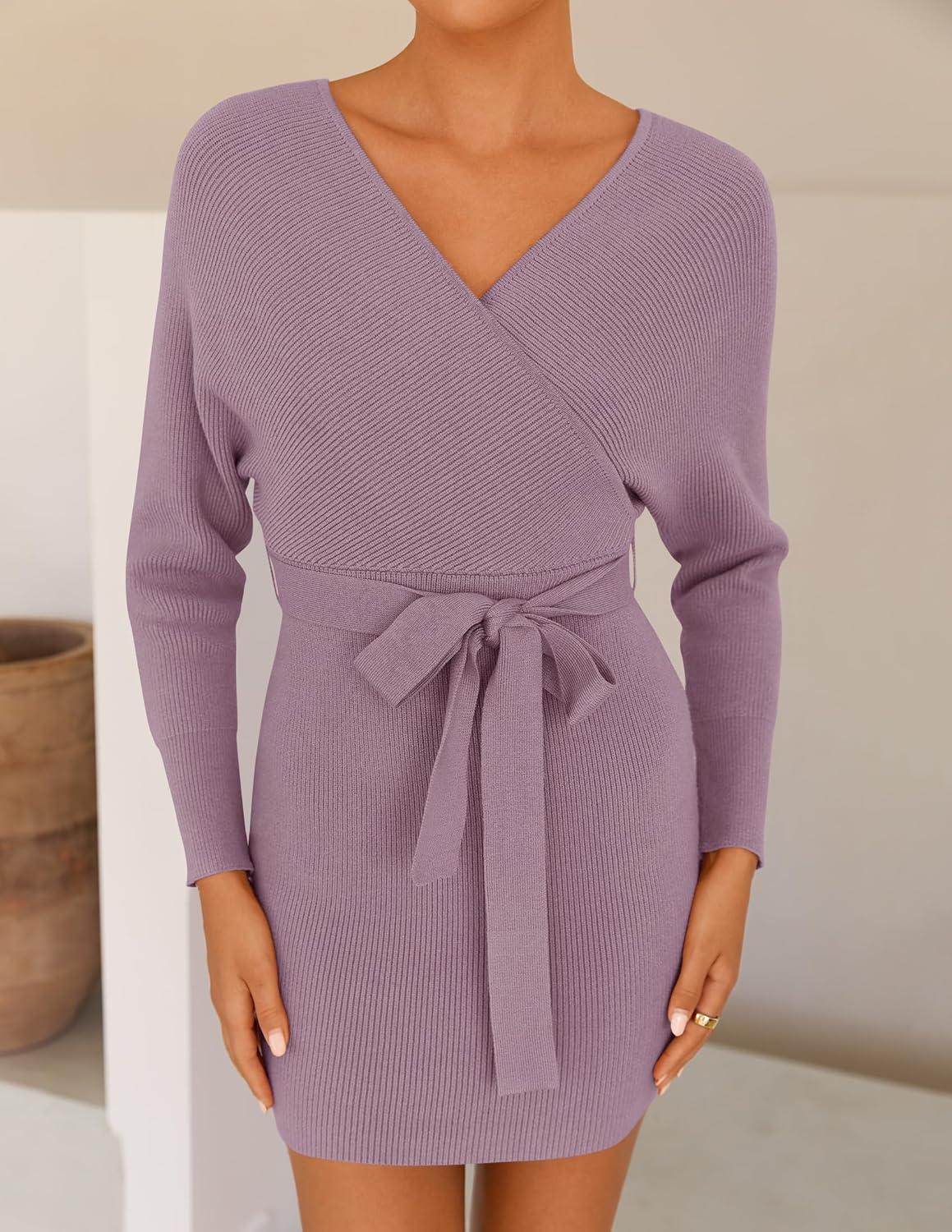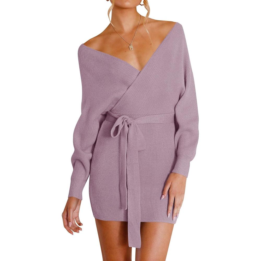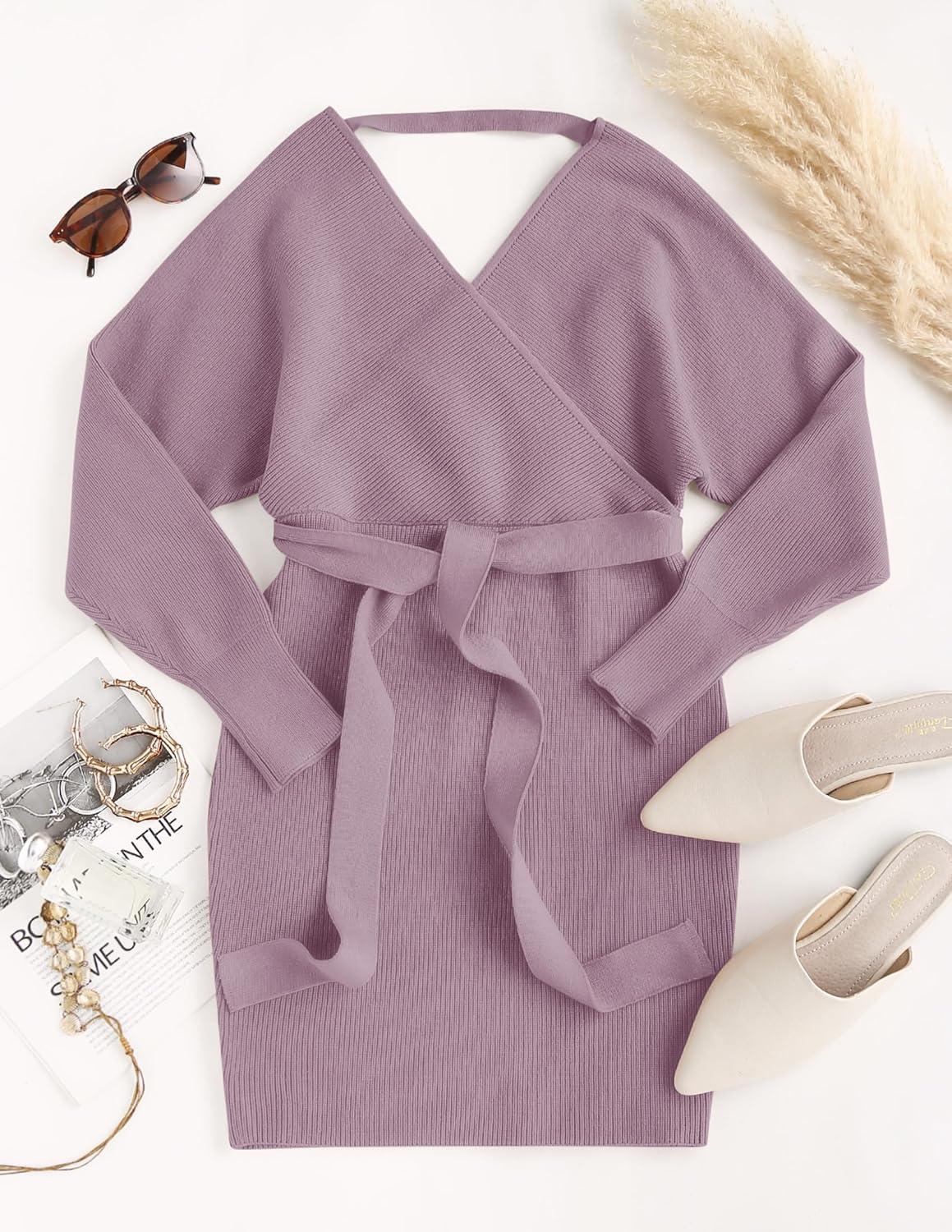 Get up to 60% off on ZESICA Women’s Fall Long Batwing Sleeve Wrap V Neck Knitted Backless Bodycon Pullover Sweater Dress with Belt(Purple) styles during our winter sale event.