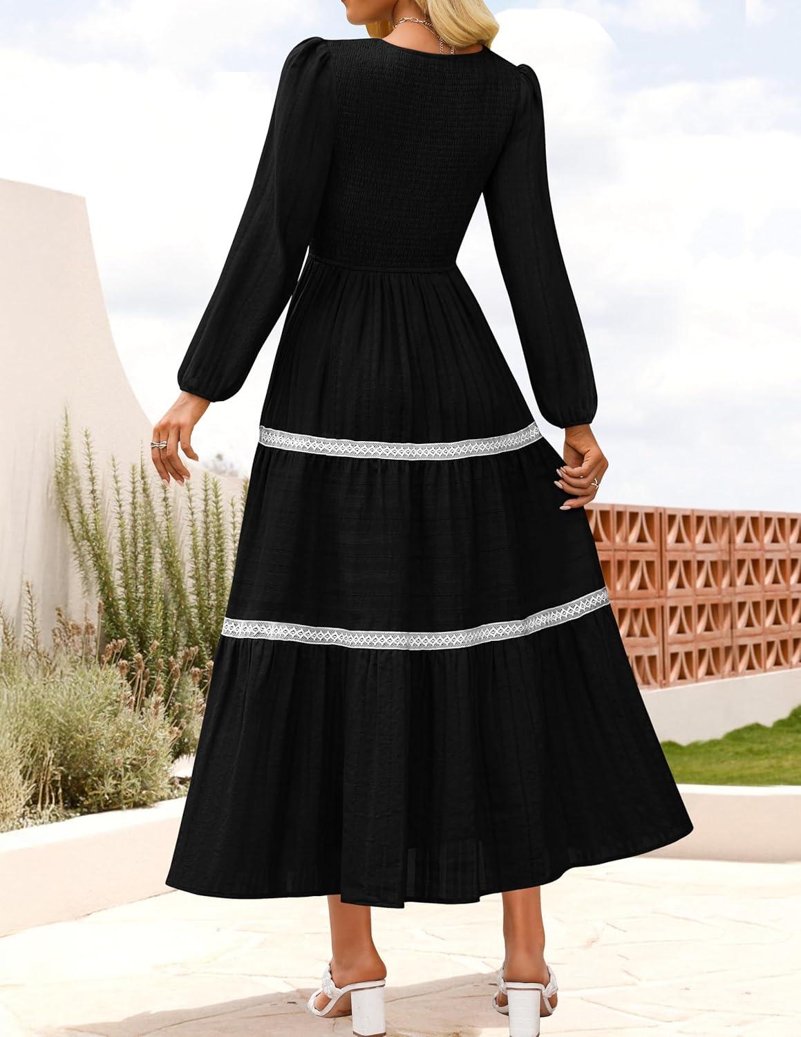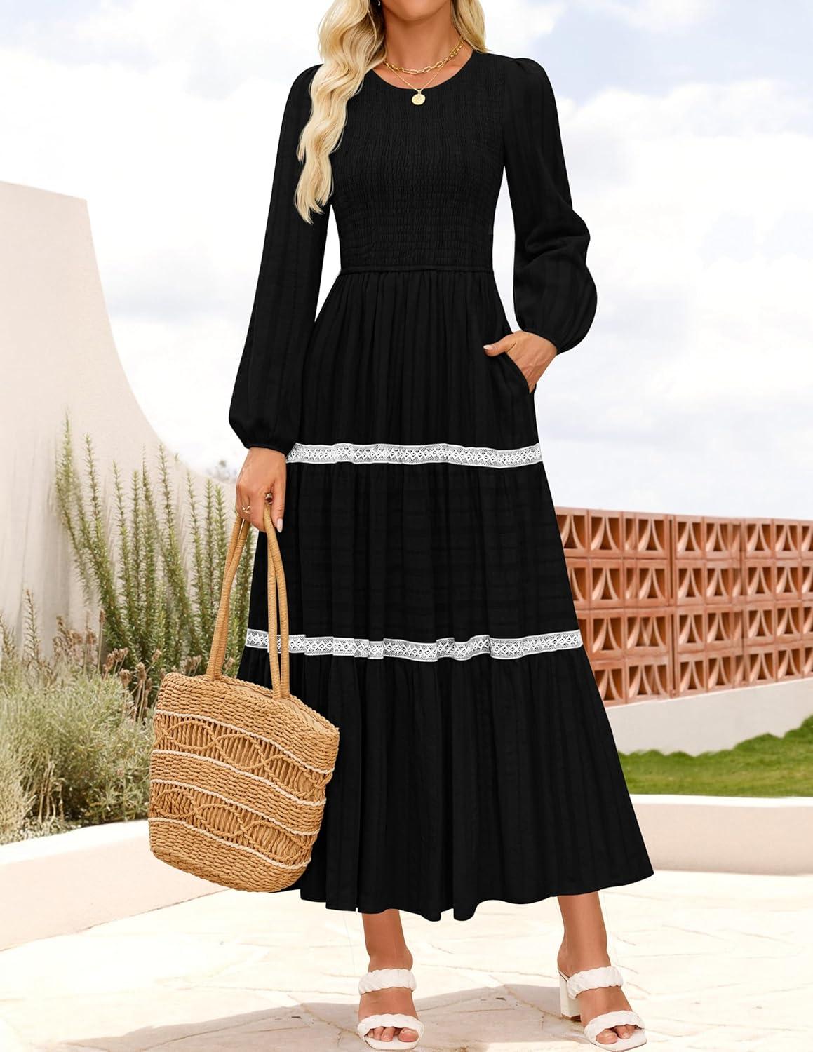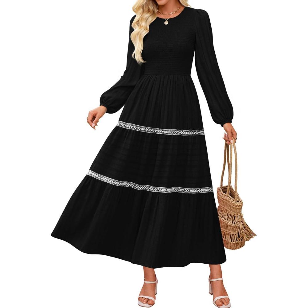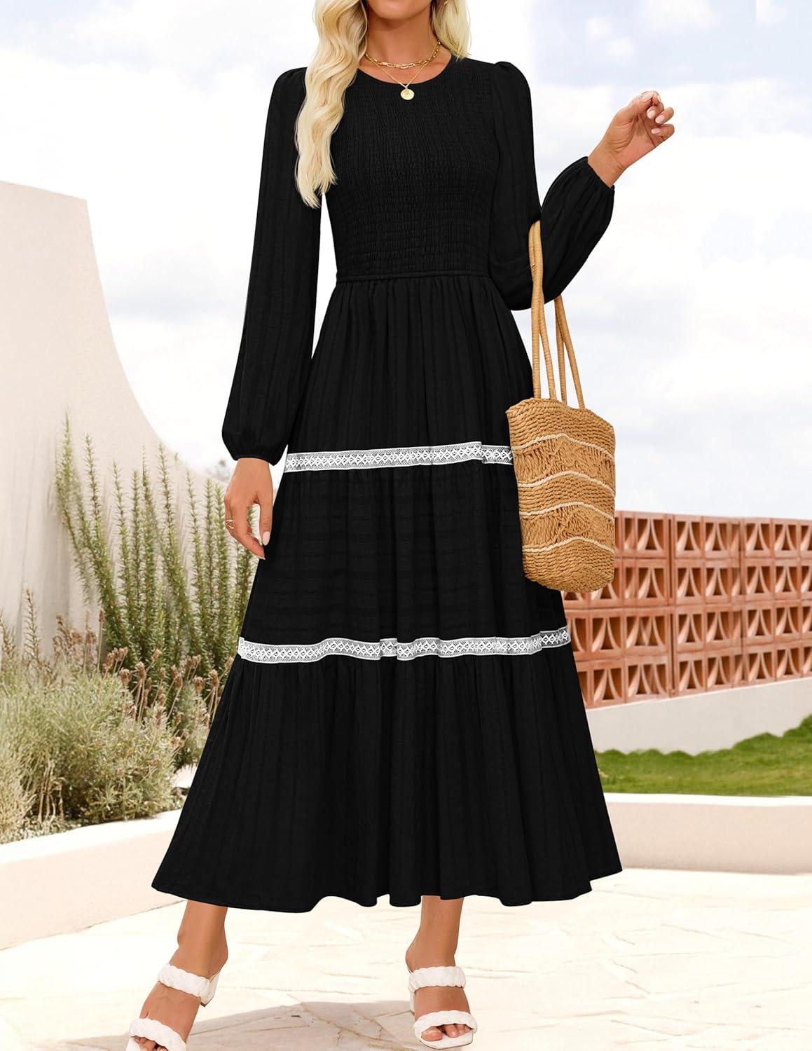 ZESICA Women's Fall Long Sleeve Maxi Dresses 2025 Casual Crewneck Smocked A Line Tiered Flowy Wedding Guest Long Dress(Black)