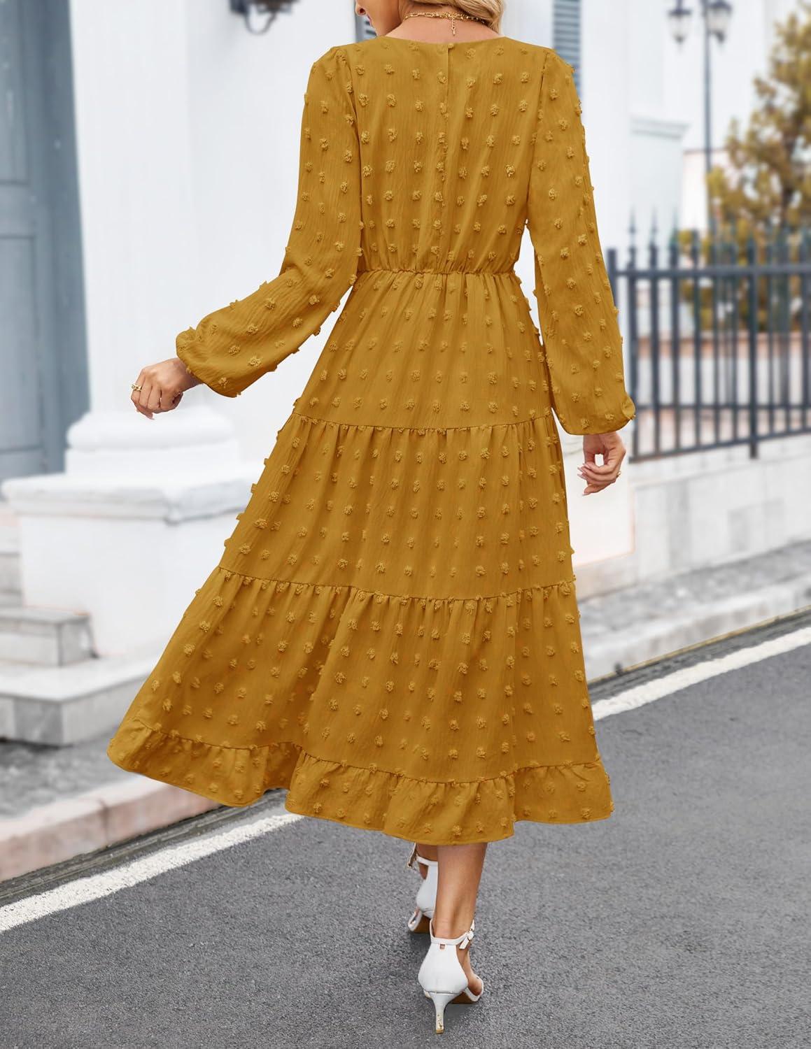 ZESICA Women’s Fall Long Sleeve Maxi Dresses 2025 Crew Neck Swiss Dot Tiered Flowy A Line Casual Boho Party Dress(Mustard)