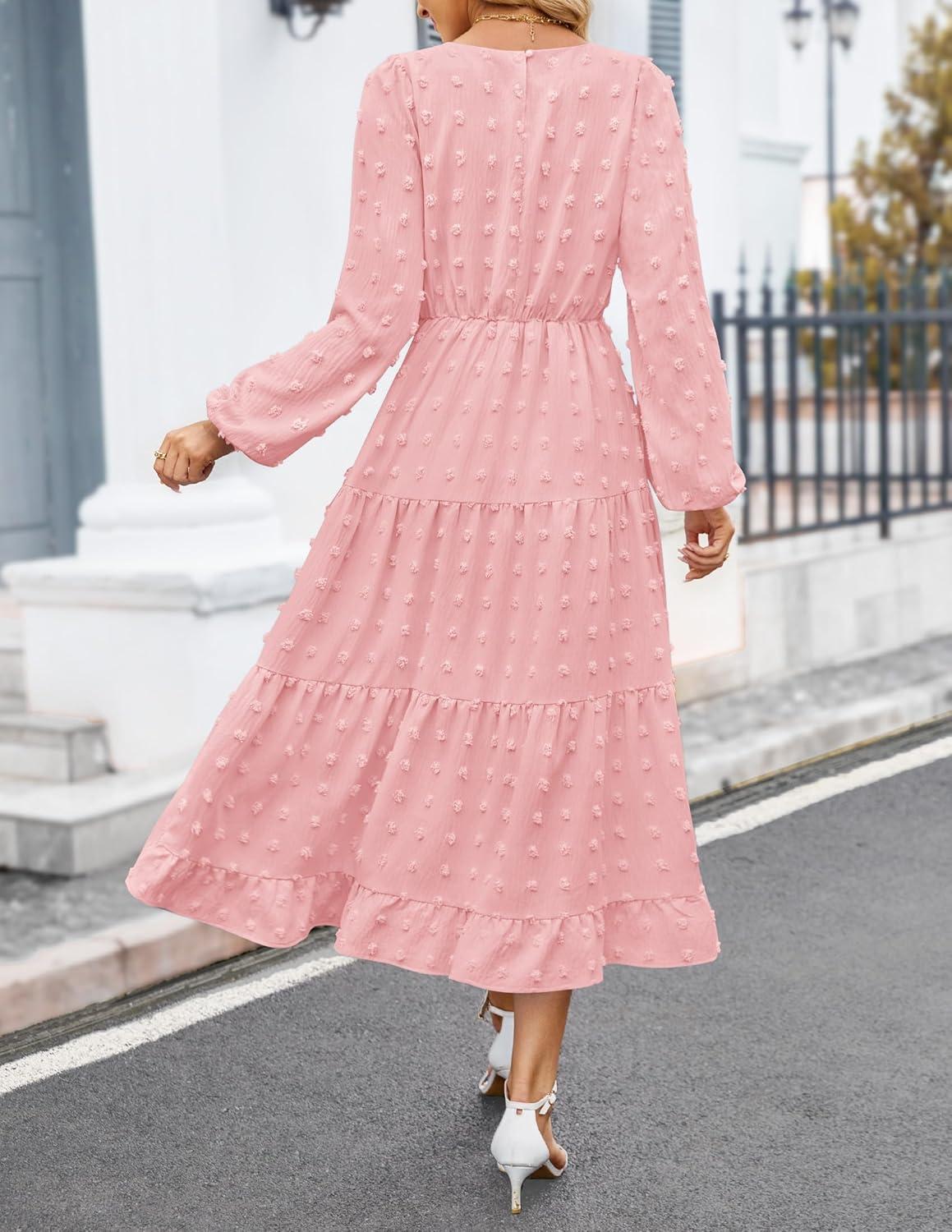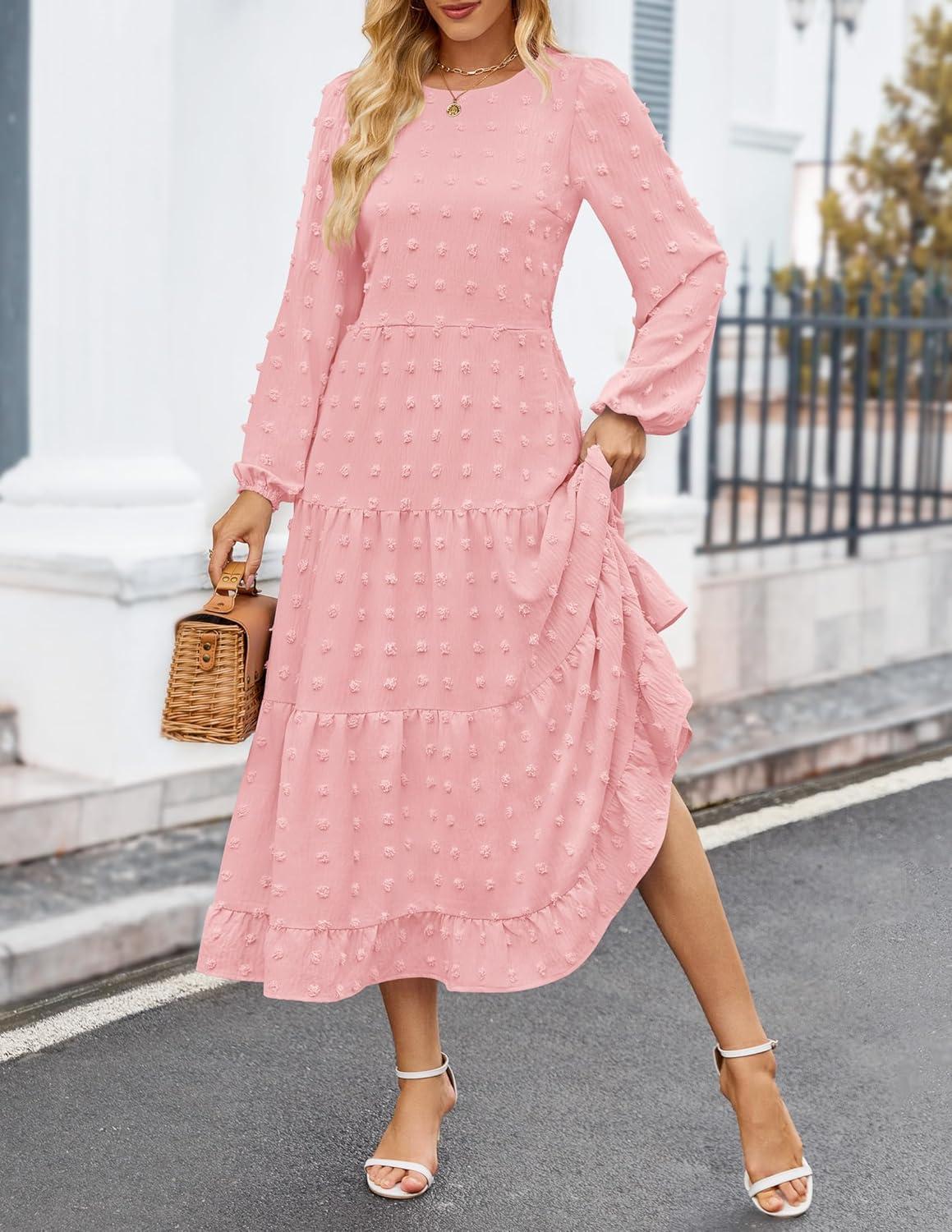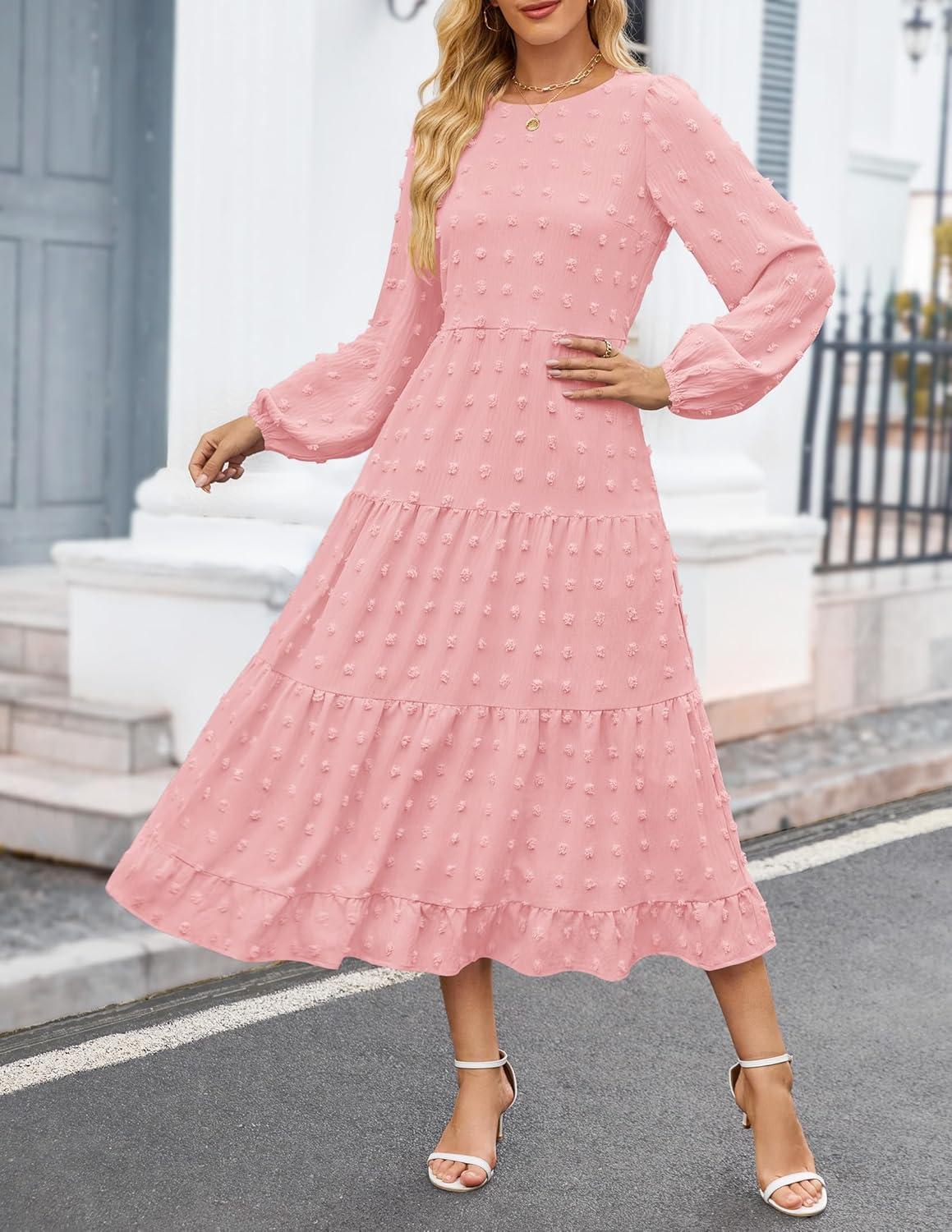 ZESICA Women’s Fall Long Sleeve Maxi Dresses 2025 Crew Neck Swiss Dot Tiered Flowy A Line Casual Boho Party Dress(Pink)