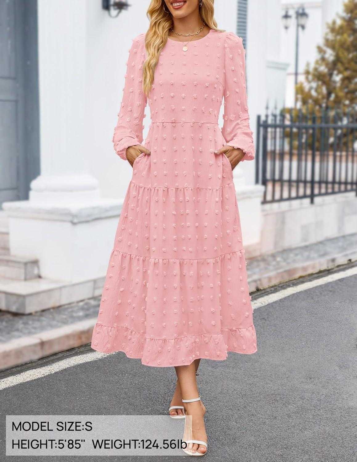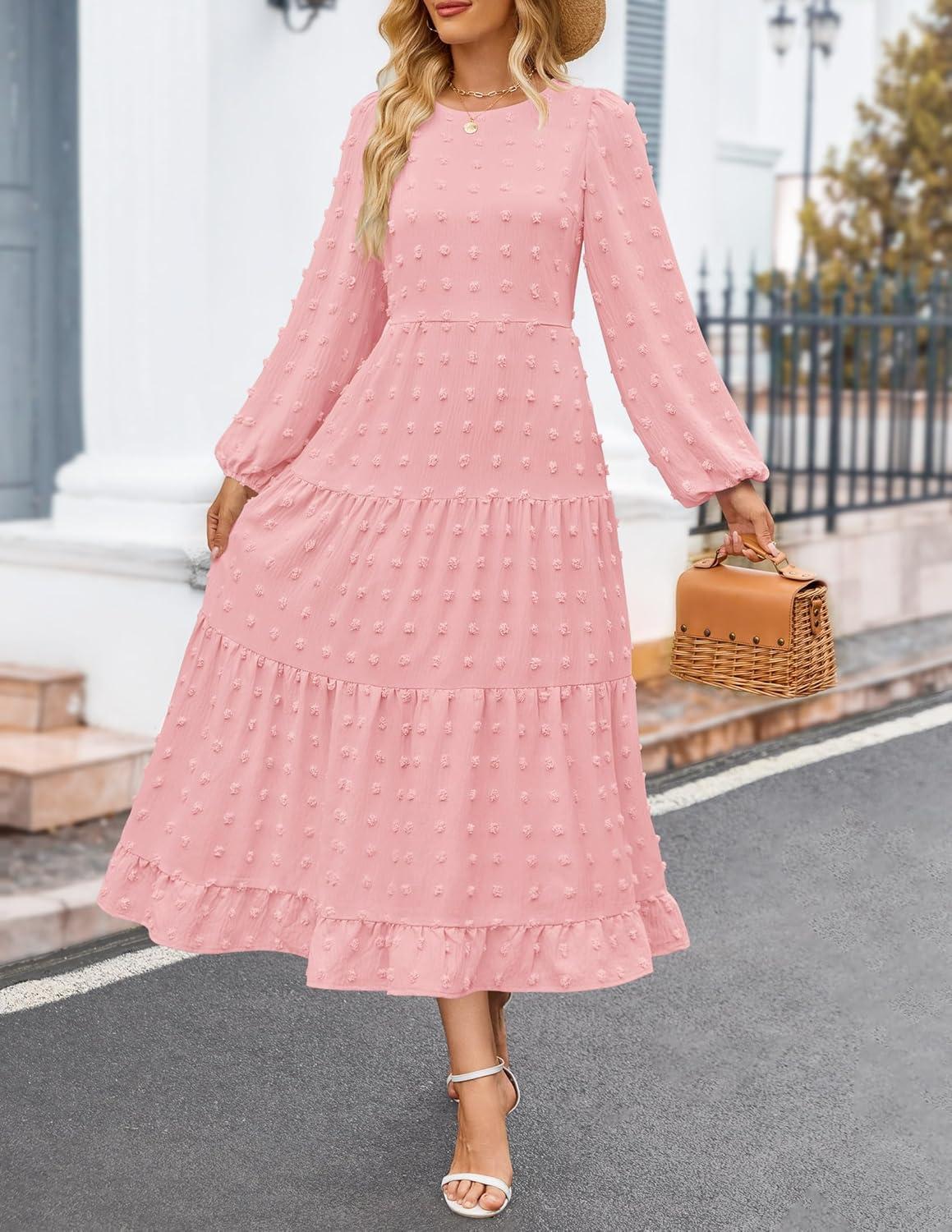 ZESICA Women's Fall Long Sleeve Maxi Dresses 2025 Crew Neck Swiss Dot Tiered Flowy A Line Casual Boho Party Dress(Pink)