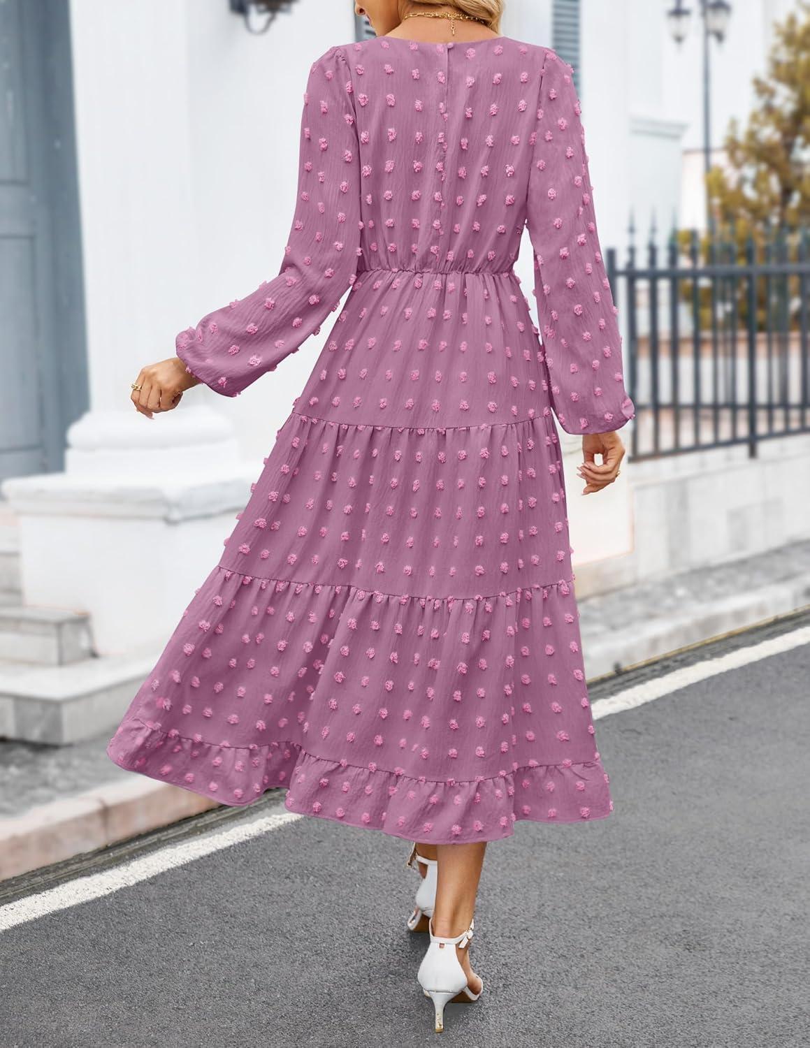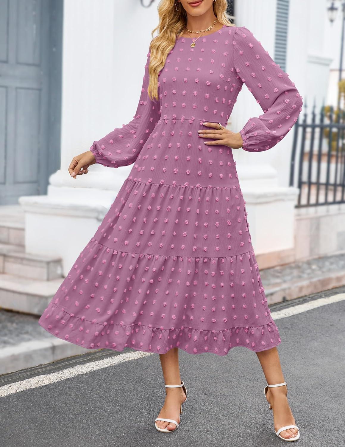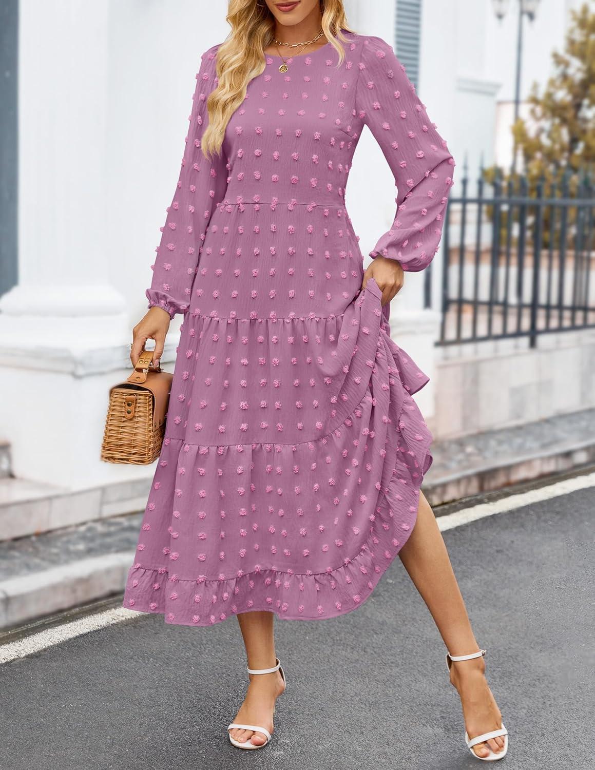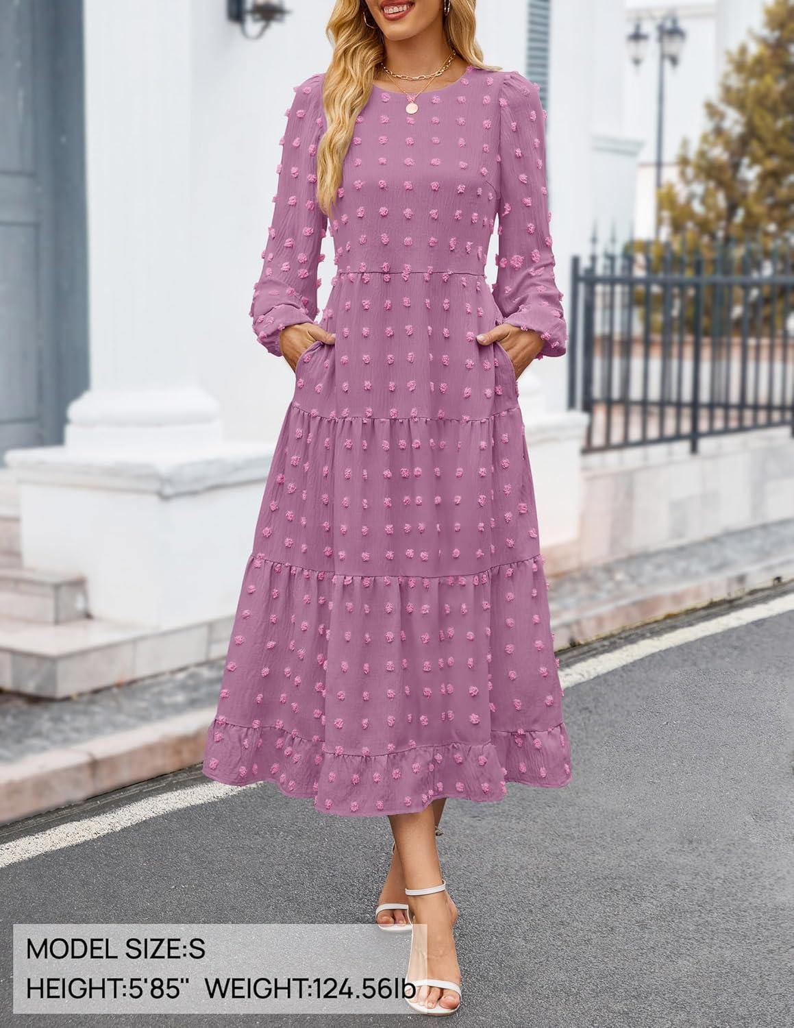 ZESICA Women’s Fall Long Sleeve Maxi Dresses 2025 Crew Neck Swiss Dot Tiered Flowy A Line Casual Boho Party Dress(Pink)