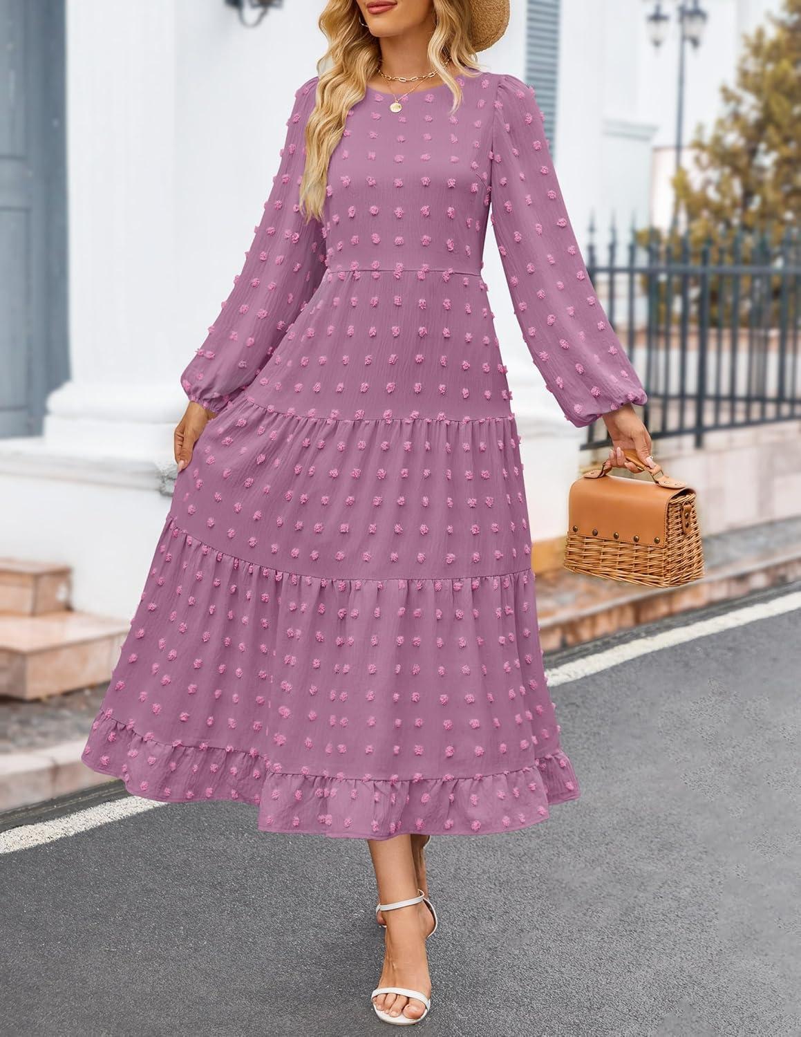 ZESICA Women’s Fall Long Sleeve Maxi Dresses 2025 Crew Neck Swiss Dot Tiered Flowy A Line Casual Boho Party Dress(Purple)