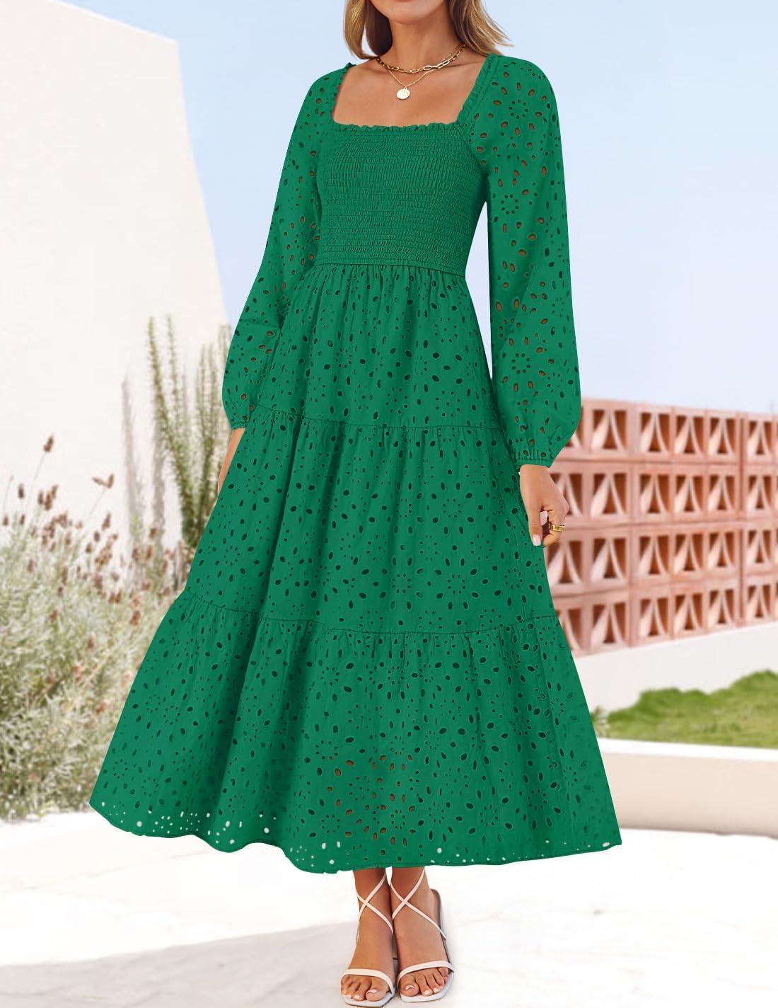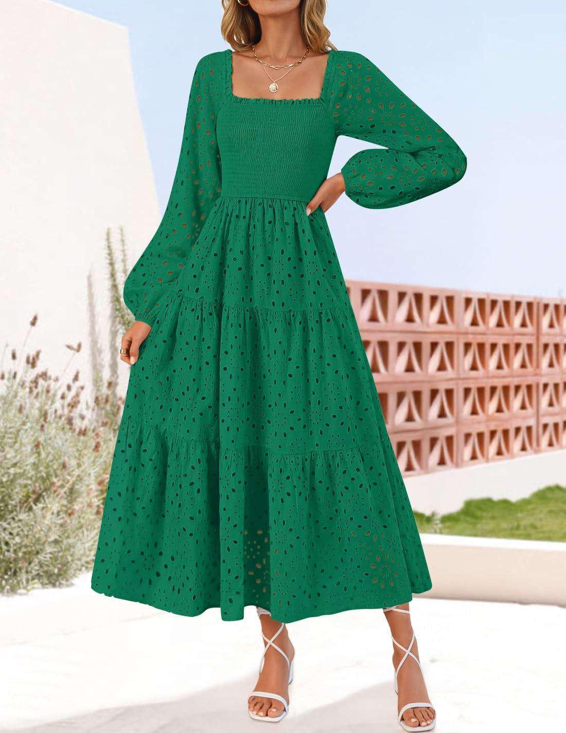 Don’t break the bank! Get the ZESICA Women’s Fall Long Sleeve Maxi Dresses 2025 Square Neck Hollow Out Eyelet Smocked A Line Boho Wedding Guset Dress(Green) you want at a price you can afford during our markdown sale.
