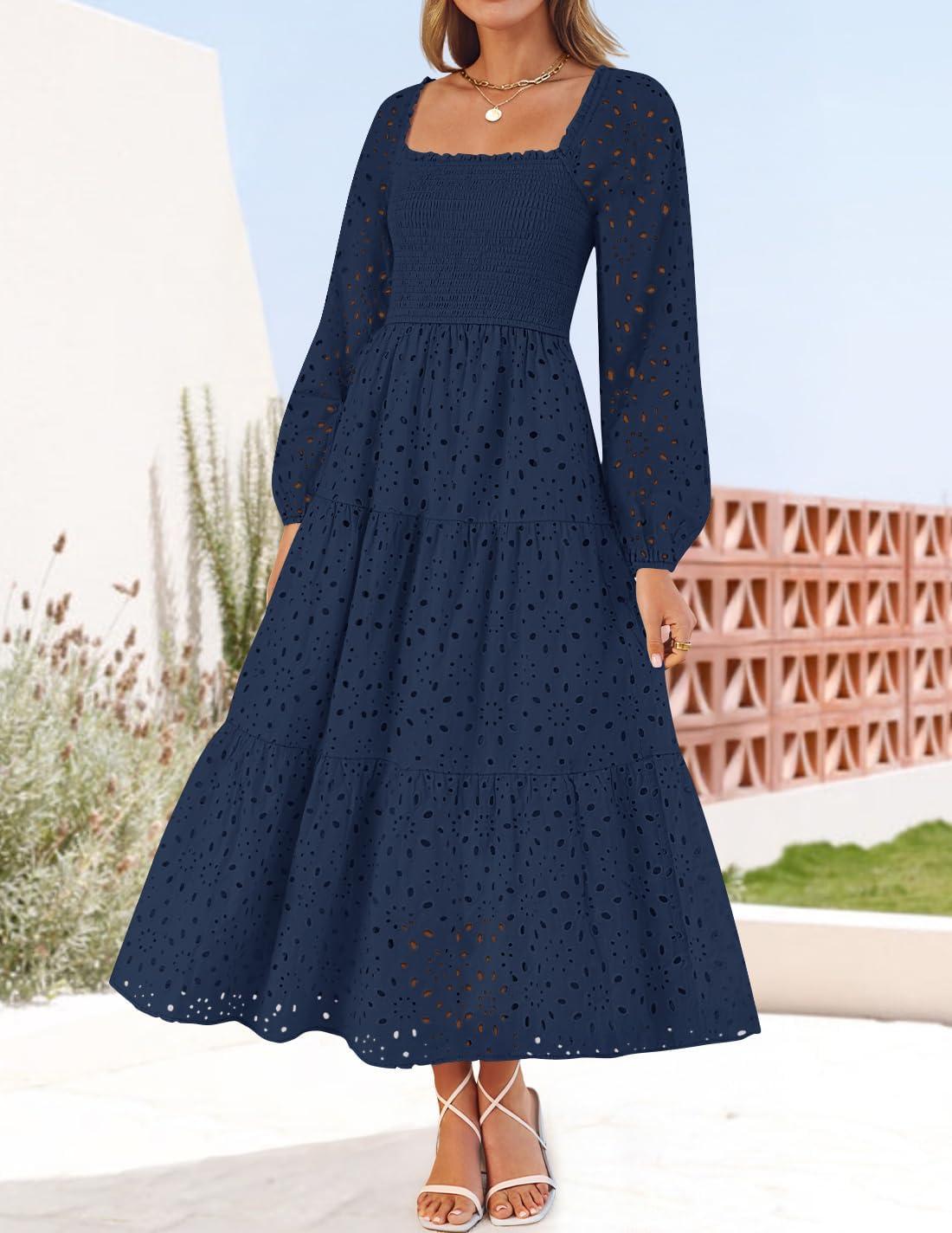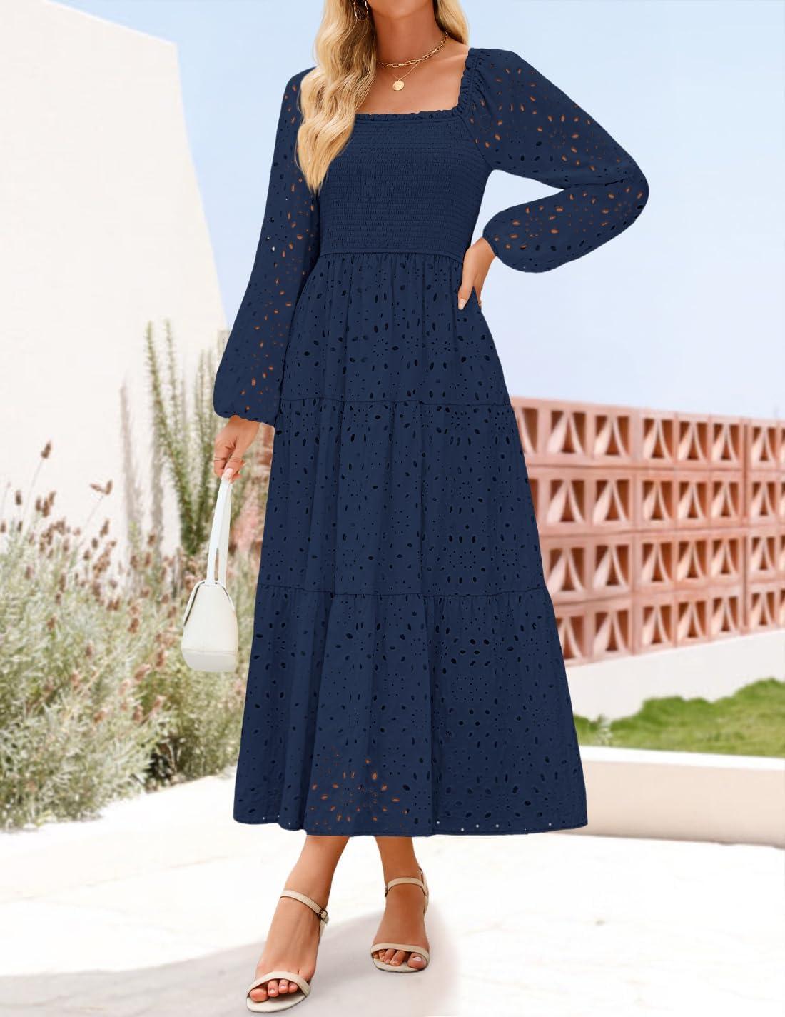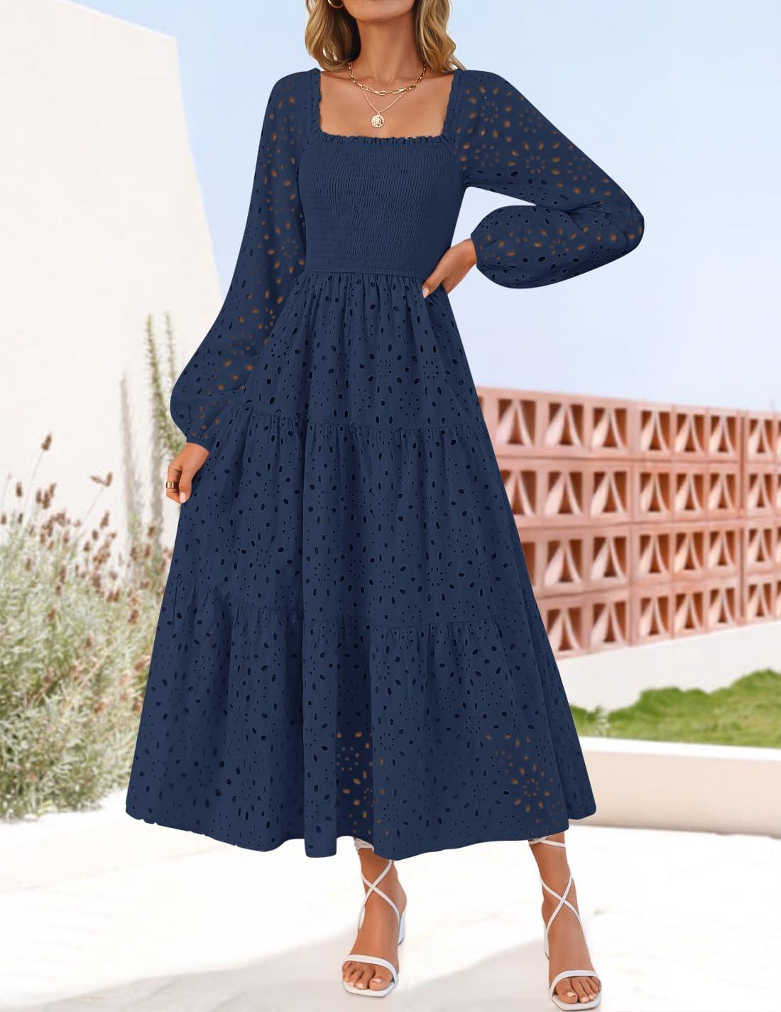 ZESICA Women’s Fall Long Sleeve Maxi Dresses 2025 Square Neck Hollow Out Eyelet Smocked A Line Boho Wedding Guset Dress(Navy)