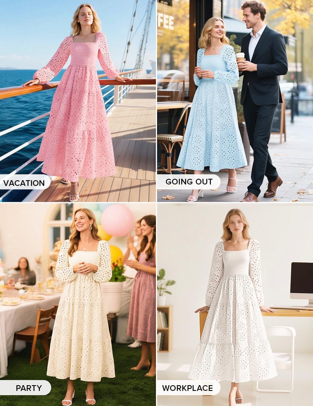 ZESICA Women’s Fall Long Sleeve Maxi Dresses 2025 Square Neck Hollow Out Eyelet Smocked A Line Boho Wedding Guset Dress(Lightblue)