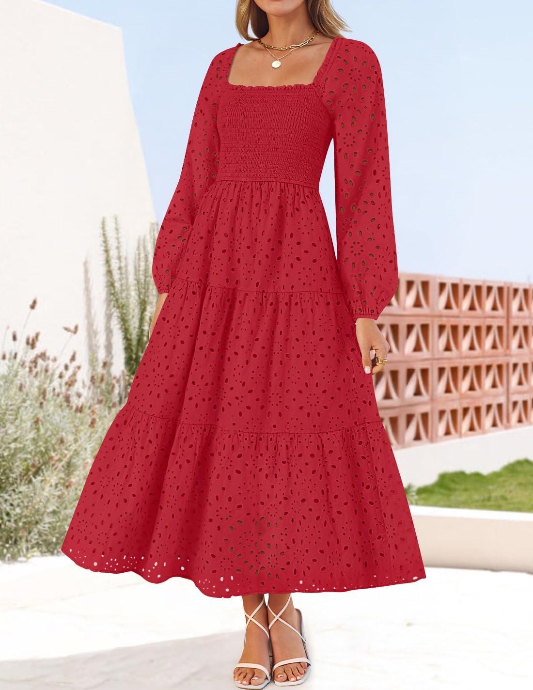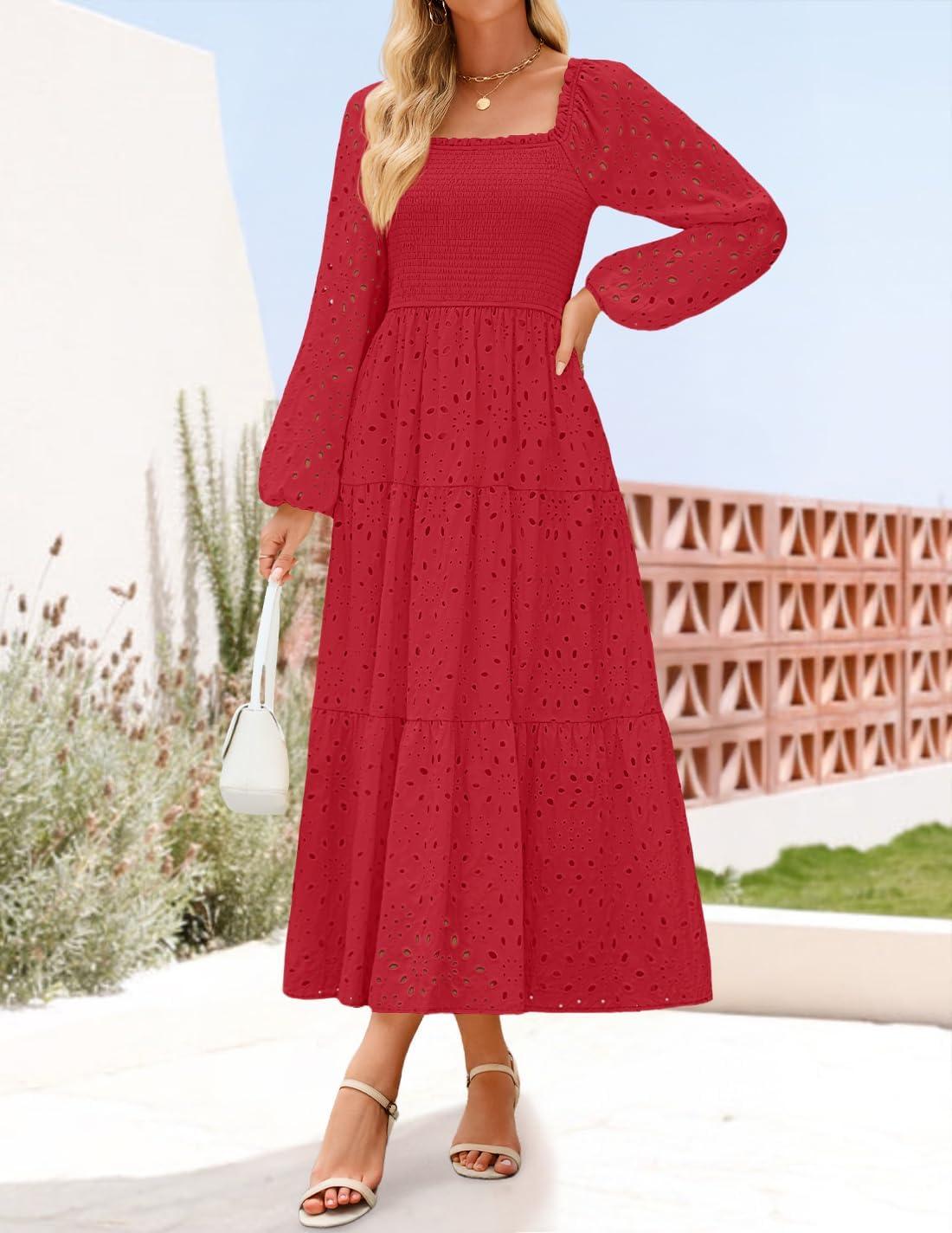 ZESICA Women's Fall Long Sleeve Maxi Dresses 2025 Square Neck Hollow Out Eyelet Smocked A Line Boho Wedding Guset Dress(Red)