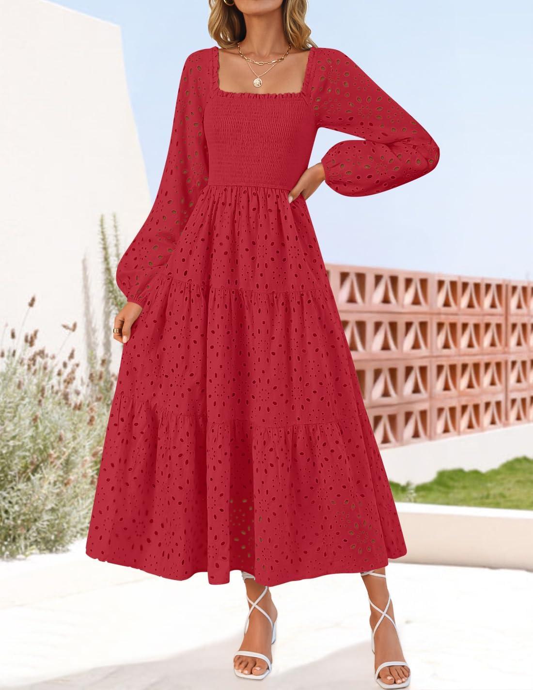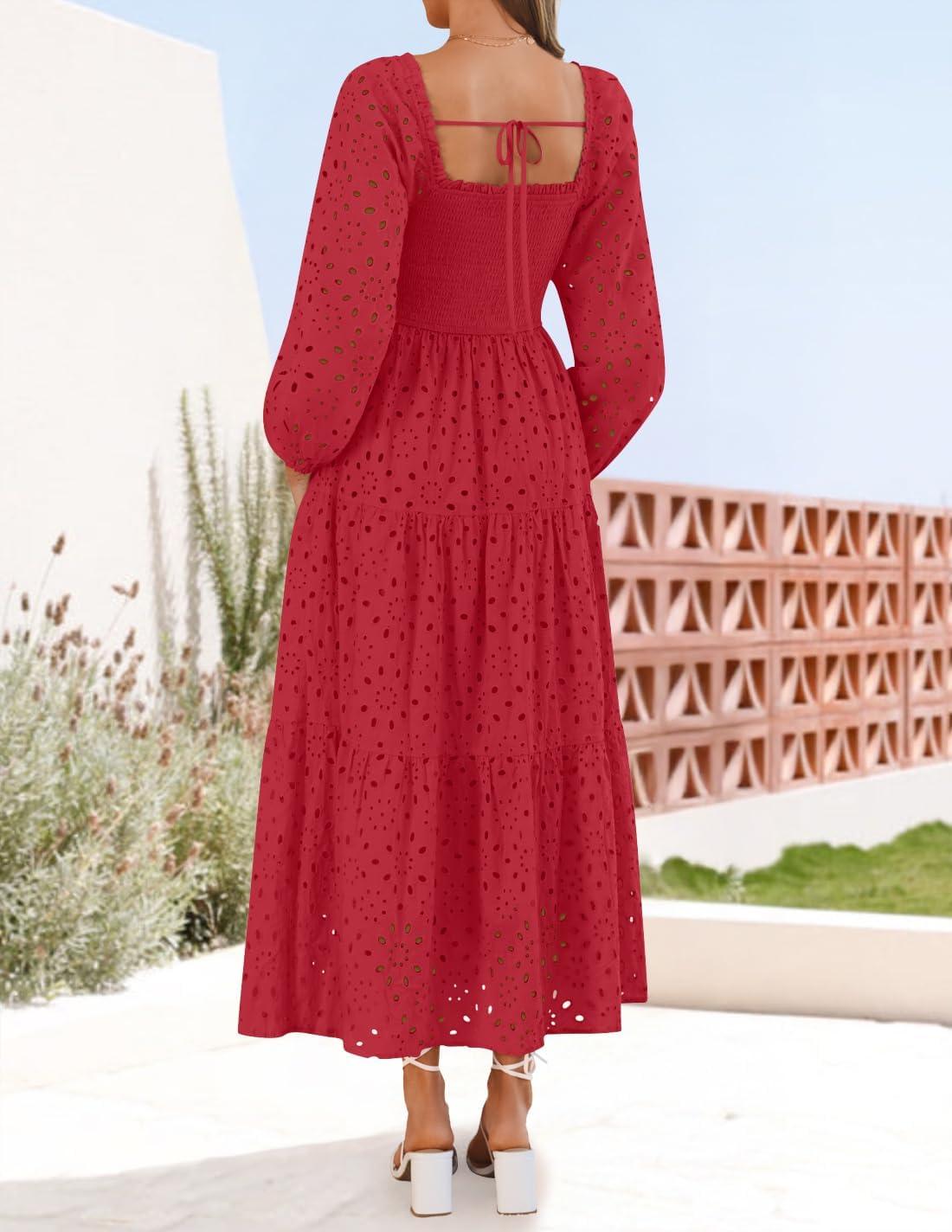 ZESICA Women’s Fall Long Sleeve Maxi Dresses 2025 Square Neck Hollow Out Eyelet Smocked A Line Boho Wedding Guset Dress(Red)