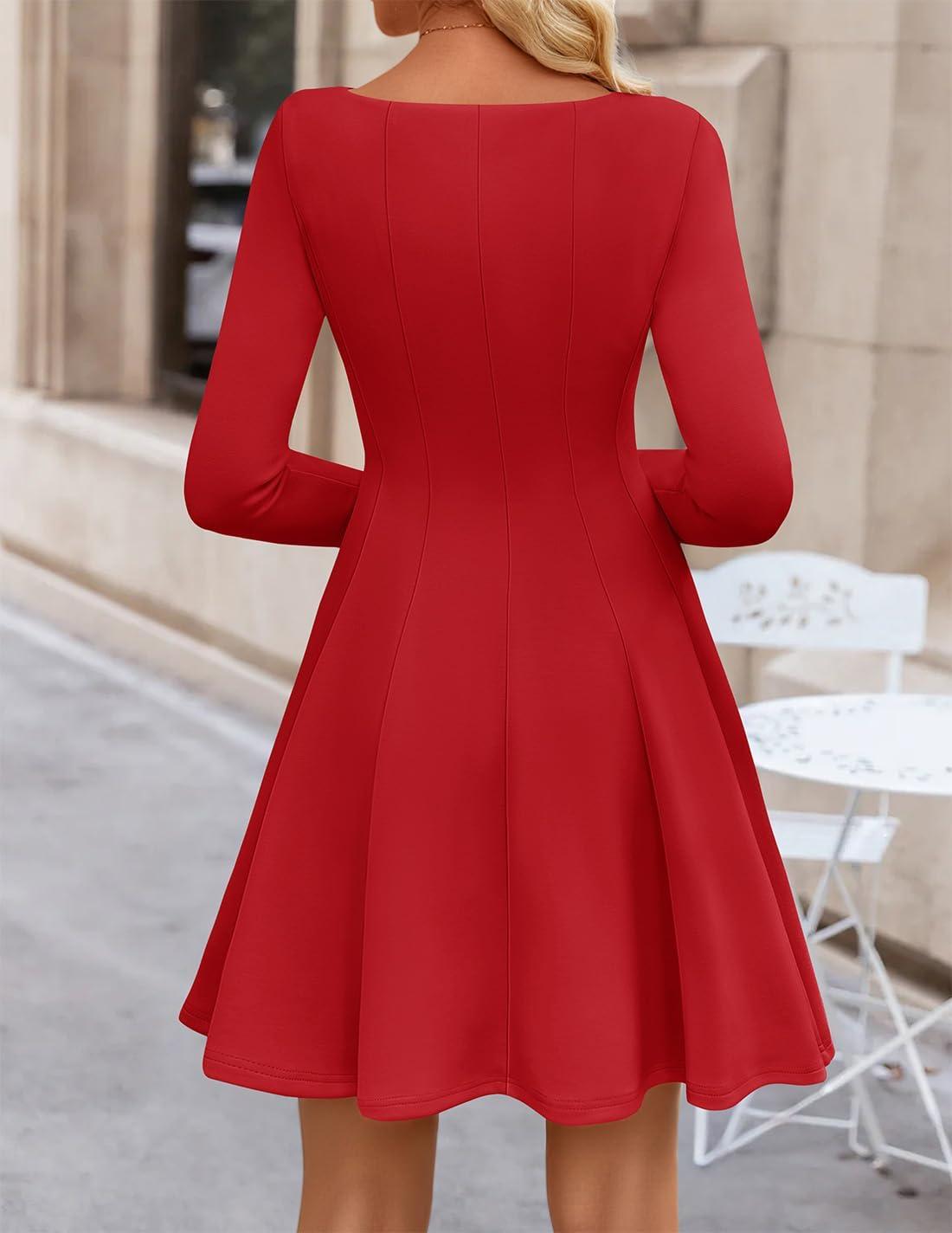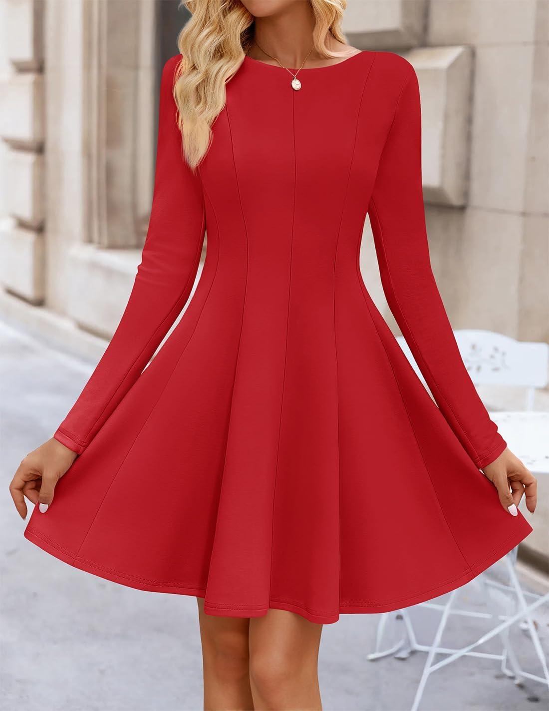 ZESICA Womens Fall Long Sleeve Mini Dress 2025 Boat Neck Elegant Pleated A Line Flowy Wedding Guest Party Short Dresses(Red)