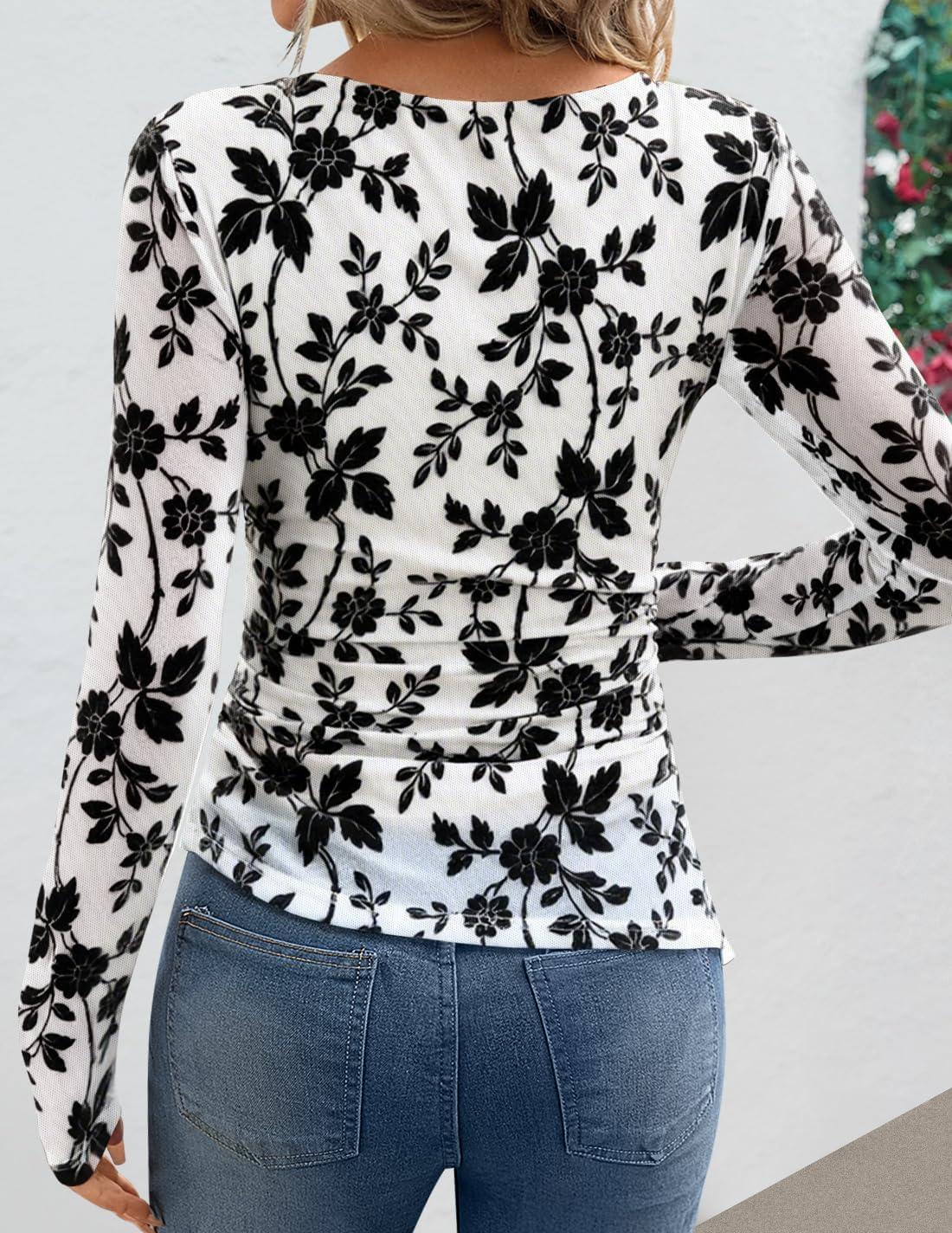 ZESICA Womens Floral Long Sleeve Shirts 2025 Fall Boat Neck Ruched Tops Slim Fitted Asymmetrical Going Out Blouses(White)