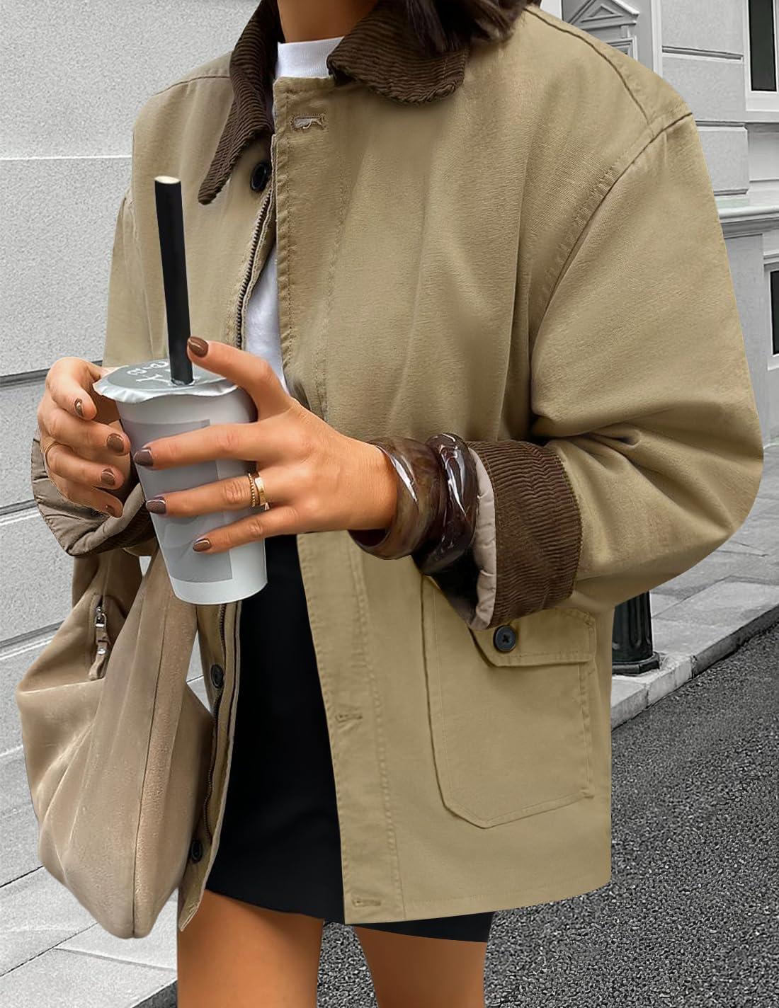 ZESICA Women's Lightweight Trendy Jackets 2025 fall Contrast Collar Button Down Cotton Oversized Casual Cargo Barn Jacket(Khaki)