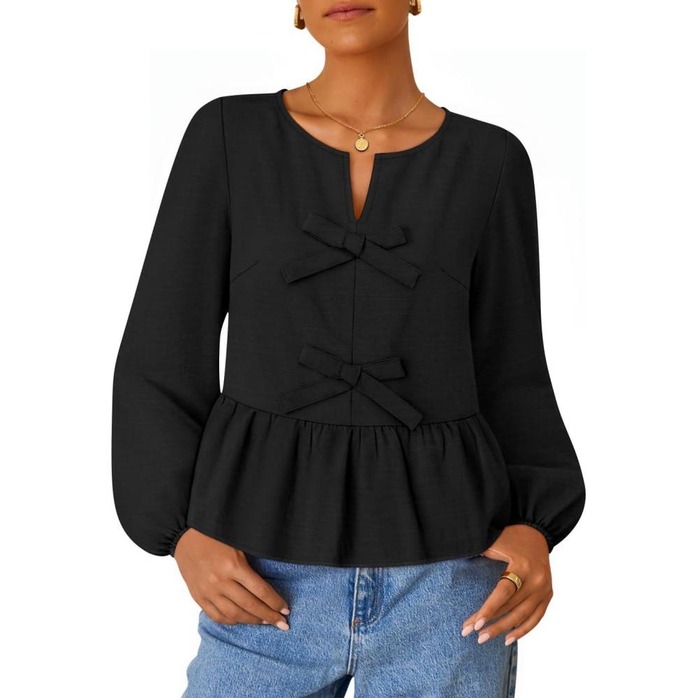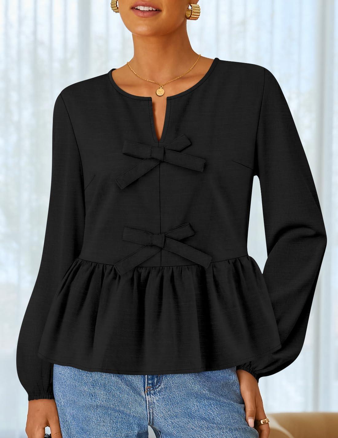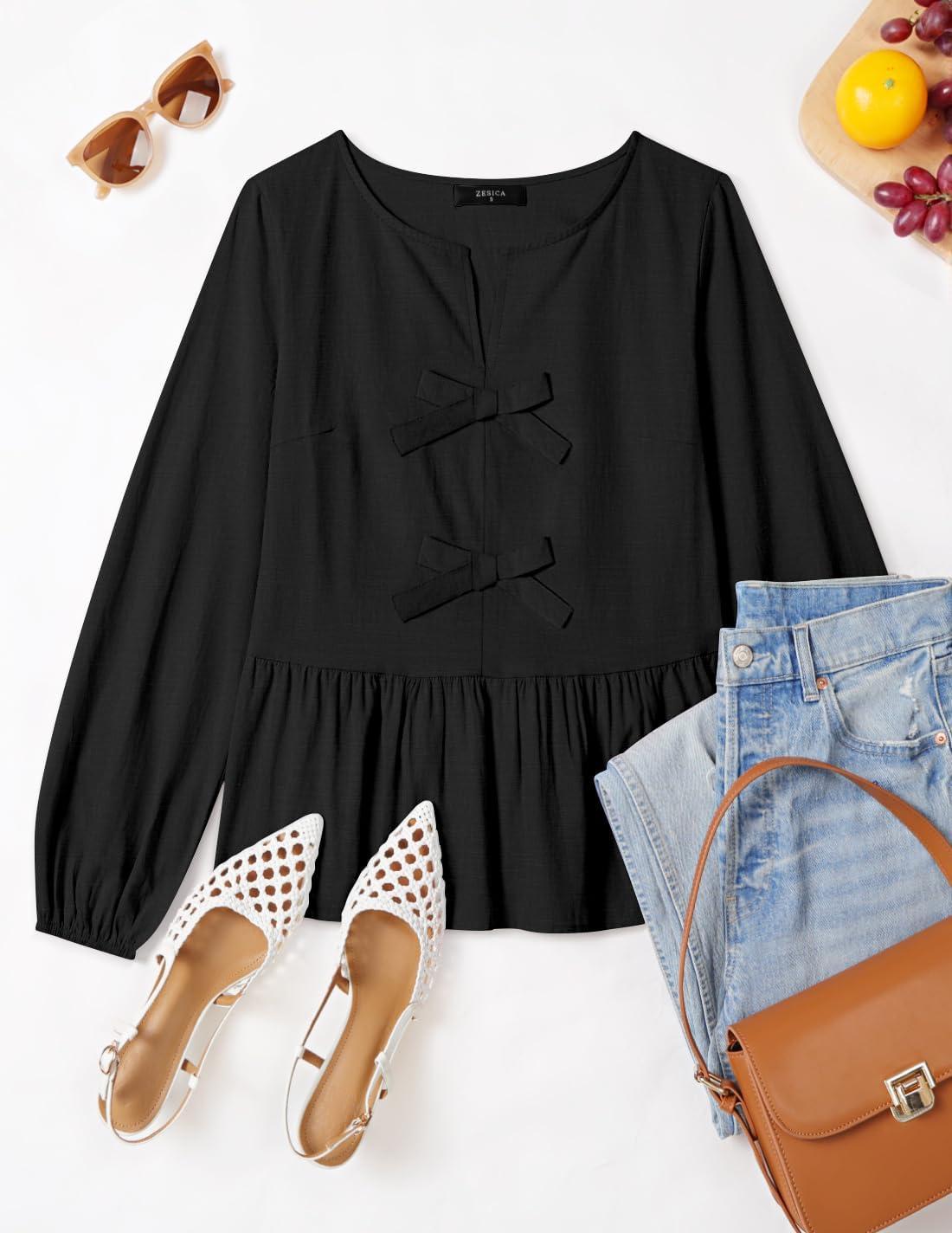 ZESICA Women’s Long Sleeve Babydoll Tops Crewneck Tie Front Casual Loose Ruffle Flowy Peplum Shirts 2025 Fall Blouses(Black)