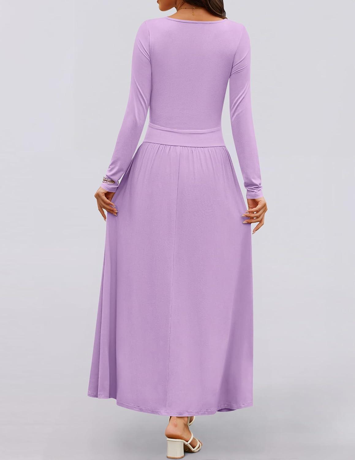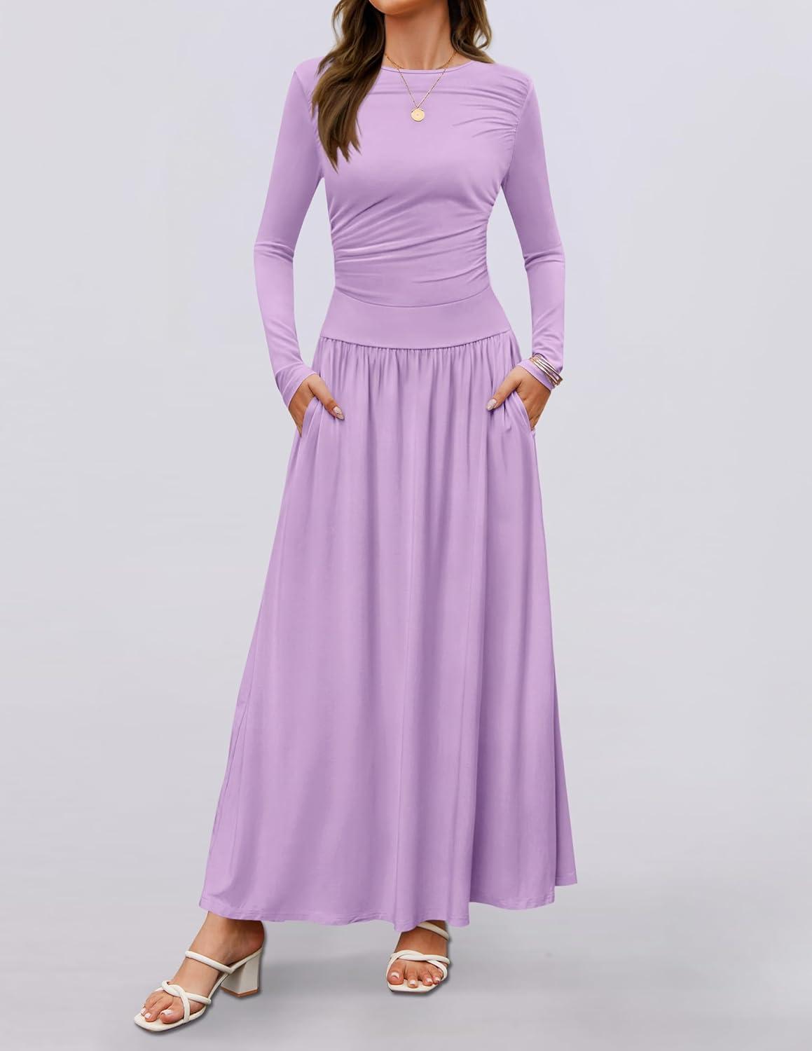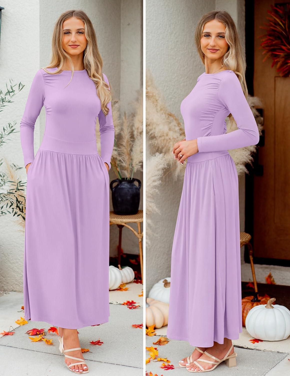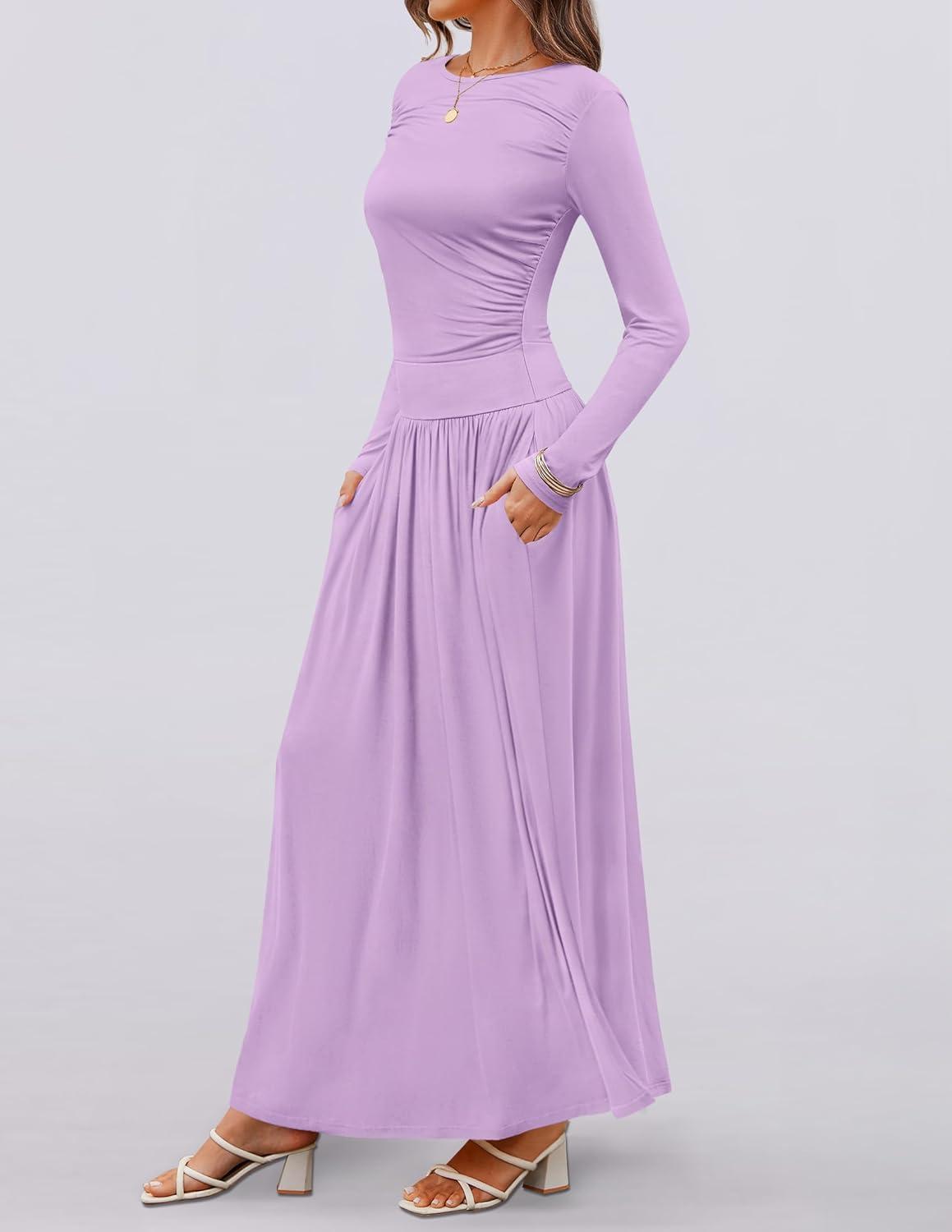 ZESICA Women’s Long Sleeve Fall Maxi Dress 2025 Crewneck Knit Casual Slim Swing Pleated Dresses with Pockets(Purple)