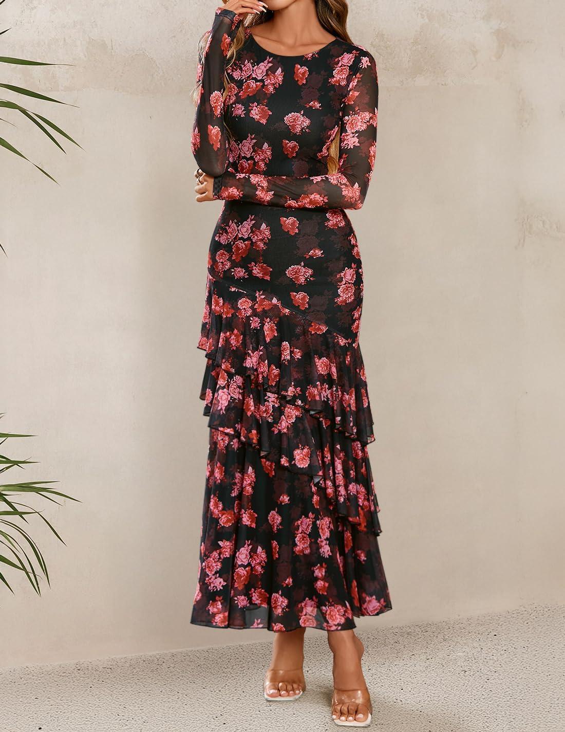 ZESICA Women’s Long Sleeve Floral Bodycon Dresses 2025 Fall Fashion Mesh Ruffle Mermaid Wedding Guest Party Maxi Dress(Black)