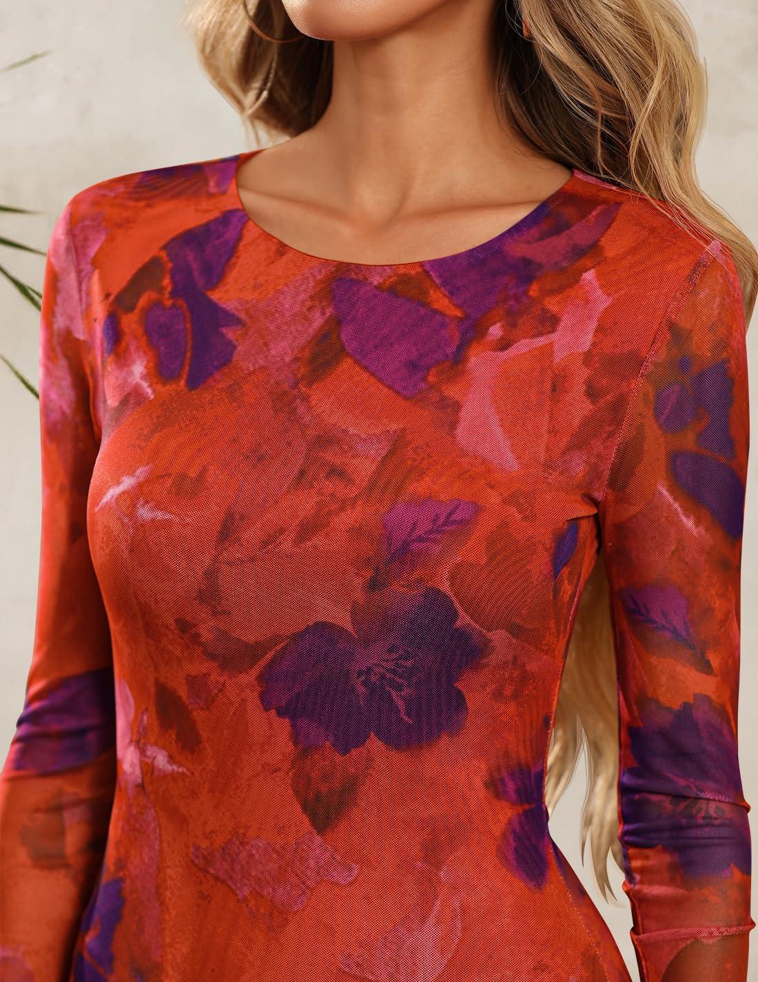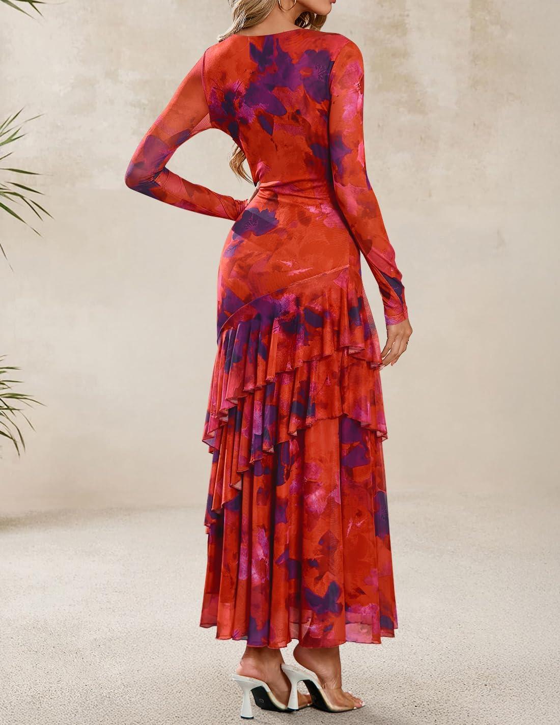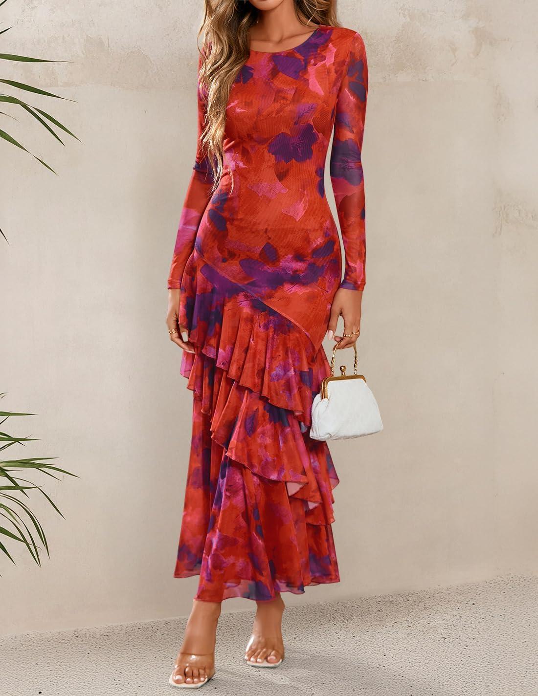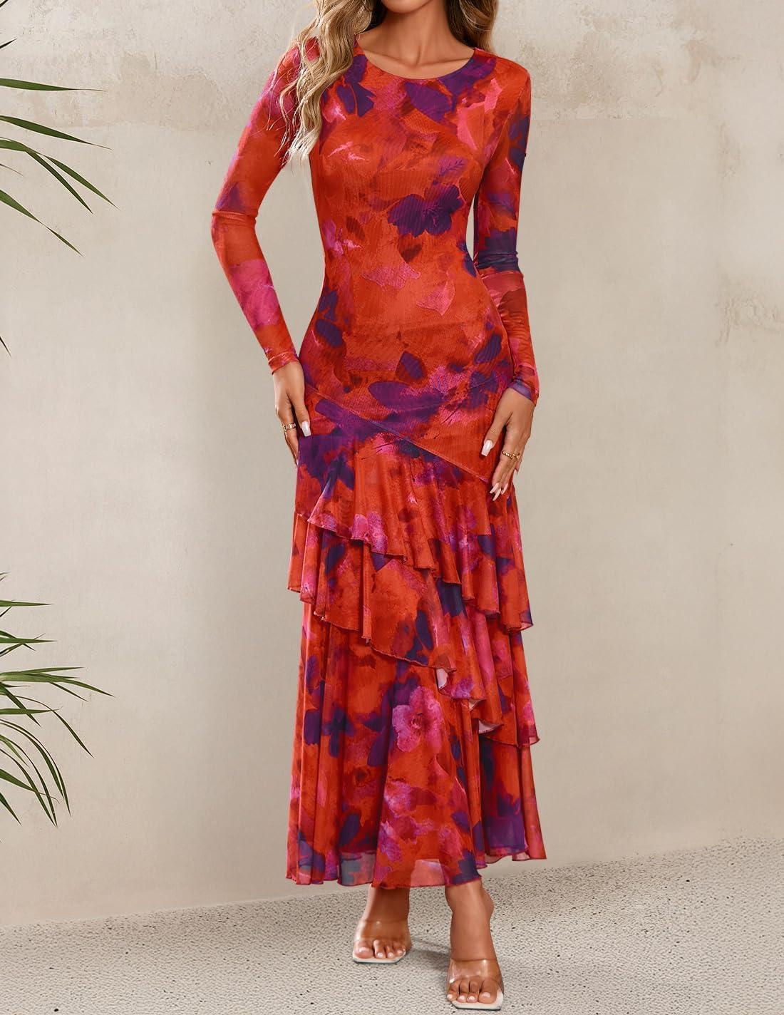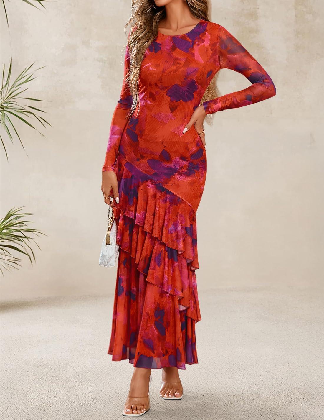 ZESICA Women's Long Sleeve Floral Bodycon Dresses 2025 Fall Fashion Mesh Ruffle Mermaid Wedding Guest Party Maxi Dress(Orangered)