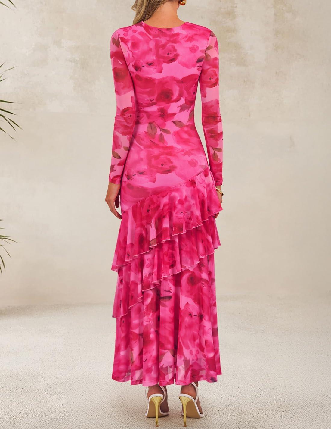 ZESICA Women's Long Sleeve Floral Bodycon Dresses 2025 Fall Fashion Mesh Ruffle Mermaid Wedding Guest Party Maxi Dress(Rose)