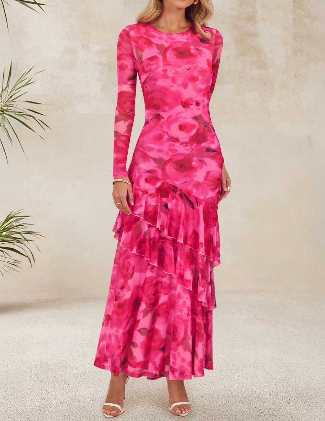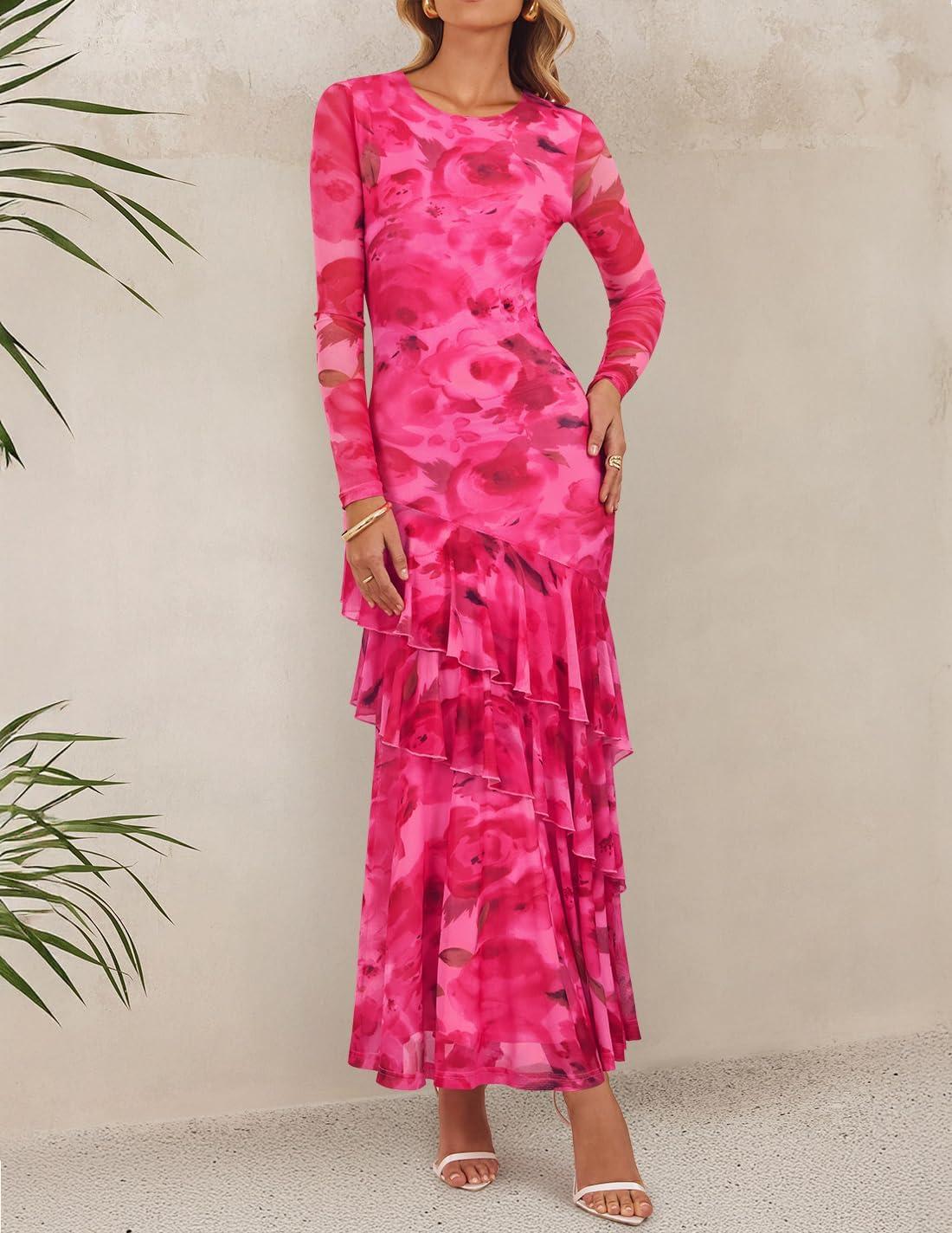 ZESICA Women’s Long Sleeve Floral Bodycon Dresses 2025 Fall Fashion Mesh Ruffle Mermaid Wedding Guest Party Maxi Dress(Rose)