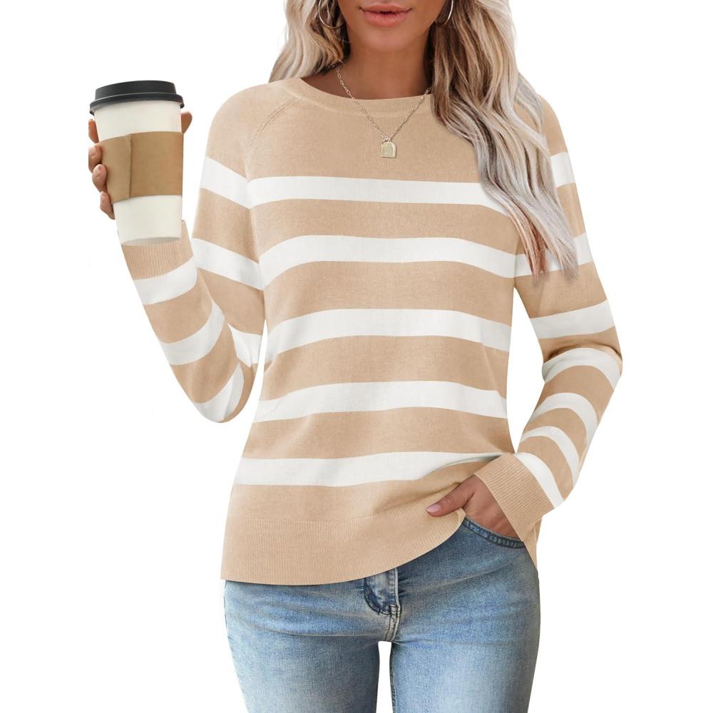 imageZESICA Womens Long Sleeve Lightweight Striped Tops Fall Crewneck Ribbed Knit Loose Shirts 2025 Trendy ClothesApricot