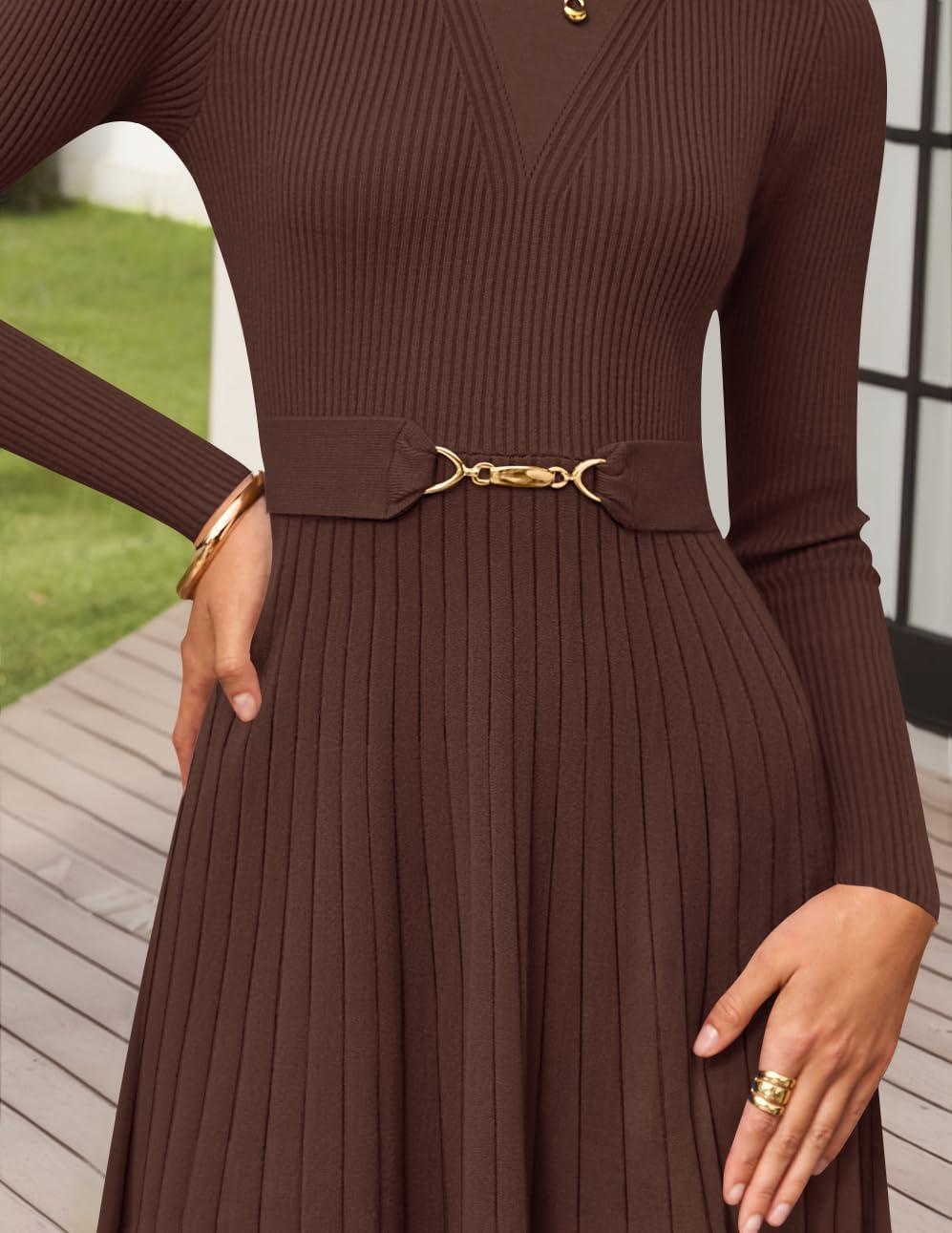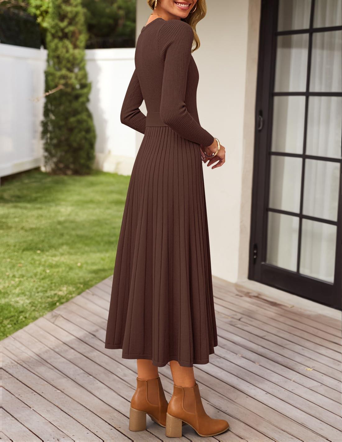 ZESICA Women’s Long Sleeve Midi Sweater Dress 2025 Fall Crewneck Knit A Line Pleated Flowy Long Dresses with Belt(Coffee)