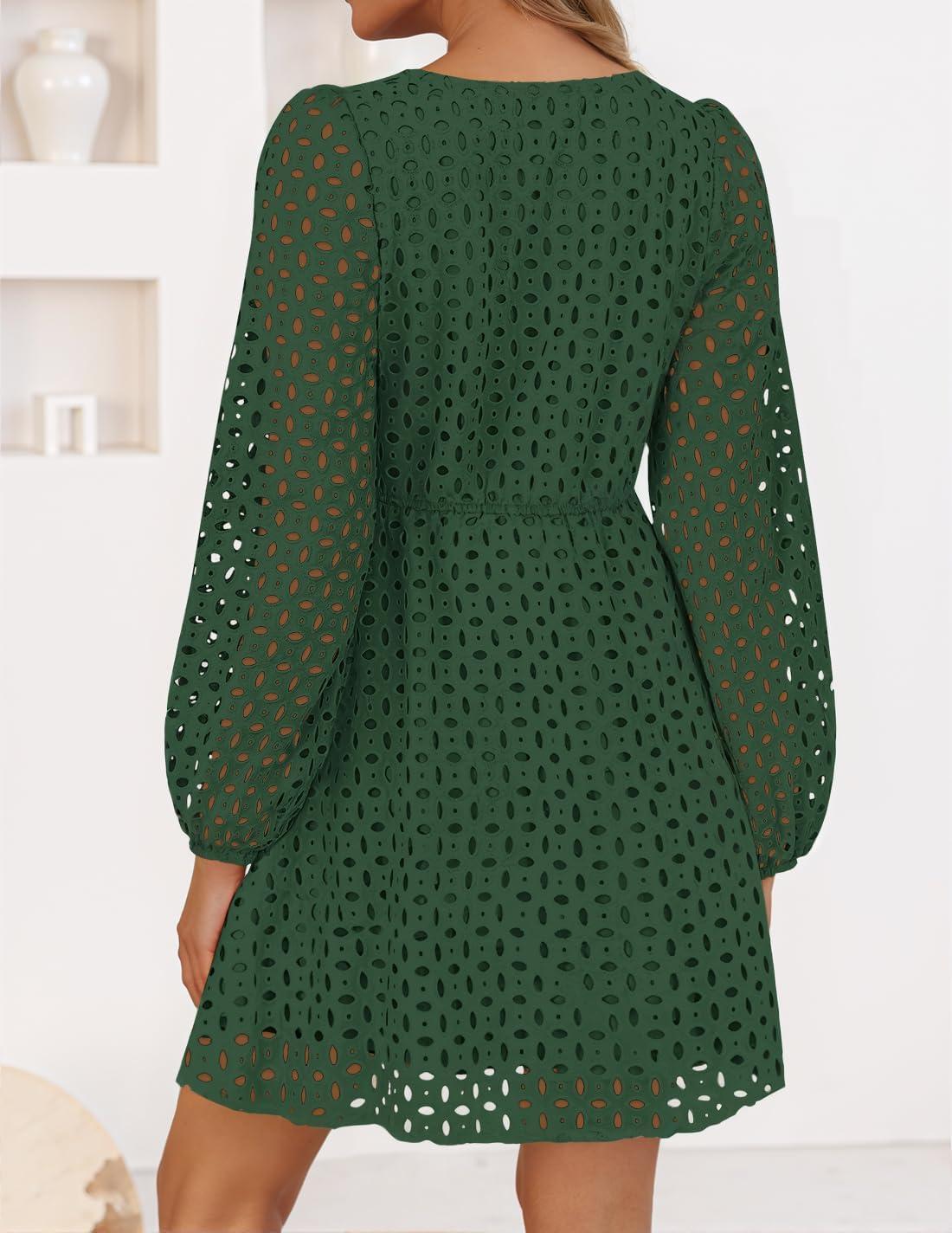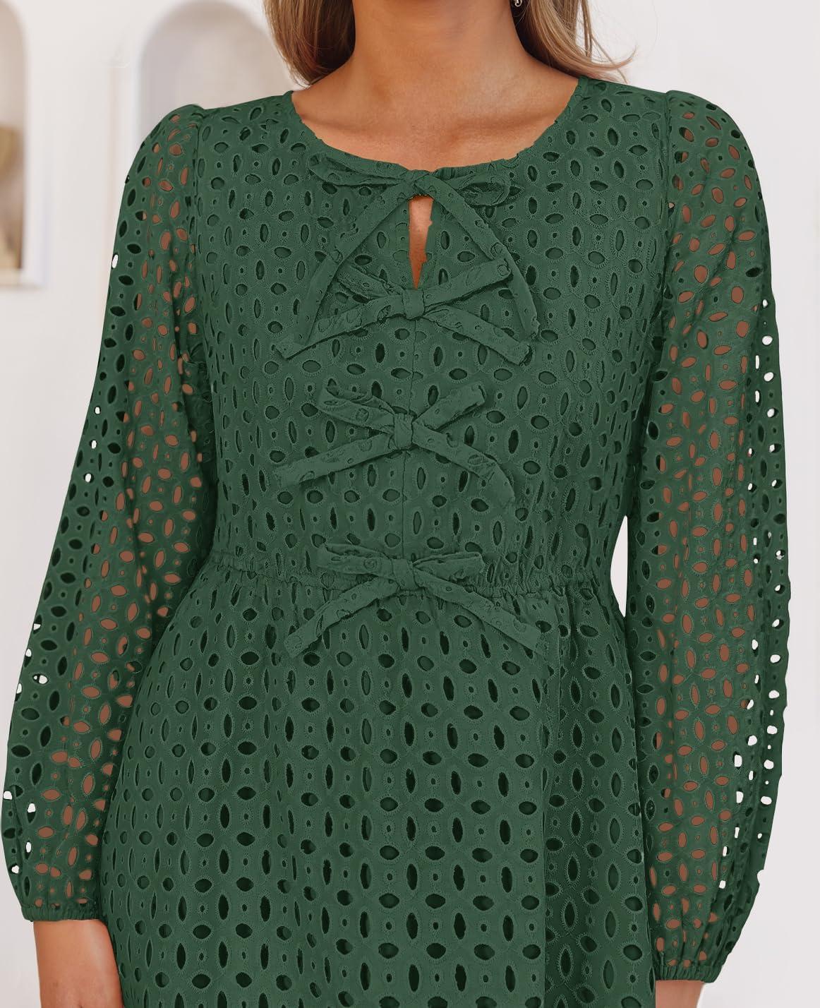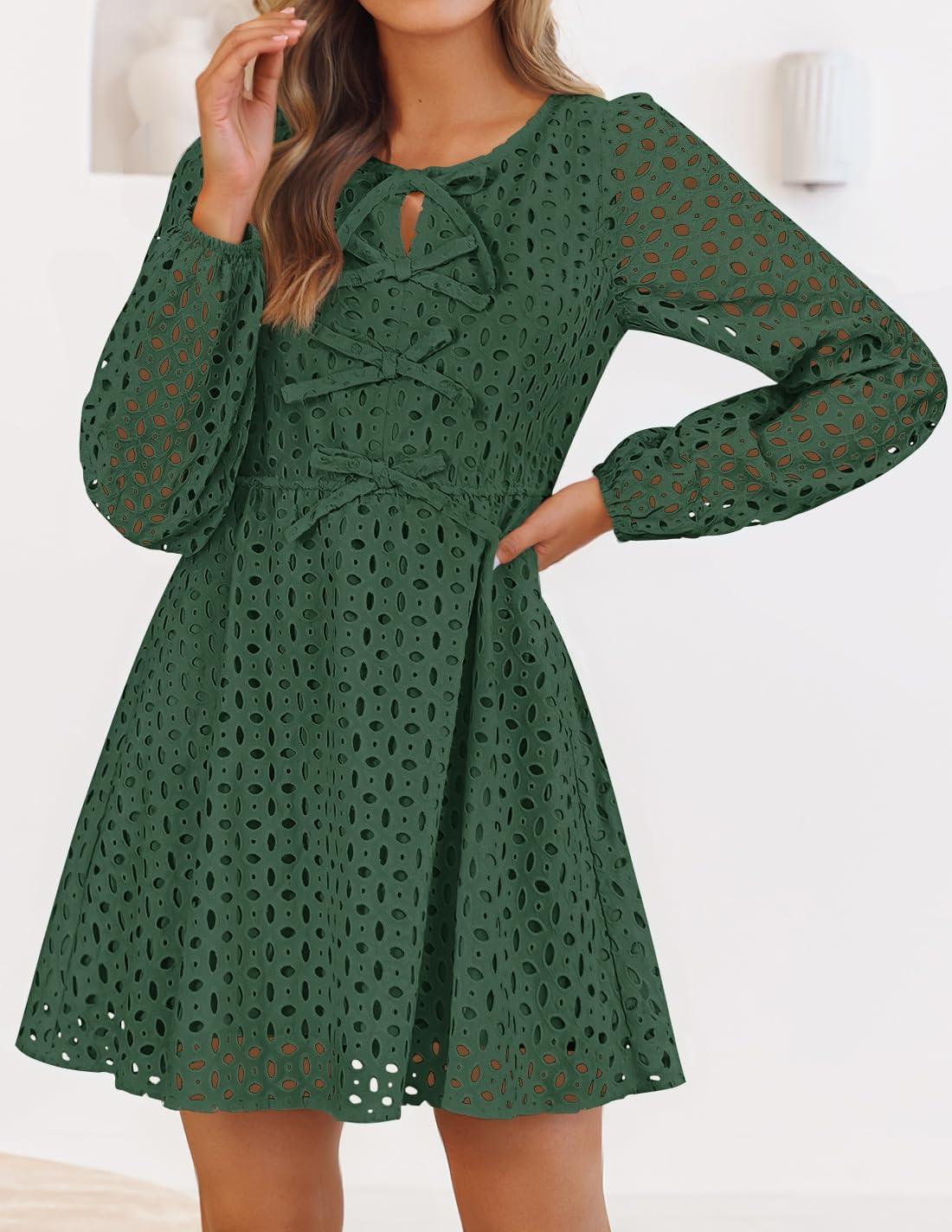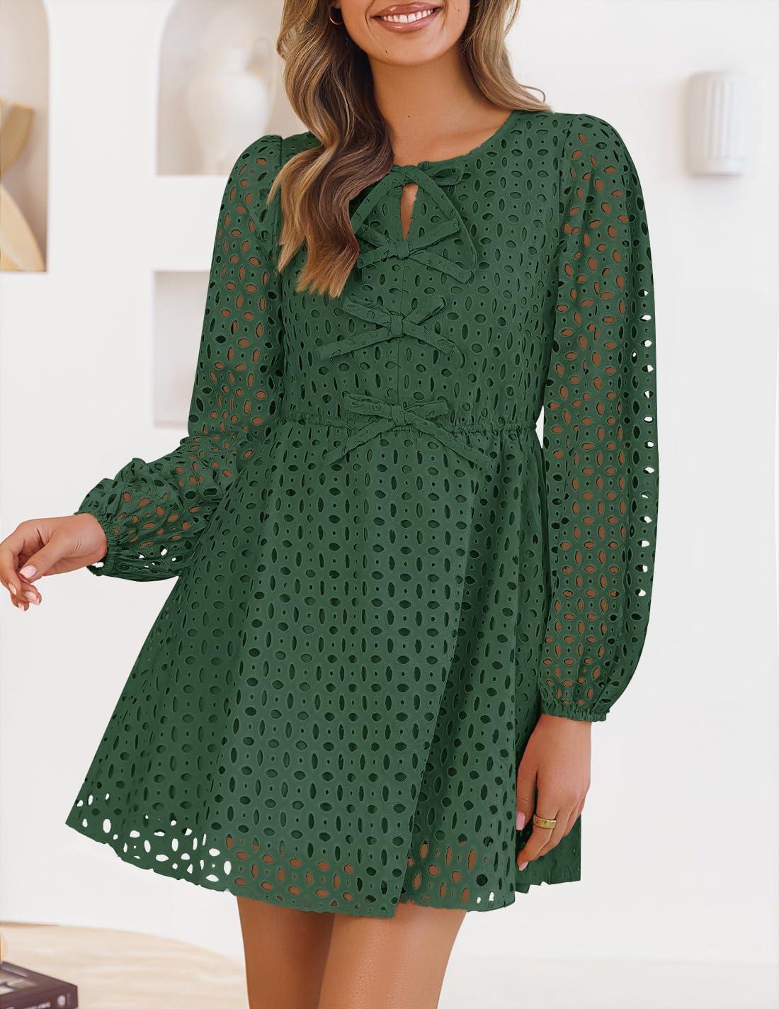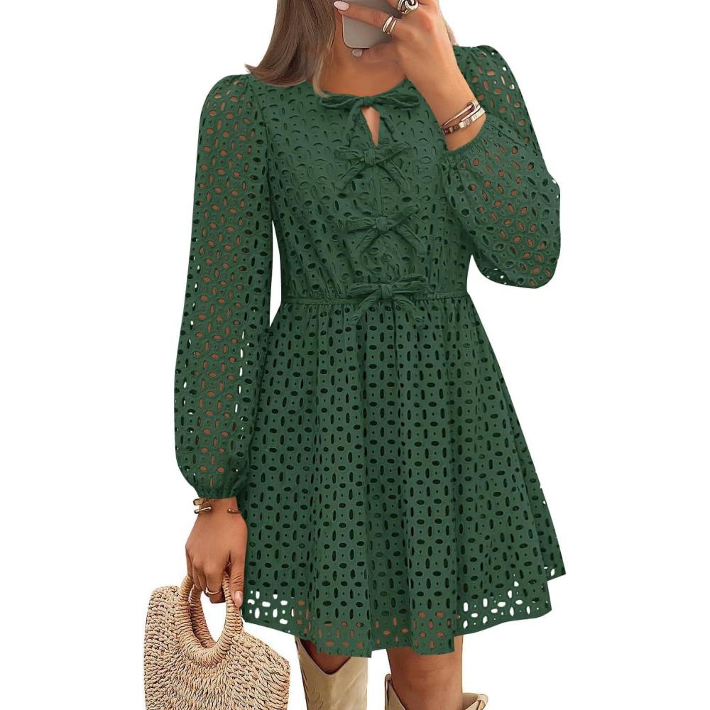 ZESICA Women’s Long Sleeve Mini Dress 2025 Fall Crewneck Tie Front Hollow Out Eyelet Babydoll A Line Short Dresses(Olive)