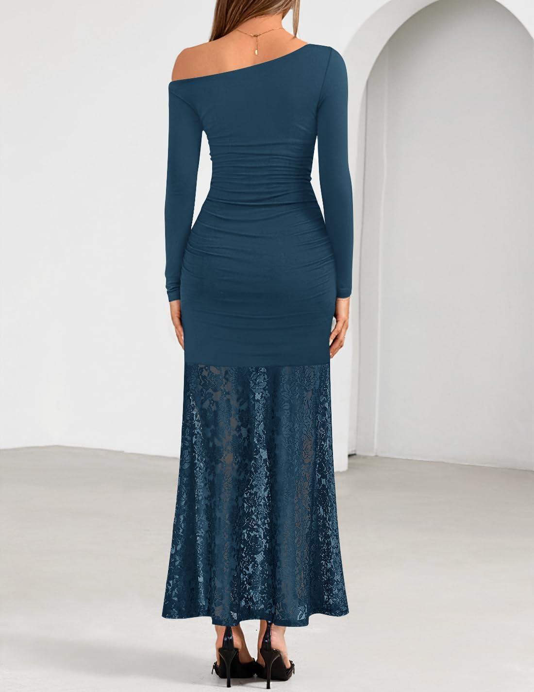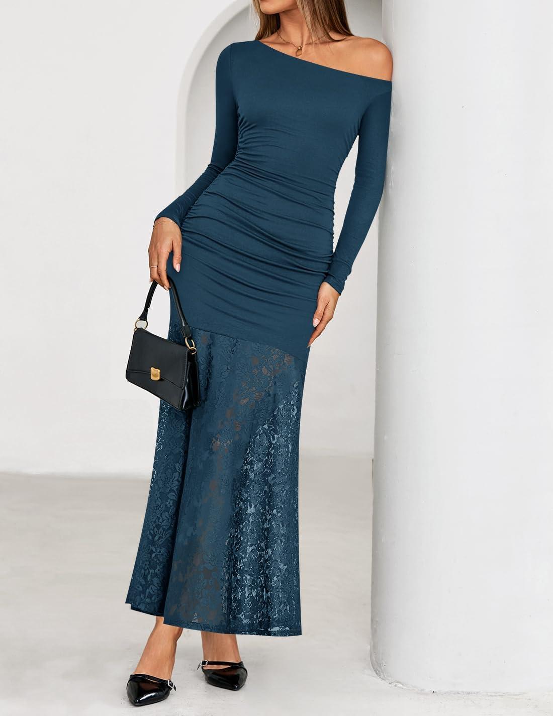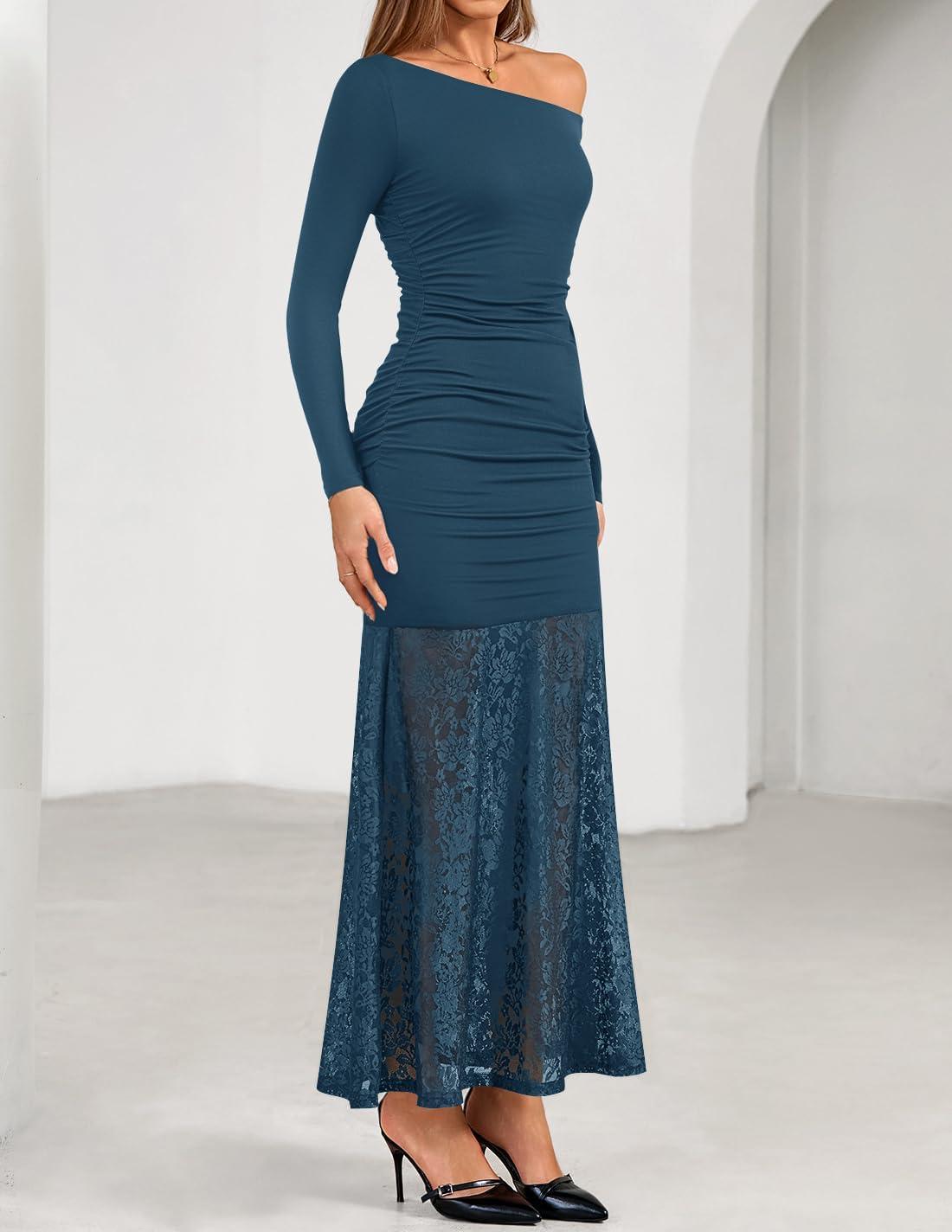 ZESICA Women’s Long Sleeve Off Shoulder Bodycon Dresses Fall 2025 Ruched Lace Wedding Guest Cocktail Formal Maxi Dress(Blue)