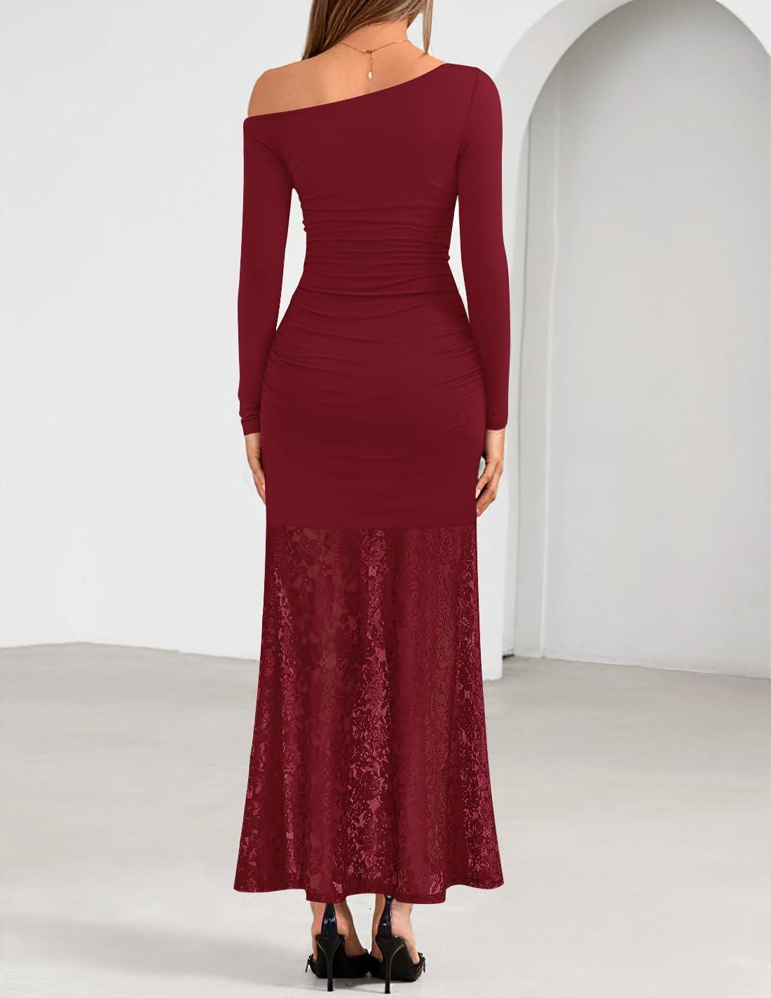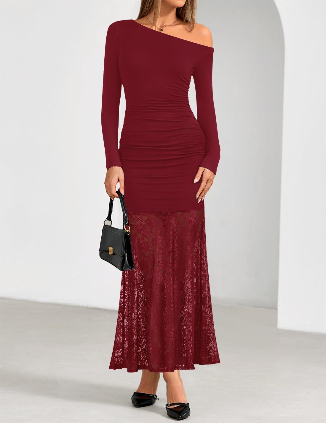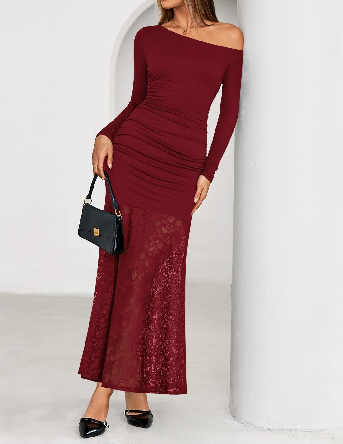 imageZESICA Womens Long Sleeve Off Shoulder Bodycon Dresses Fall 2025 Ruched Lace Wedding Guest Cocktail Formal Maxi DressRed
