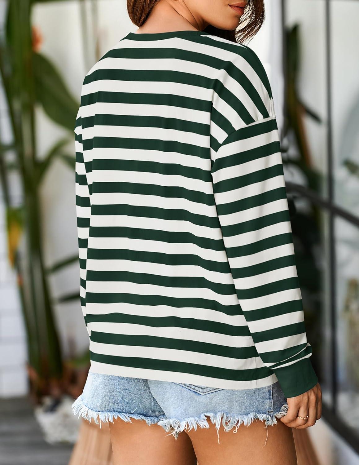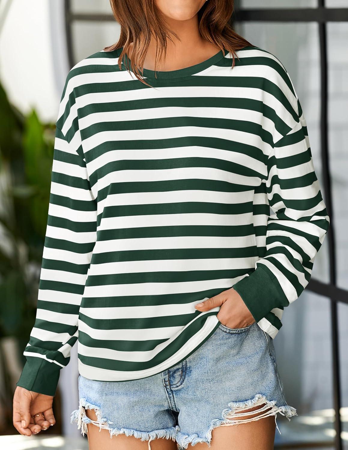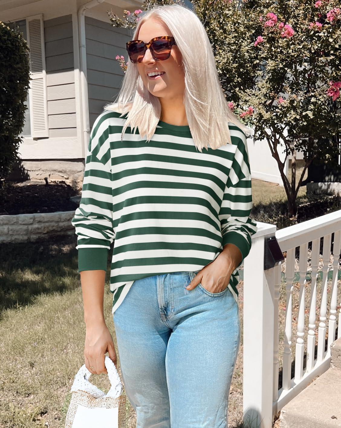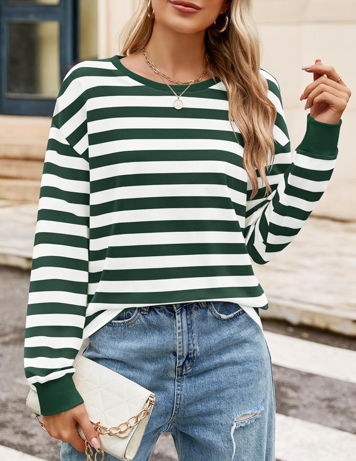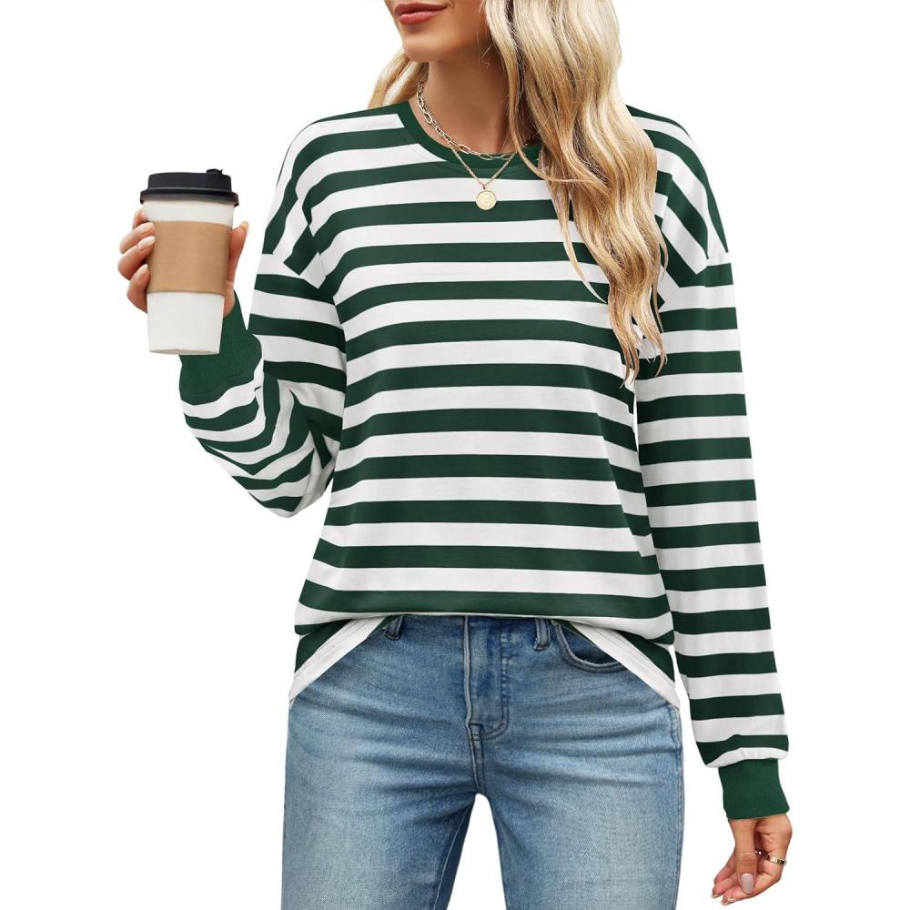 ZESICA Womens Long Sleeve Striped Shirts Fall Crewneck Casual Loose Fit Tunic Tops(Darkgreen)