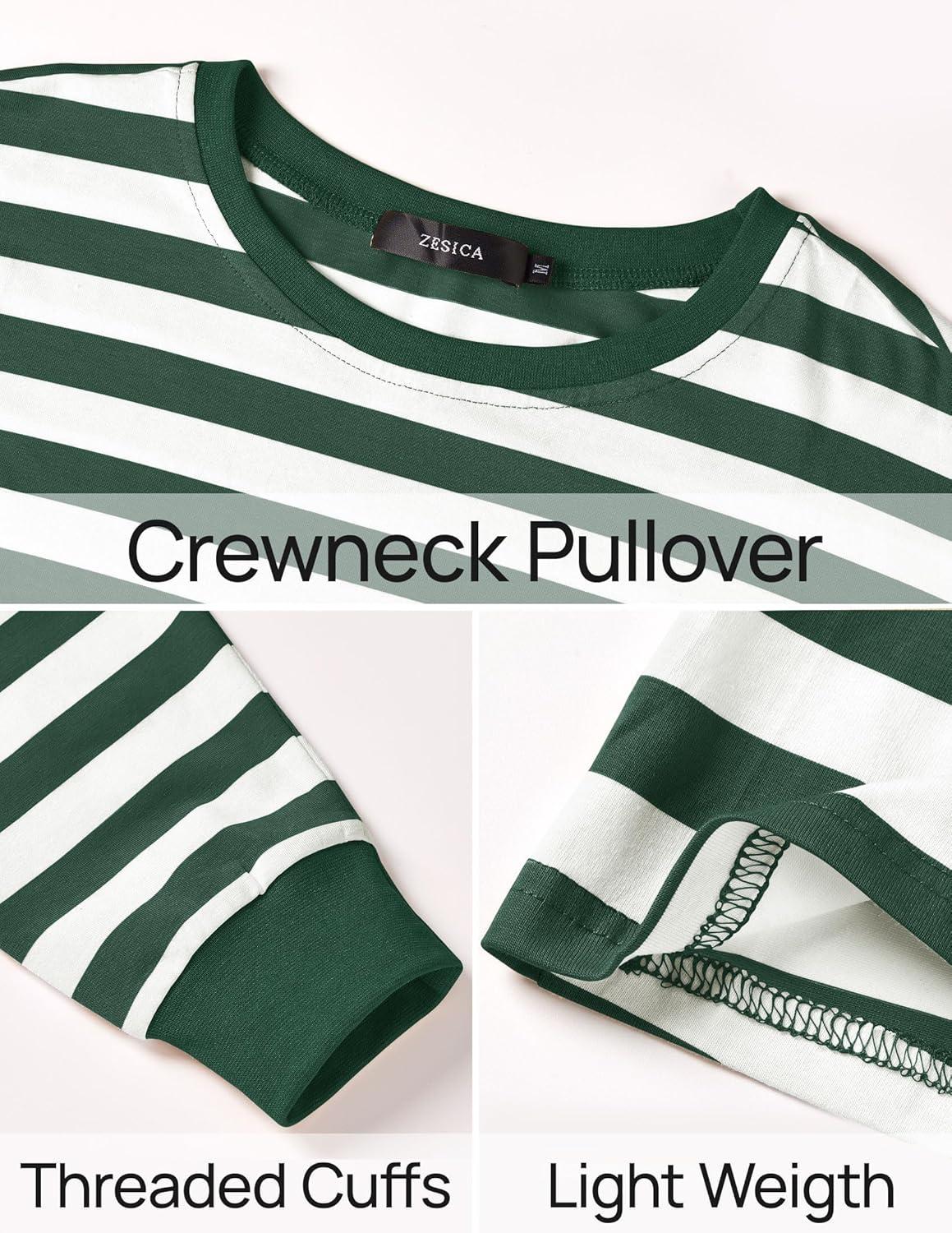 ZESICA Womens Long Sleeve Striped Shirts Fall Crewneck Casual Loose Fit Tunic Tops(Green)