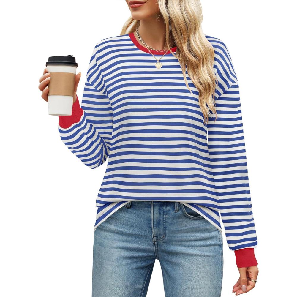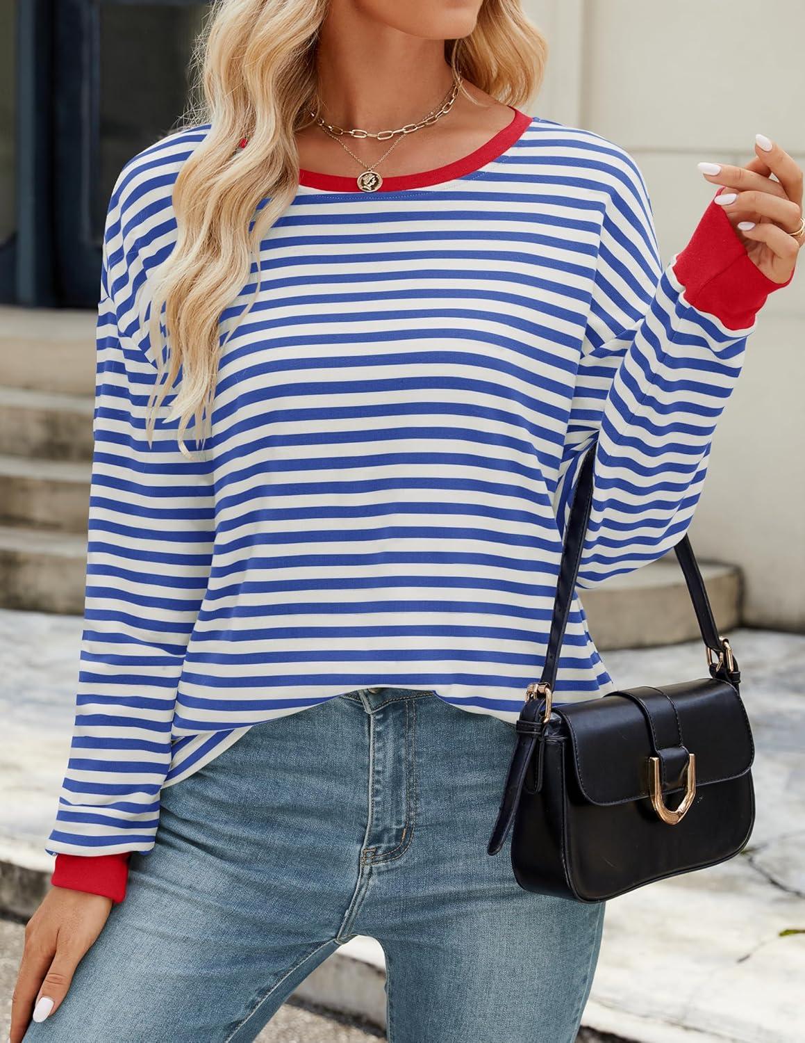 ZESICA Womens Long Sleeve Striped Shirts Fall Crewneck Casual Loose Fit Tunic Tops(Royalblue)