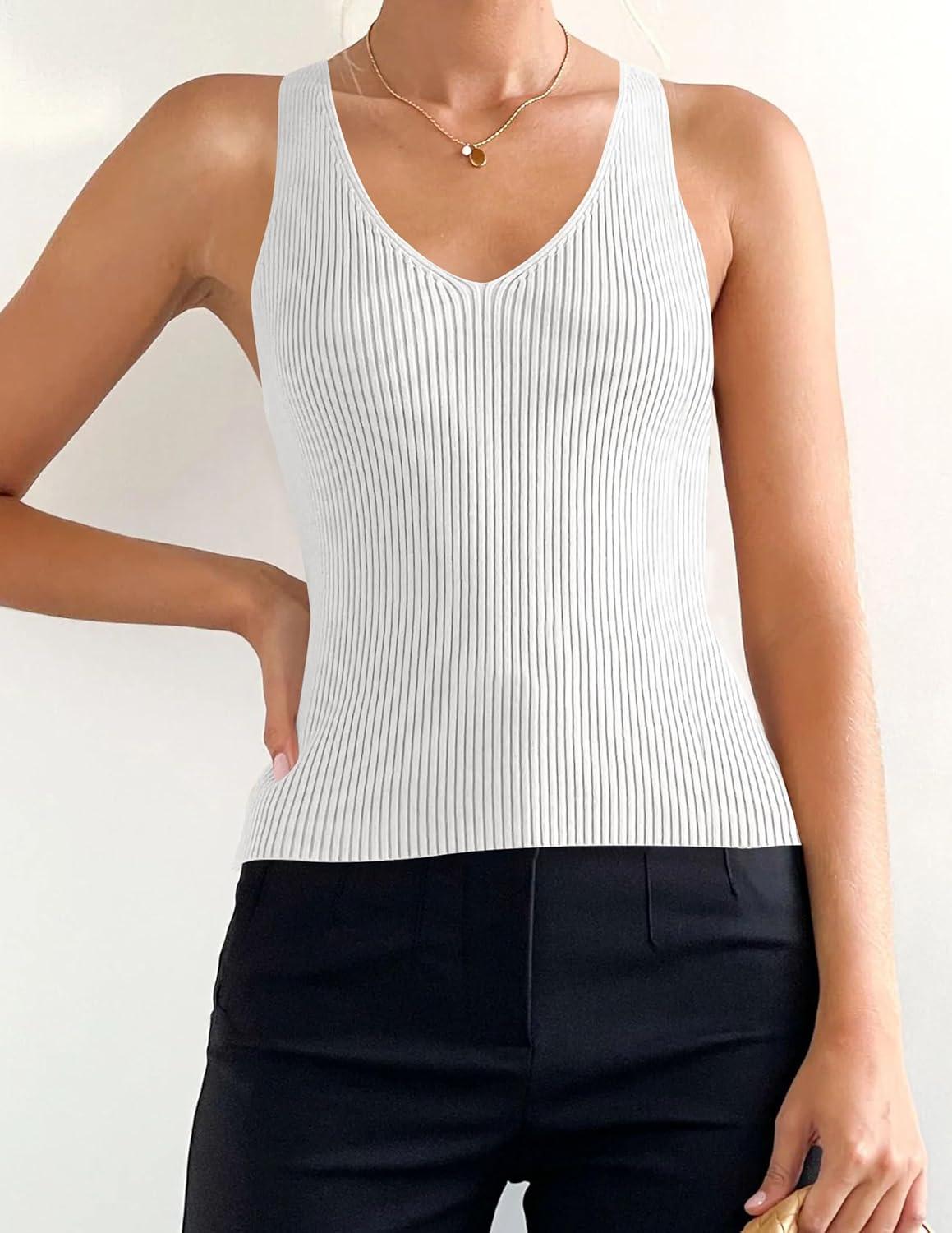 ZESICA Womens Ribbed Tank Tops Summer Sleeveless V Neck Shirts Casual Sexy Slim Fitted Basic Knit Tees(White)