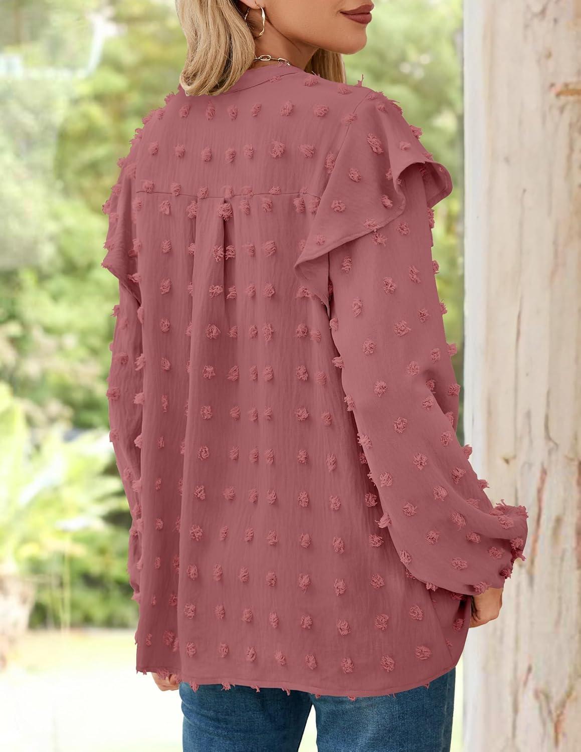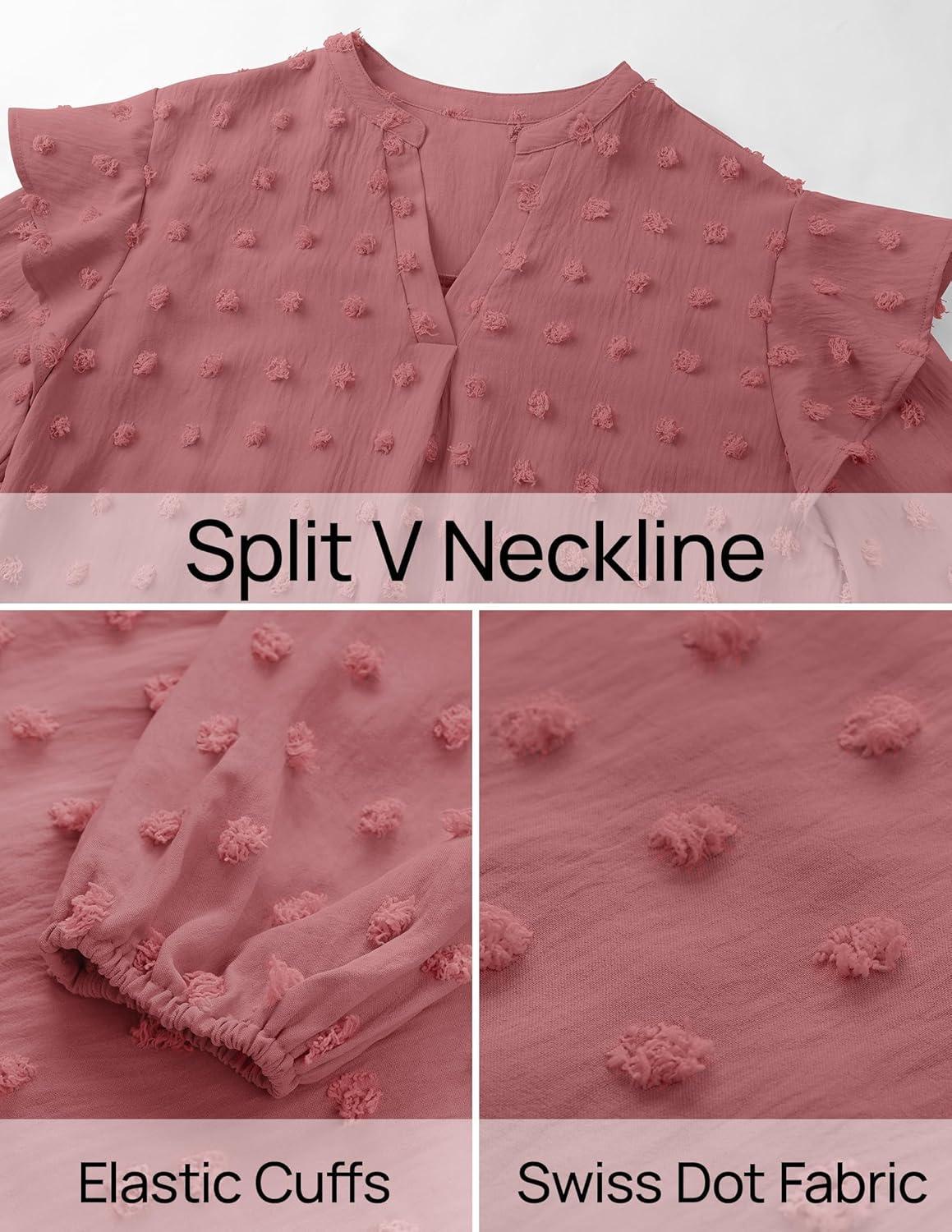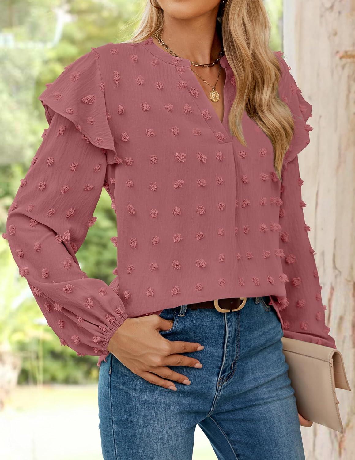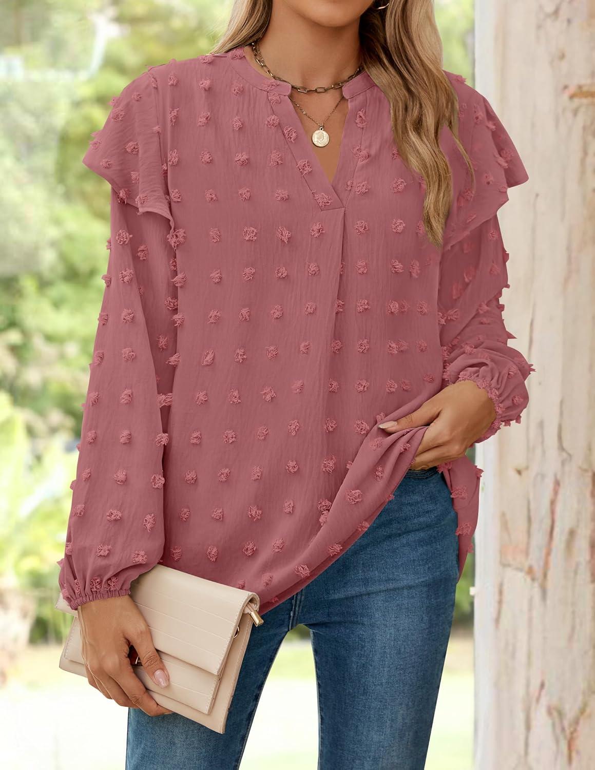 ZESICA Womens Ruffle Long Sleeve Chiffon Blouses V Neck Swiss Dot Fall Shirts Dressy Casual Tunic Tops(Rose Red)