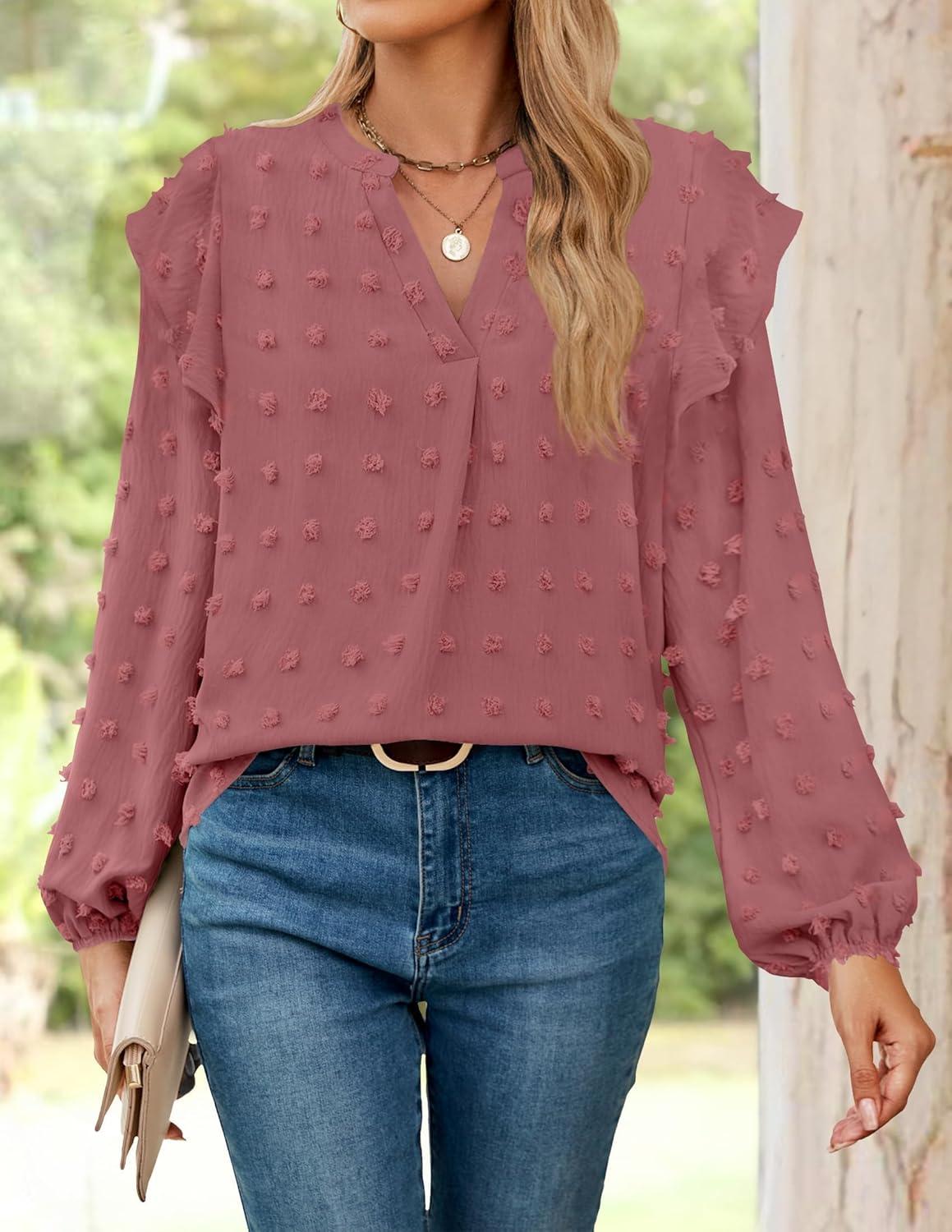 imageZESICA Womens Ruffle Long Sleeve Chiffon Blouses V Neck Swiss Dot Fall Shirts Dressy Casual Tunic TopsRose Red