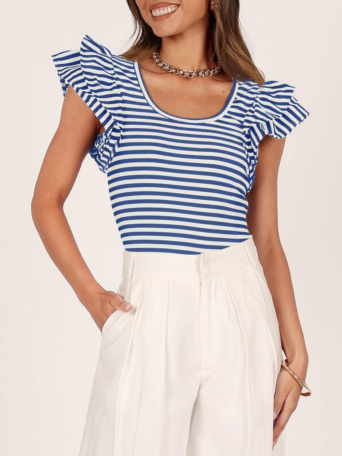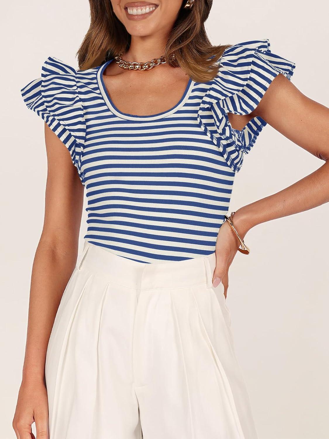 ZESICA Women's Ruffle Short Sleeve Striped T Shirts Summer Scoop Neck Slim Fitted Causal Basic Tee Tops(Blue)