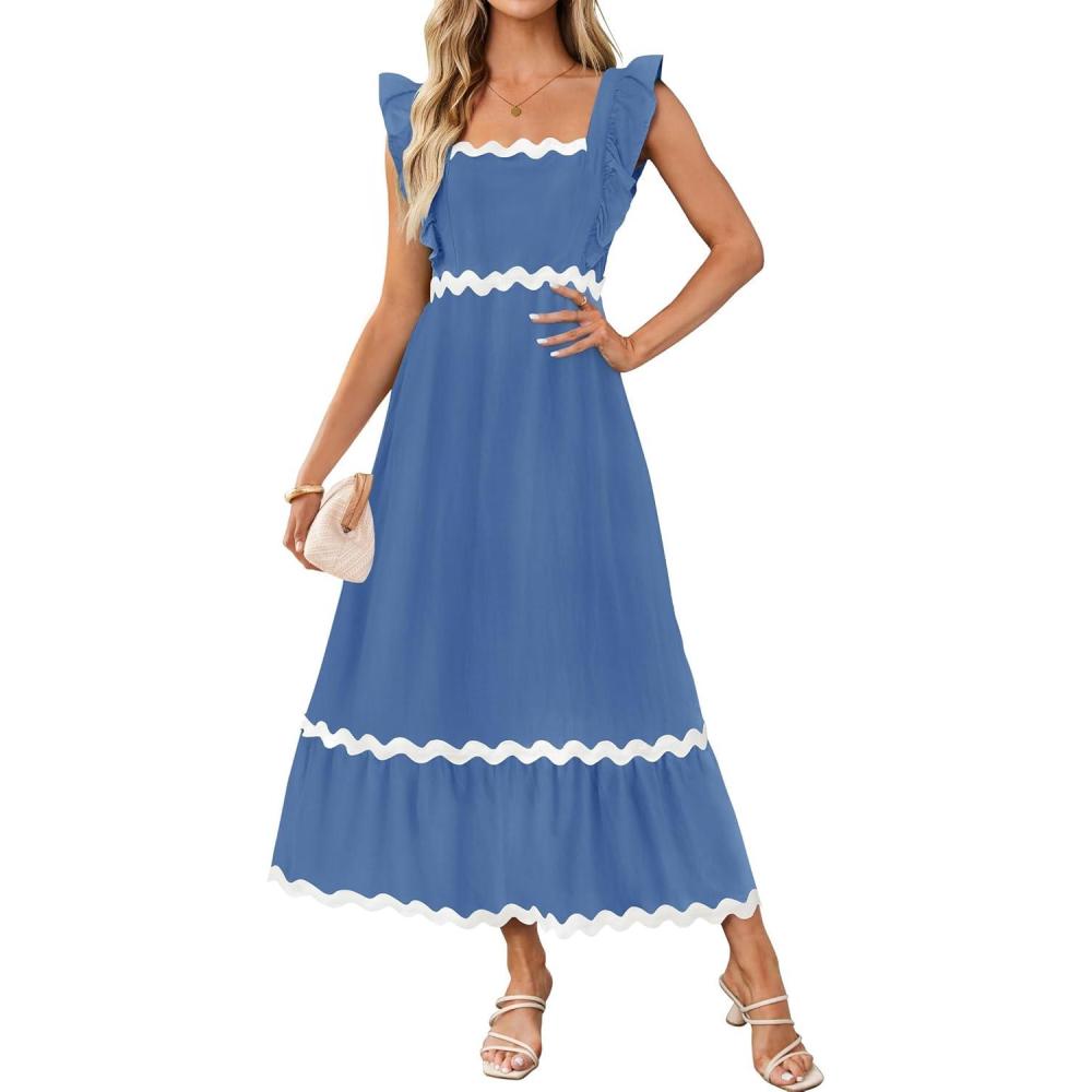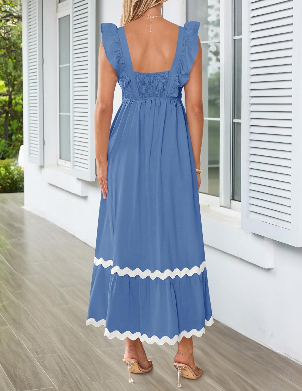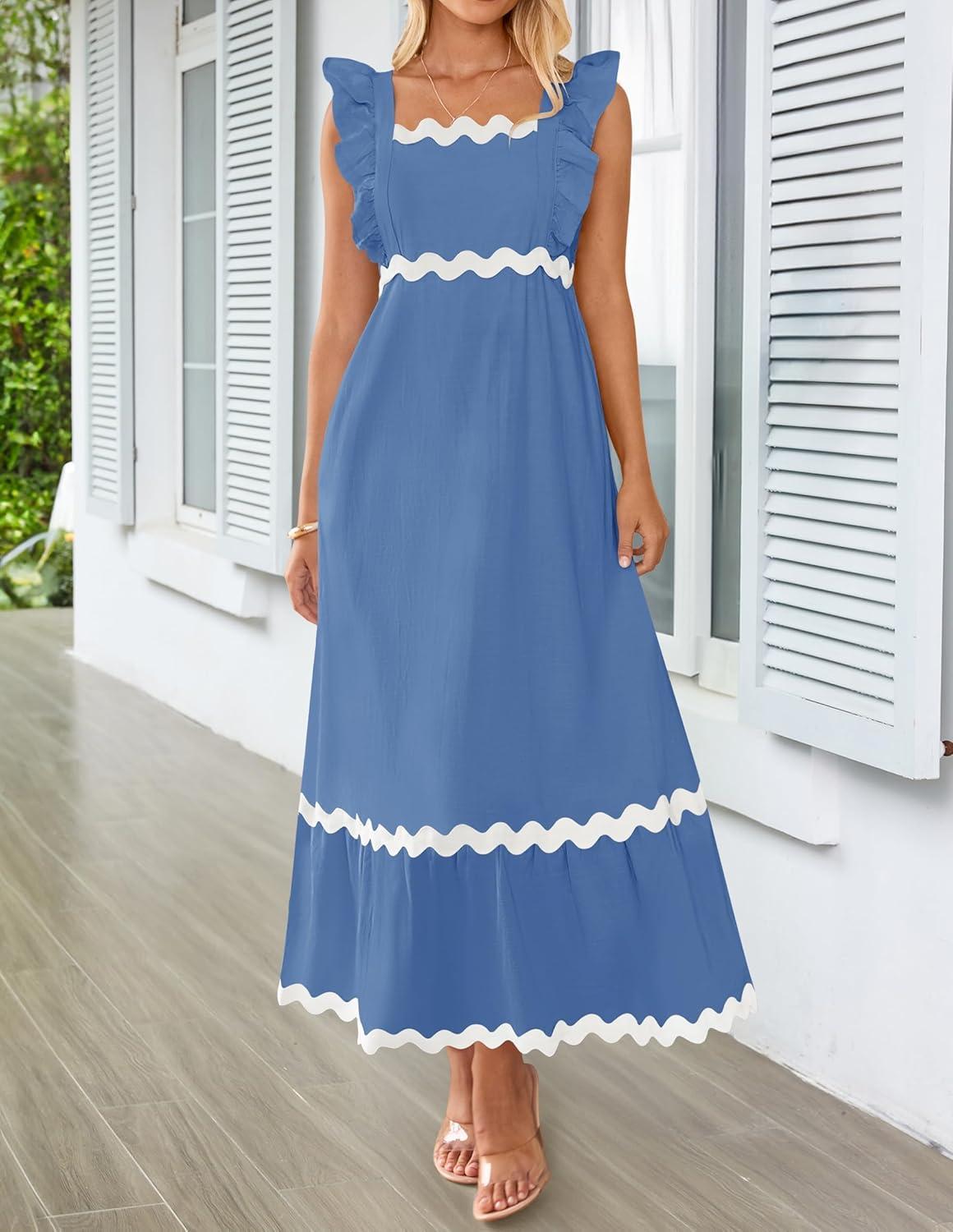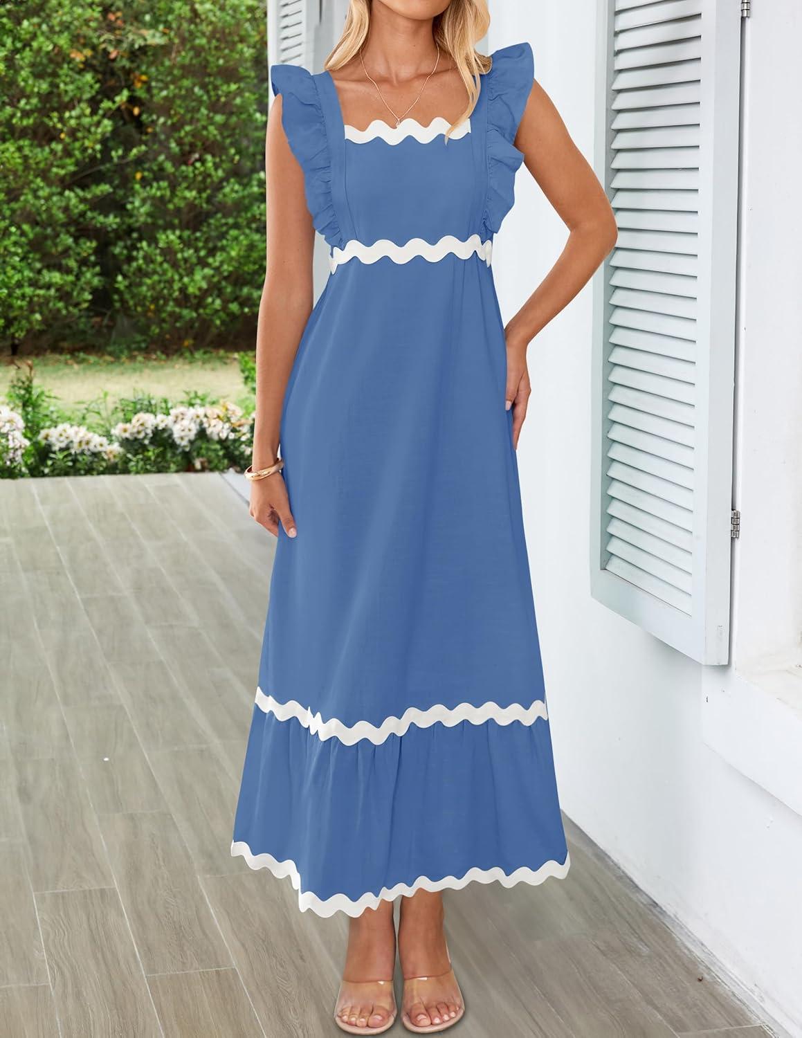 ZESICA Women’s Summer Sleeveless Ruffle Dresses Square Neck Backless Boho Flowy Maxi Sundress with Pockets(Blue)