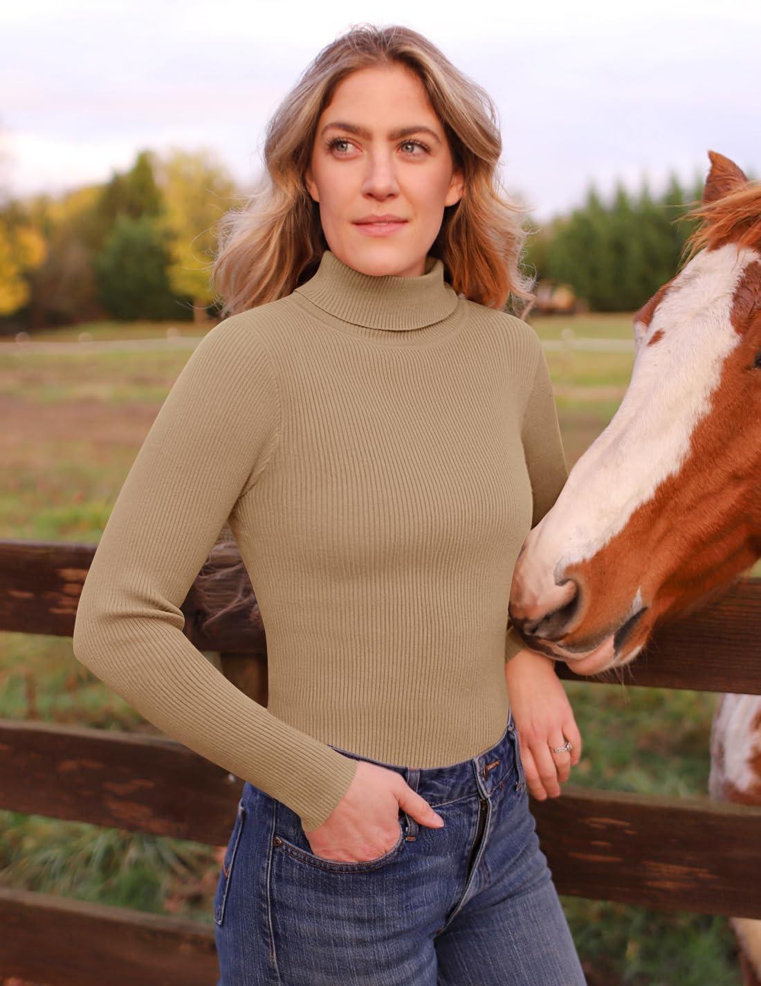 imageZESICA Womens Turtleneck Long Sleeve Shirts 2025 Fall Trendy Tops Slim Fitted Ribbed Knit Basic Casual SweaterToffee