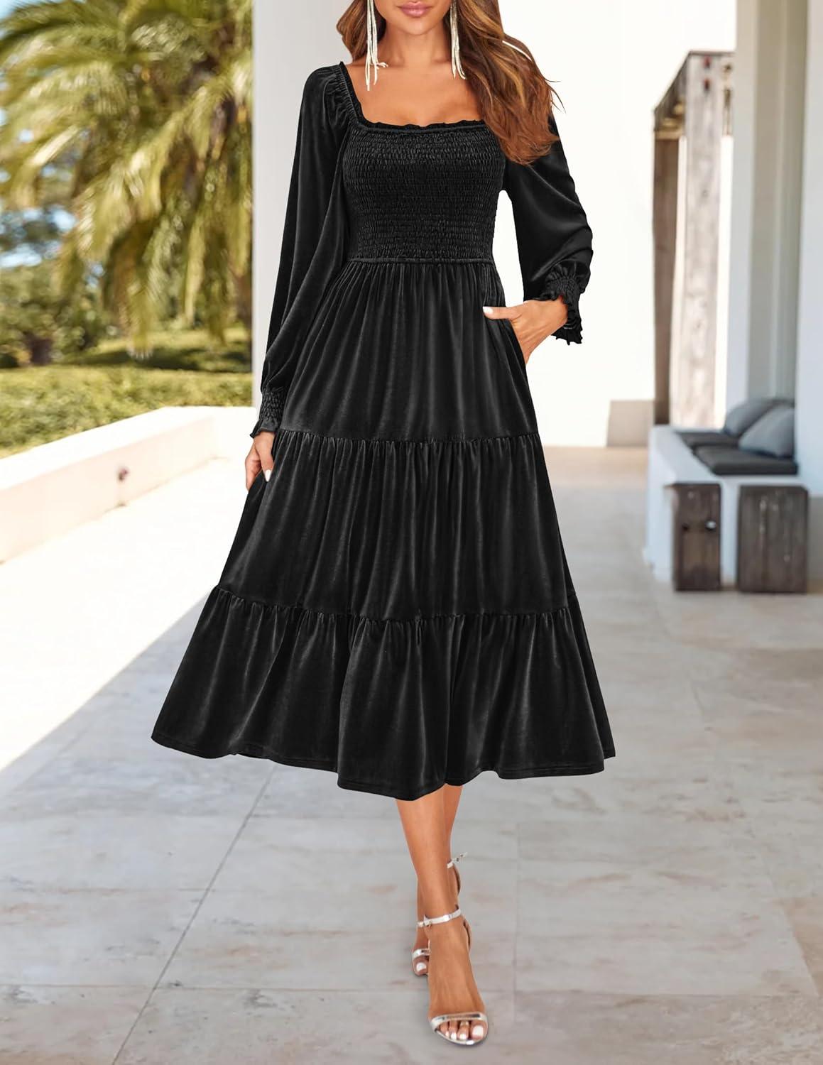 ZESICA Women’s Velvet Long Sleeve Dresses 2025 Fall Square Neck Smocked Ruffle A Line Flowy Midi Dress with Pockets(Black)
